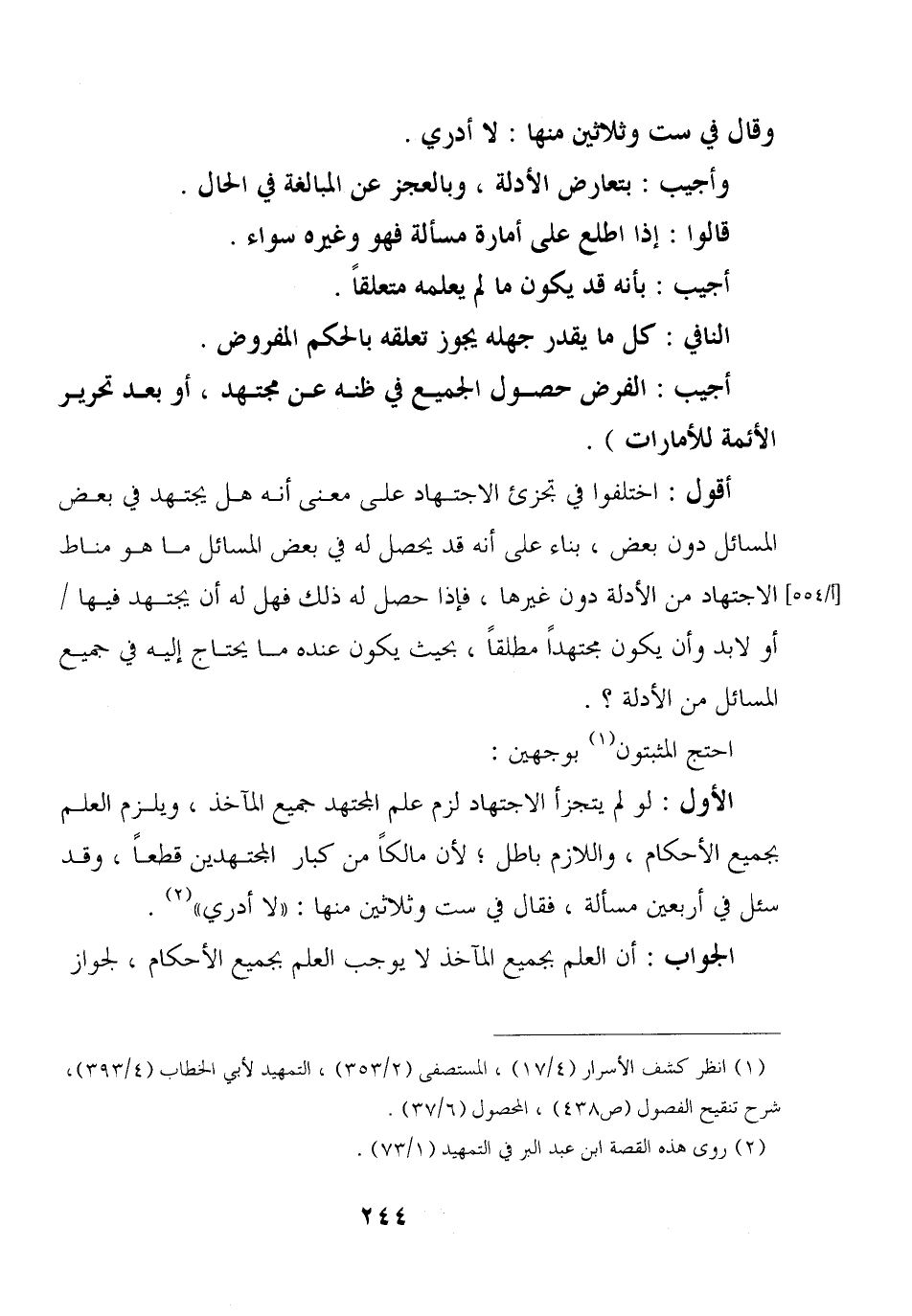 الأول: لو لم يتجزأ الاجتهاد لزم علم المجتهد جميع المآخذ، ويلزم العلم بجميع الأحكام، واللازم باطل؛ لأن مالكا من كبار المجتهدين قطعا، وقد سئل في أربعين مسألة، فقال في ست وثلاثين منها: "لا أدري".