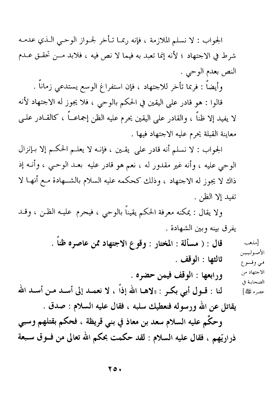 قالوا: هو قادر على اليقين في الحكم بالوحي، فلا يجوز له الاجتهاد لأنه لا يفيد إلا ظنا، والقادر على اليقين يحرم عليه الظن إجماعا، كالقادر على معاينة القبلة عليه الاجتهاد فيها.