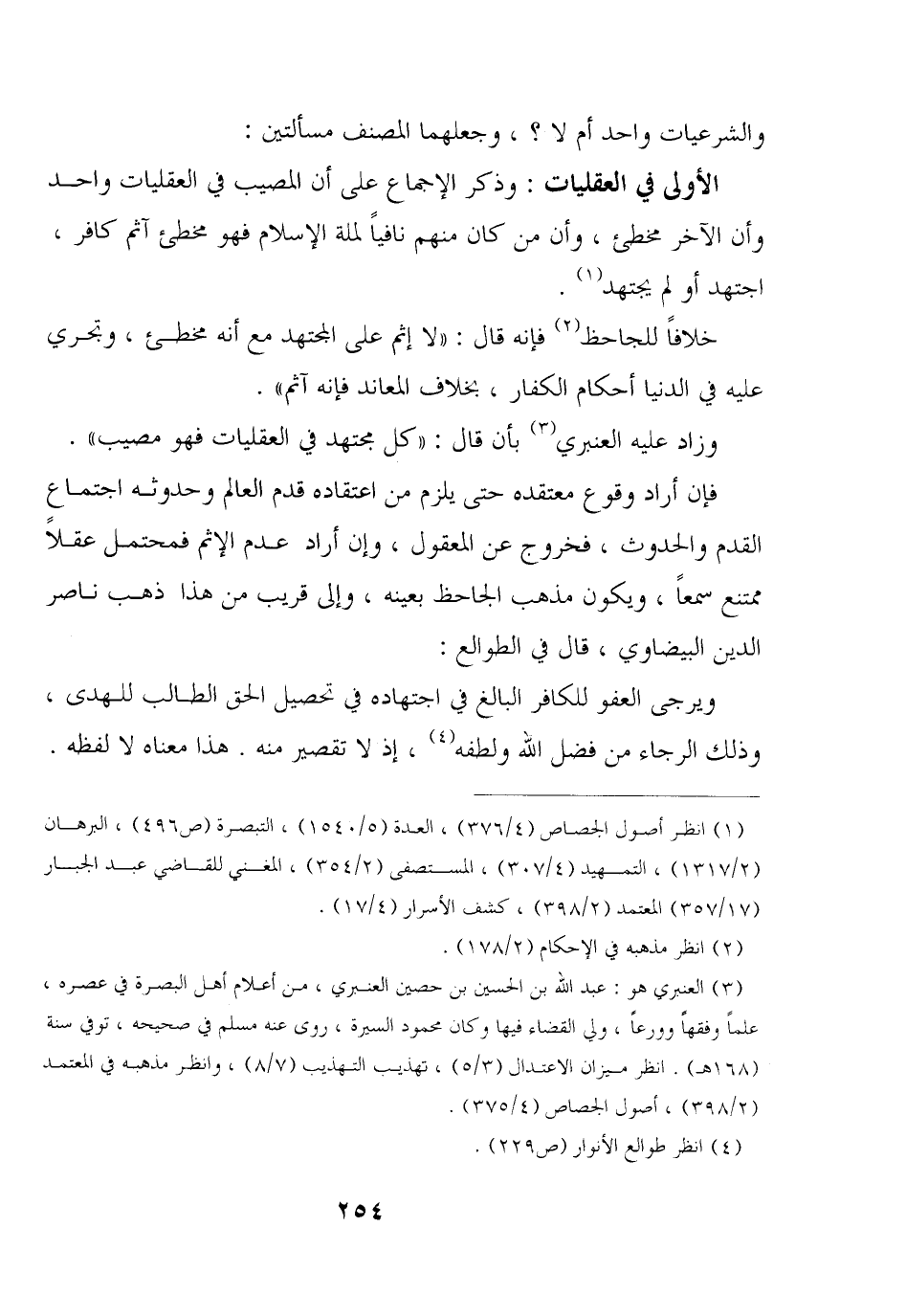 الأولى في العقليات: وذكر الإجماع على أن المصيب في العقليات واحد وأن الآخر مخطئ، وأن من كان منهم نافيا لملة الإسلام فهو مخطئ آثم كافر، اجتهد أو لم يجتهد.