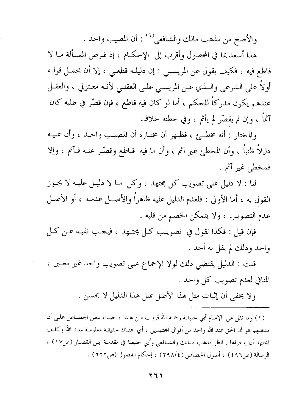 هذا أسعد بما في المحصول وأقرب إلى الإحكام، إذ فرض المسألة ما لا قاطع فيه، فكيف يقول عن المريسي: إن دليله قطعي، إلا أن يحمل قوله أولا على الشرعي والذي عن المريسبي على العقلي لأنه معتزلي، والعقل عندهم يكون مدركا للحكم، أما لو كان فيه قاطع، فإن قصر في طلبه كان آثما، وإن لم يقصر لم يأثم، وفي خطئه خلاف.