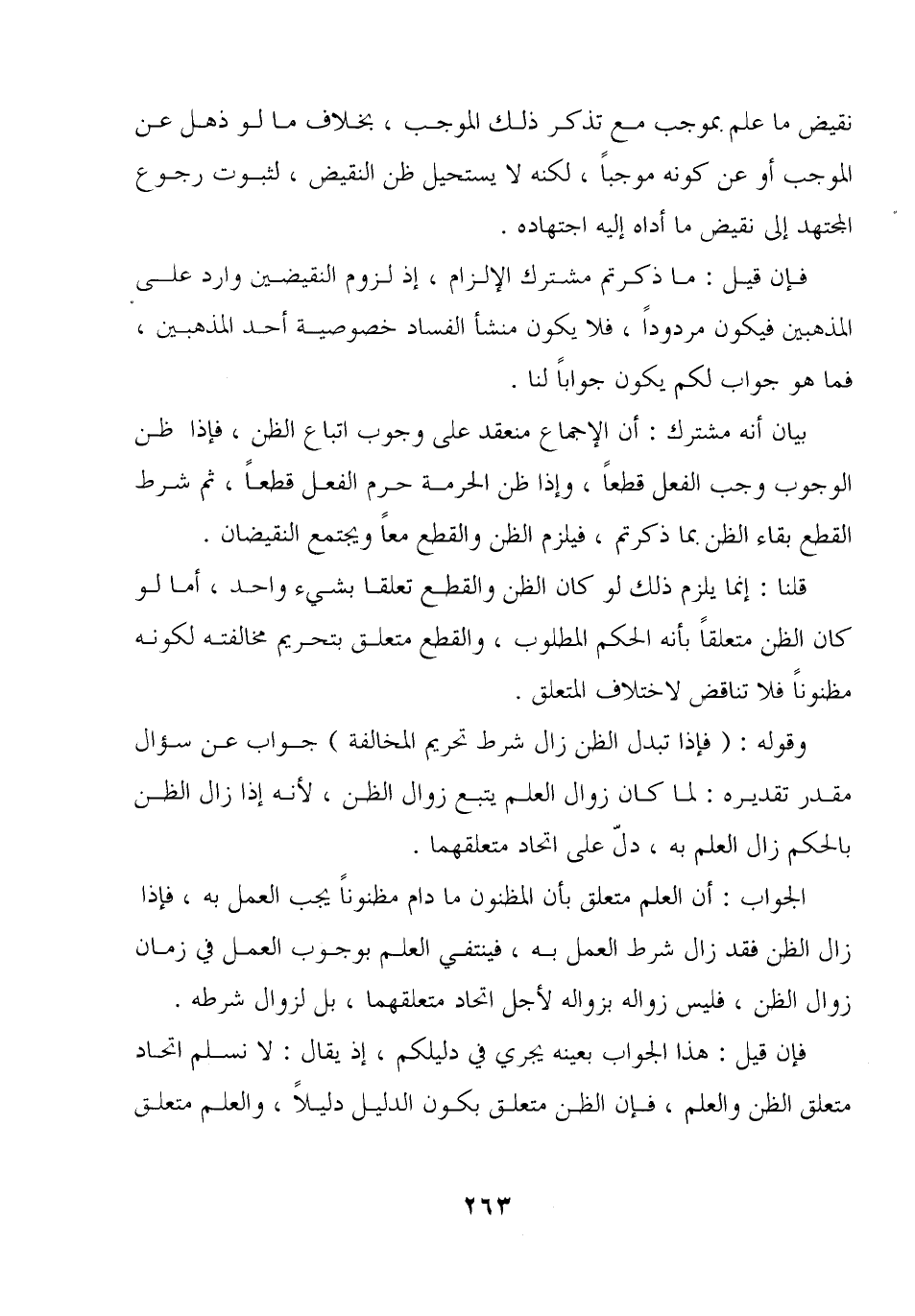قلنا: إنما يلزم ذلك لو كان الظن والقطع تعلقا بشيء واحد، أما لو كان الظن متعلقا بأن الحكم المطلوب، والقطع متعلق بتحريم مخالفته لكونه مظنونا فلا تناقض لاختلاف المتعلق.