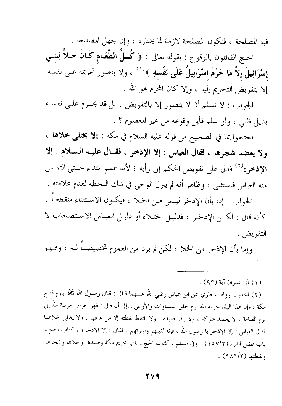 الجواب: إما بأن الإذخر ليس من الخلا، فيكون الاستثناء منقطعا، كأنه قال: لكن الإذخر، فدليل اختلاه أو دليل العباس الاستصحاب لا التفويض.