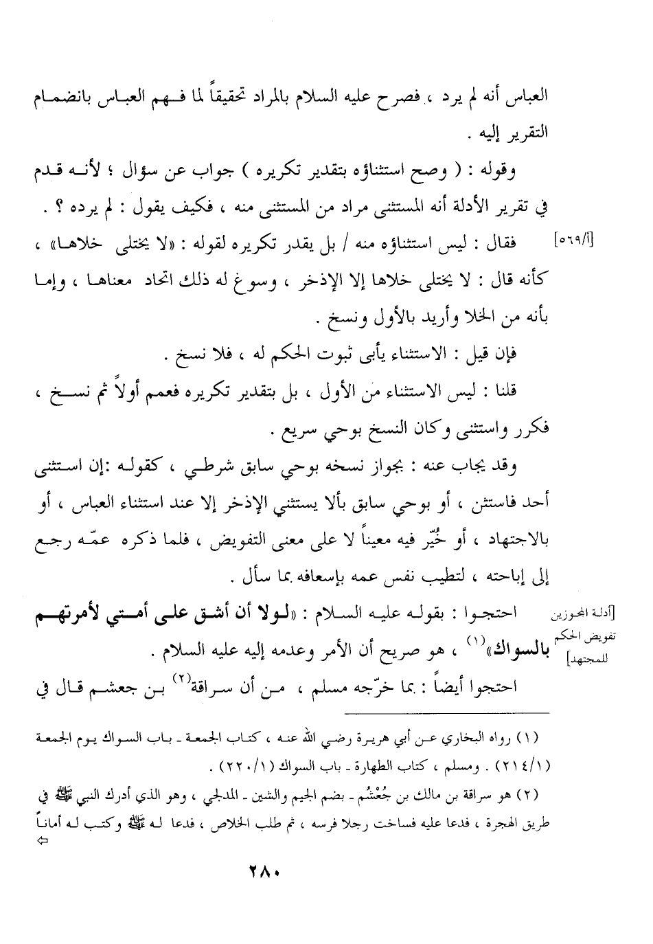 وقد يجاب عنه: بجواز نسخه بوحي سابق شرطي، كقوله: إن استثنى أحد فاستثن، أو بوحي سابق بألا يستثني الإذخر إلا عند استثناء العباس، أو بالاجتهاد، أو خير فيه معينا لا على معنى التفويض، فلما ذكره عمه رجع إلى إباحته، لتطيب نفس عمه بإسغافه بما سأل.