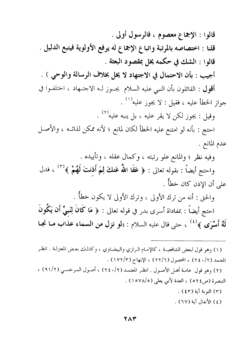 أقول: القائلون بأن النبي عليه السلام يجوز له الاجتهاد، اختلفوا في جواز الخطأ عليه، فقيل: لا يجوز عليه.
