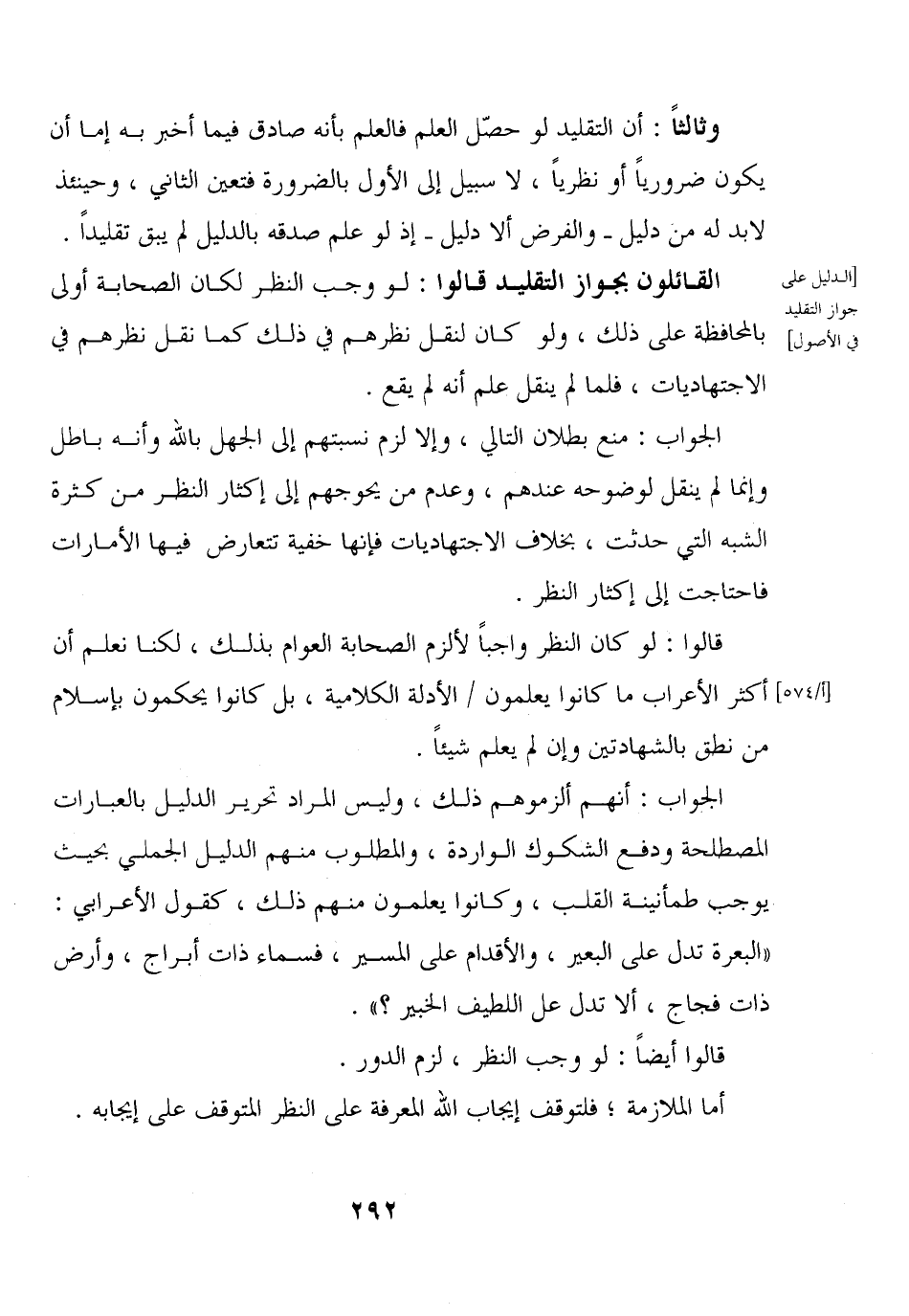 القائلون بجواز التقليد قالوا: لو وجب النظر لكان الصحابة أولى بالمحافظة على ذلك، ولو كان لنقل نظرهم في ذلك كما نقل نظرهم في الاجتهادات، فلما لم ينقل علم أنه لم يقع.