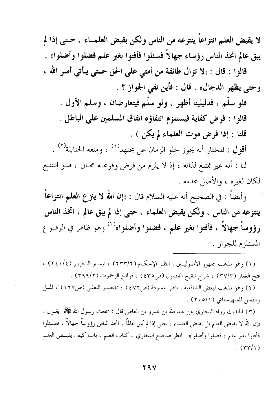وأيضا: في الصحيح أنه عليه السلام قال: "إن الله لا ينزع العلم انتزاعا ينتزعه من الناس، ولكن يقبض العلماء، حتى إذا لم يبق عالم، اتخذ الناس رؤوسا جهالا، فأفتوا بغير علم، فضلوا وأضلوا" وهو ظاهر في الوقوع المستلزم للجواز.