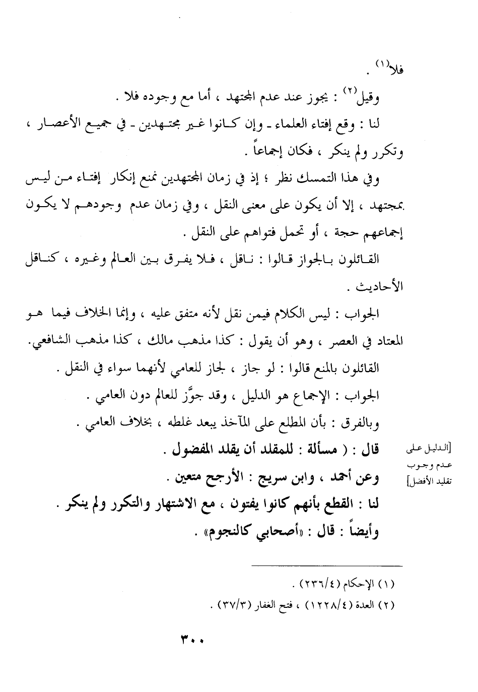 وفي هذا التمسك نظر؛ إذ في زمان المجتهدين نمنع إنكار إفتاء من ليس بمجتهد، إلا أن يكون على معنى النقل، وفي زمان عدم وجودهم لا يكون إجماعهم حجة، أو تحمل فتواهم على النقل.