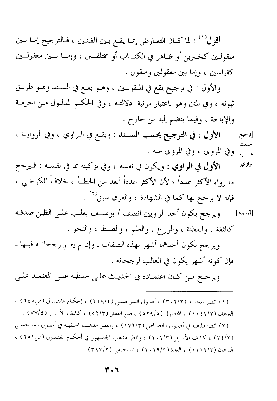 والأول: في ترجيح يقع في المنقولين، وهو يقع في السند وهو طريق ثبوته، وفي المتن وهو باعتبار مرتبة دلالته، وفي الحكم المدلول من الحرمة والإباحة، وفيما ينضم إليه من خارج.