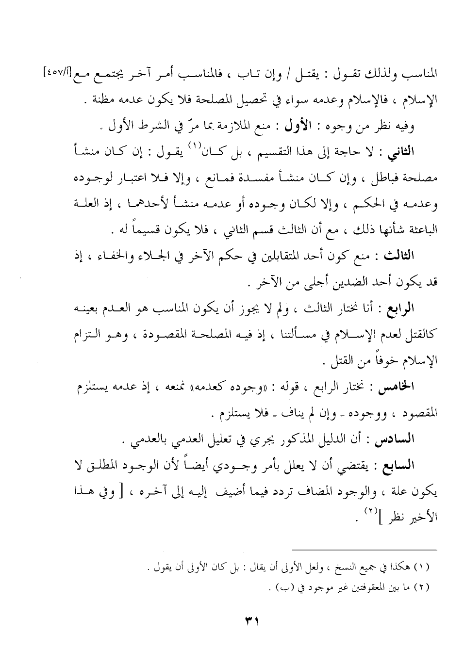 السابع: يقتضي أن لا يعلل بأمر وجودي أيضا لأن الوجود المطلق لا يكون علة، والوجود المضاف تردد فيما أضيف إليه إلى آخره، [وفي هذا الأخير نظر].
