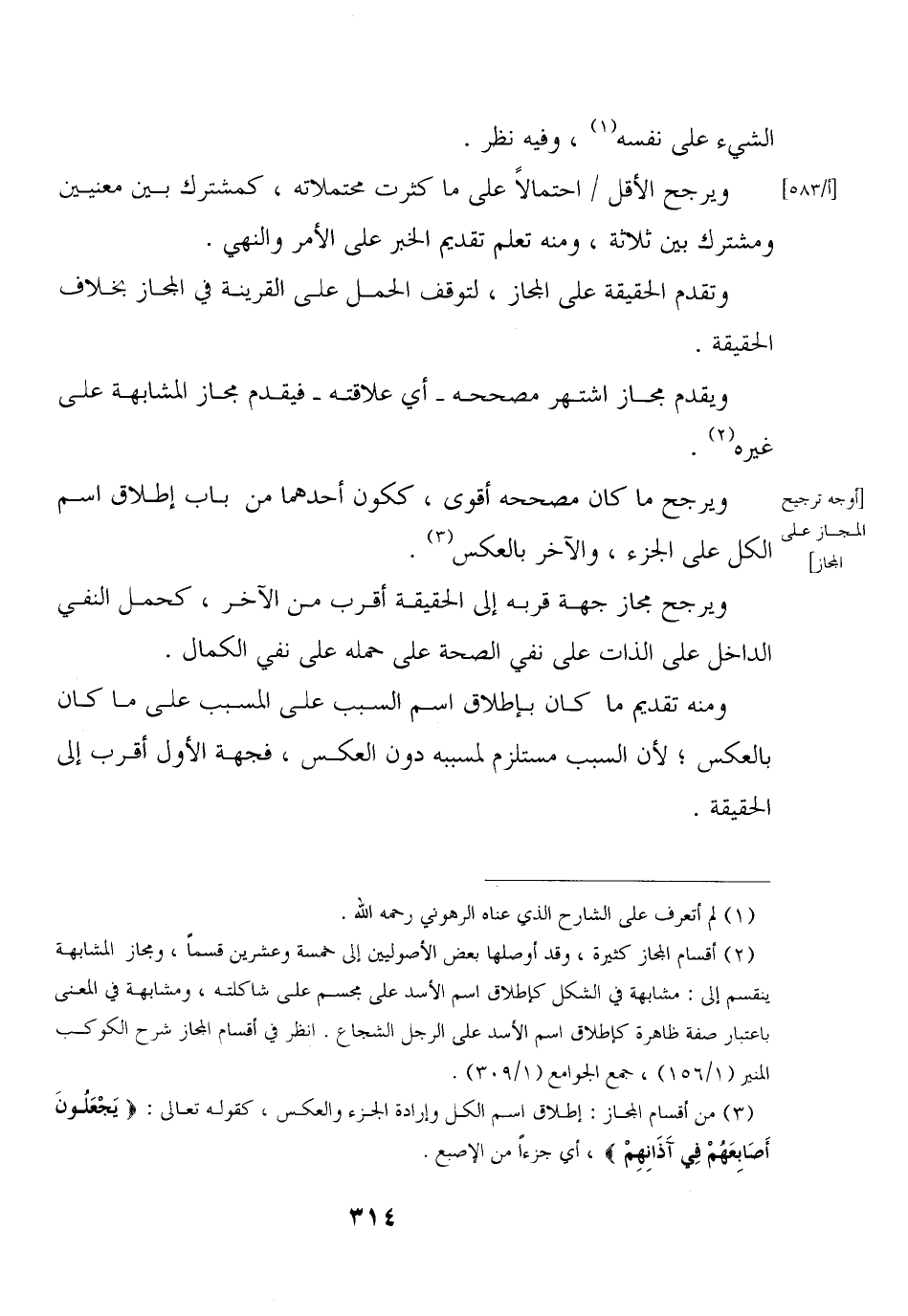 ويرجح الأقل/ احتمالا على ما كثرت محتملاته، كمشترك بين معنيين ومشترك بين ثلاثة، ومنه تقديم الخبر على الأمر والنهي.