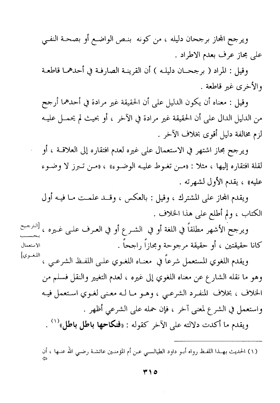 ويقدم اللغوي المستعمل شرعا في معناه اللغوي على اللفظ الشرعي، وهو ما نقله الشارع عن معناه اللغوي إلى غيره، لعدم التغيير والنقل فسلم من الخلاف، بخلاف المنفرد الشرعي، وهو ما له معنى لغوي استعمل فيه واستعمل في الشرع لمعنى آخر، فإن حمله على الشرعي أظهر.