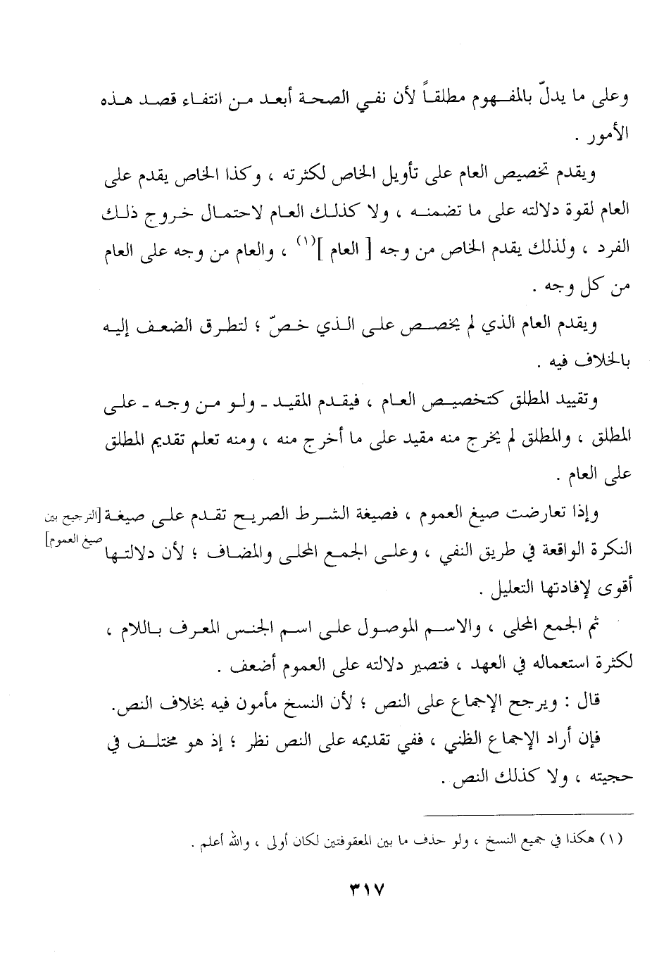 وإذا تعارضت صيغ العموم، فصيغة الشرط الصريح تقدم على صيغة النكرة الواقعة في طريق النفي، وعلى الجمع المحلي والمضاف؛ لأن دلالتها أقوى لإفادتها التعليل.