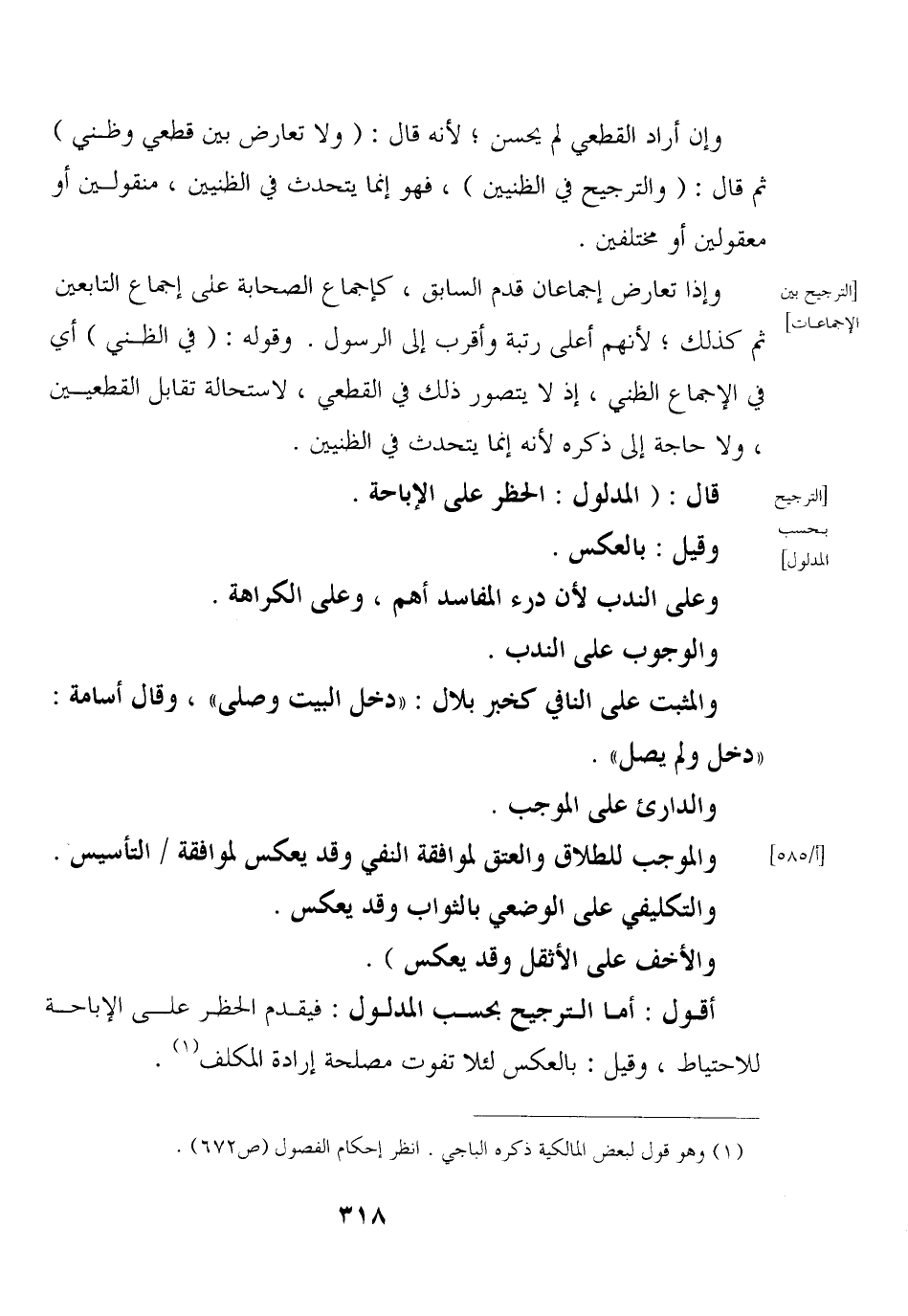 أقول: أما الترجيح بحسب المدلول: فيقدم الحظر على الإباحة للاحتياط، وقيل: بالعكس لئلا تفوت مصلحة إرادة المكلف.