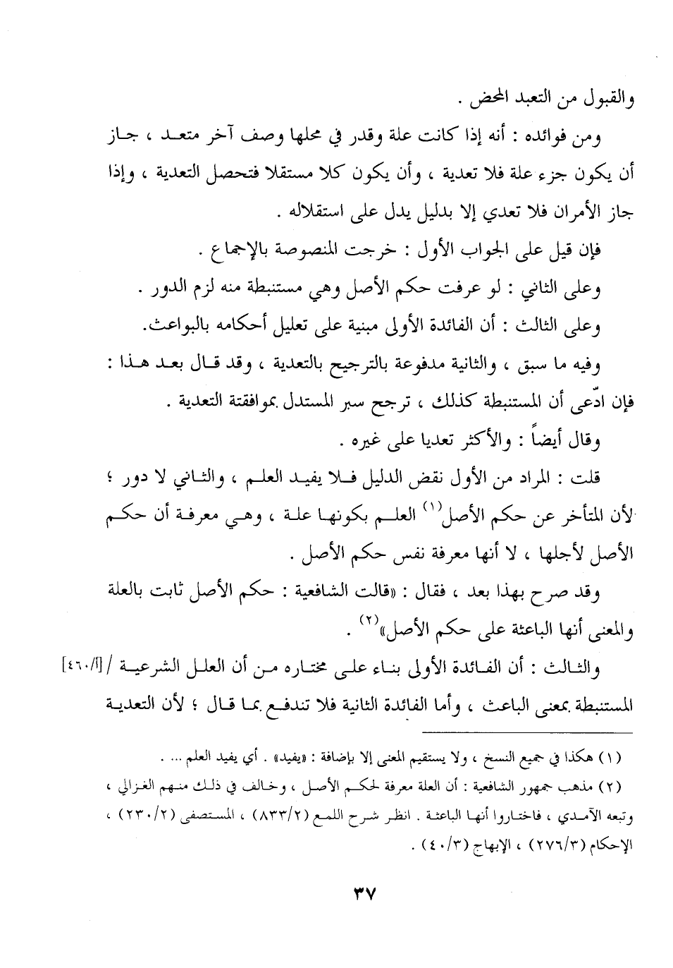 قلت: المراد من الأول نقض الدليل فلا يفيد العلم، والثاني لا دور؛ لأن المتأخر على حكم الأصل العلم بكونها علة، وهي معرفة أن حكم الأصل لأجلها، لا أنها معرفة نفس حكم الأصل.
