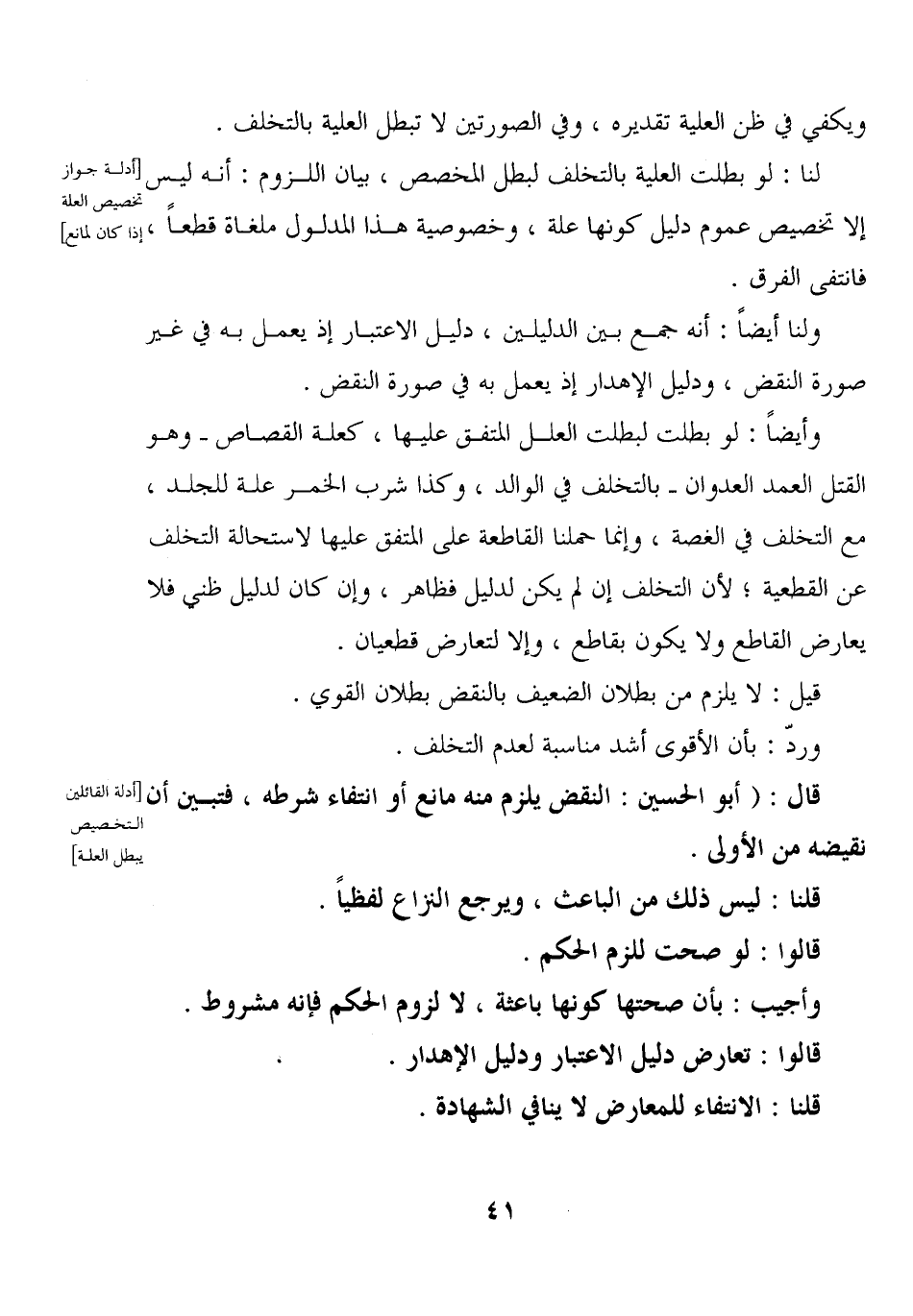وأيضا: لو بطلت لبطلت العلل المتفق عليها، كعلة القصاص –وهو القتل العمد العدوان- بالتخلف في الوالد، وكذا شرب الخمر علة للجلد، مع التخلف في الغصة، وإنما حملنا القاطعة على المتفق عليها لاستحالة التخلف عن القطعية؛ لأن التخلف إن لم يكن لدليل فظاهر، وإن كان لدليل ظني فلا يعارض القاطع ولا يكون بقاطع، وإلا لتعارض قطعيان.