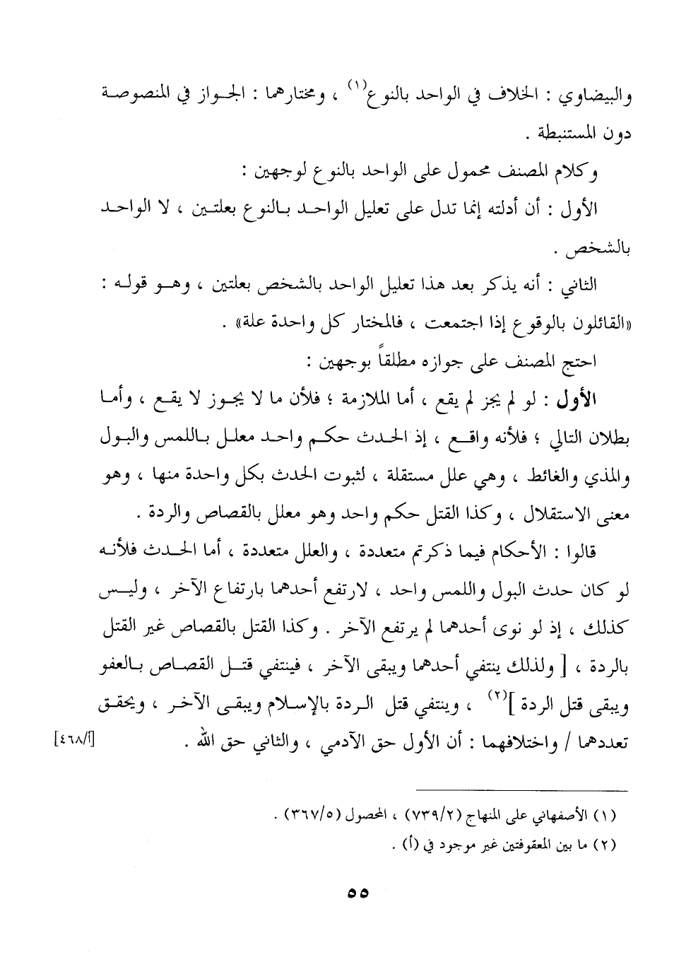 قالوا: الأحكام فيما ذكرتم متعددة، والعلل متعددة، أما الحدث فلأنه لو كان حدث البول واللمس واحد، لارتفع أحدهما بارتفاع الآخر، وليس كذلك، إذ لو نوى أحدهما لم يرتفع الآخر. وكذا القتل بالقصاص غير القتل بالردة، [ولذلك ينتفي أحدهما ويبقى الآخر، فينتفي قتال القصاص بالعفو ويبقى قتل الردة]، وينتفي قتل الردة بالإسلام ويبقى الآخر، ويحقق تعددهما/ واختلافهما: أن الأول حق الآدمي، والثاني حق الله.