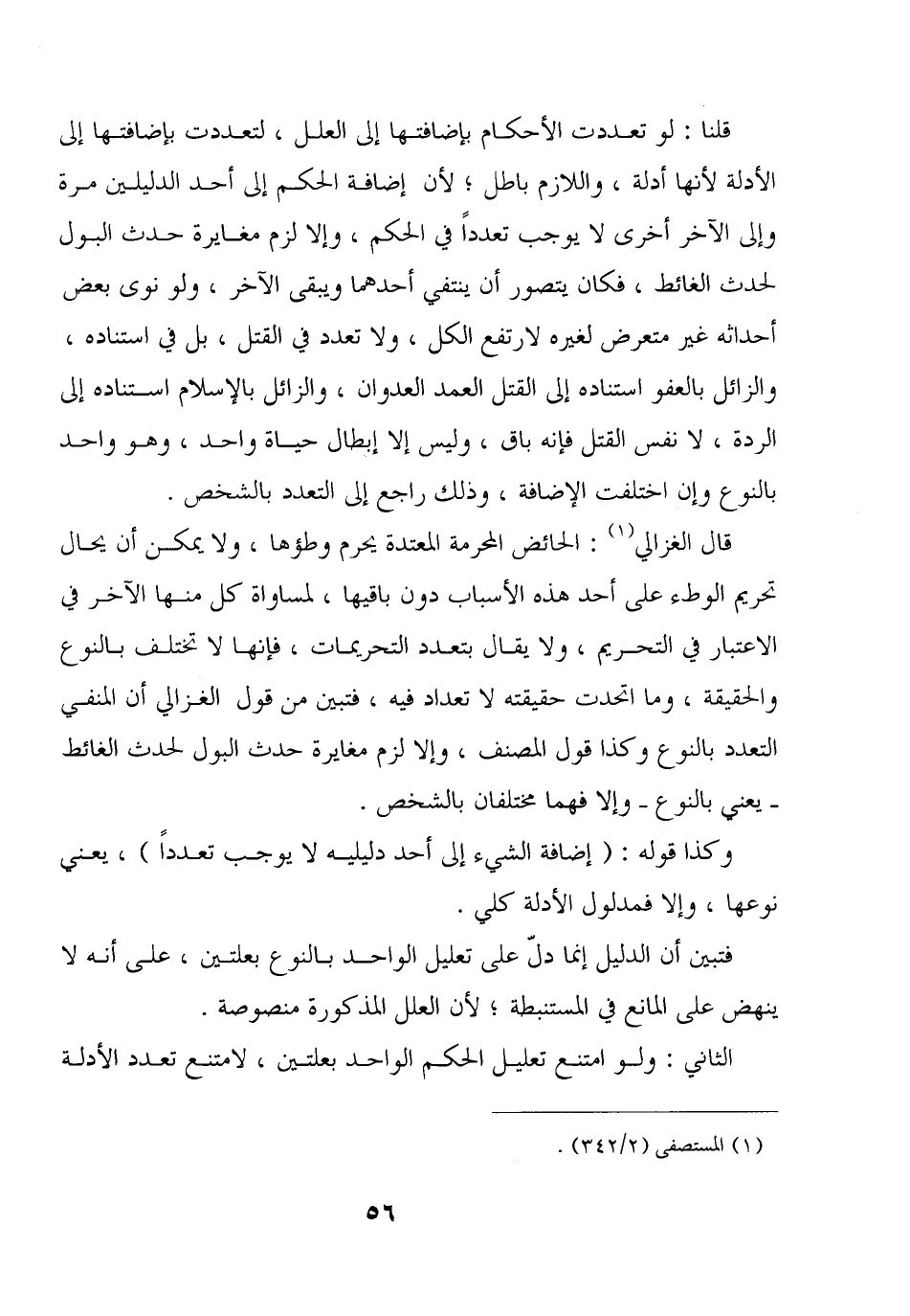 قلنا: لو تعددت الأحكام بإضافتها إلى العلل، لتعددت بإضافتها إلى الأدلة لأنها أدلة، واللازم باطل؛ لأن إضافة الحكم إلى أحد الدليلين مرة وإلى الآخر أخرى لا يوجب تعددا في الحكم، وإلا لزم مغايرة حدث البول لحدث الغائط، فكان يتصور أن ينتفي أحدهما ويبقى الآخر، ولو نوى بعض أحداثه غير متعرض لغيره لارتفع الكل، ولا تعدد في القتل، بل في استناده، والزائل بالعفو استناده إلى القتل العمد العدوان، والزائل بالإسلام استناده إلى الردة، لا نفس القتل فإنه باق، وليس إلا إبطال حياة واحد، وهو واحد بالنوع وإن اختلفت الإضافة، وذلك راجع إلى التعدد بالشخص.