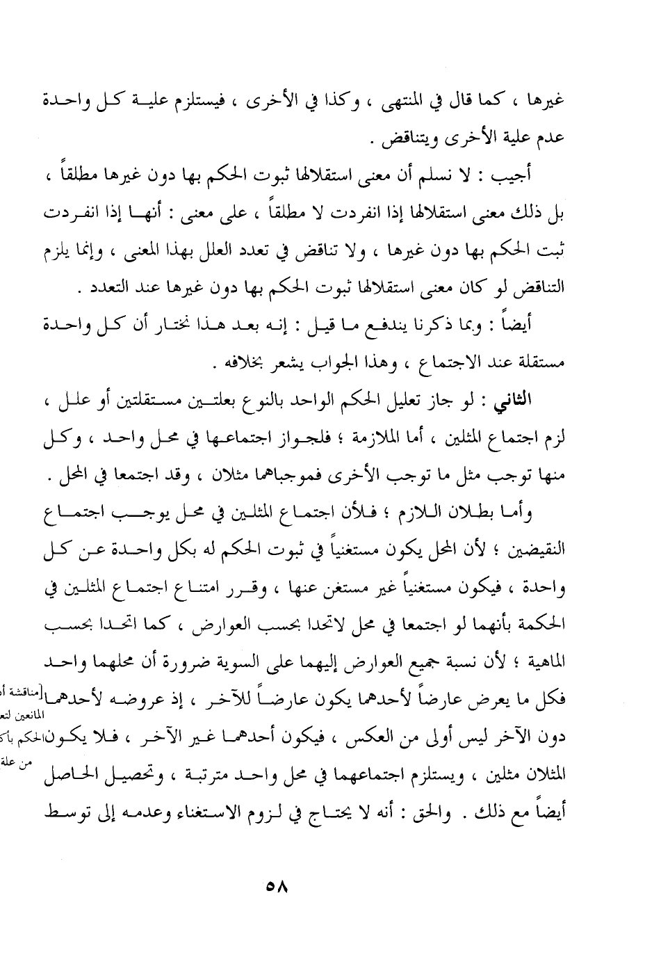 الثاني: لو جاز تعليل الحكم الواحد بالنوع بعلتين مستقلتين أو علل، لزم اجتماع المثلثين، أما الملازمة؛ فلجواز اجتماعها في محل واحد، وكل منها توجب مثل ما توجب الأخرى فموجباهما مثلان، وقد اجتمعا في المحل.