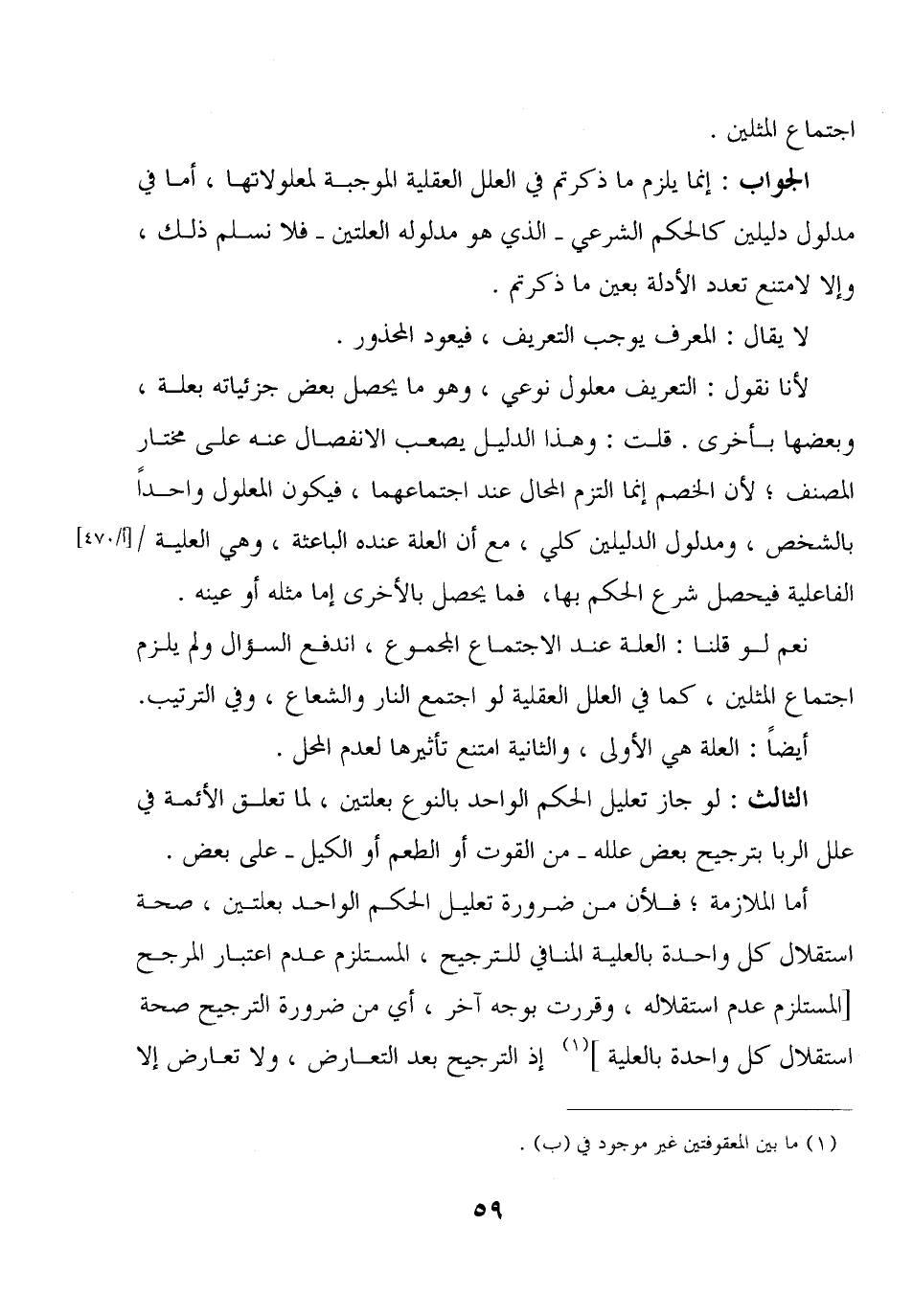 الجواب: إنما يلزم ما ذكرتم في العلل العقلية الموجبة لمعلولاتها، أما في مدلول دليلين كالحكم الشرعي –الذي هو مدلوله العلتين- فلا نسلم ذلك، وإلا لامتنع تعدد الأدلة بعين ما ذكرتم.
