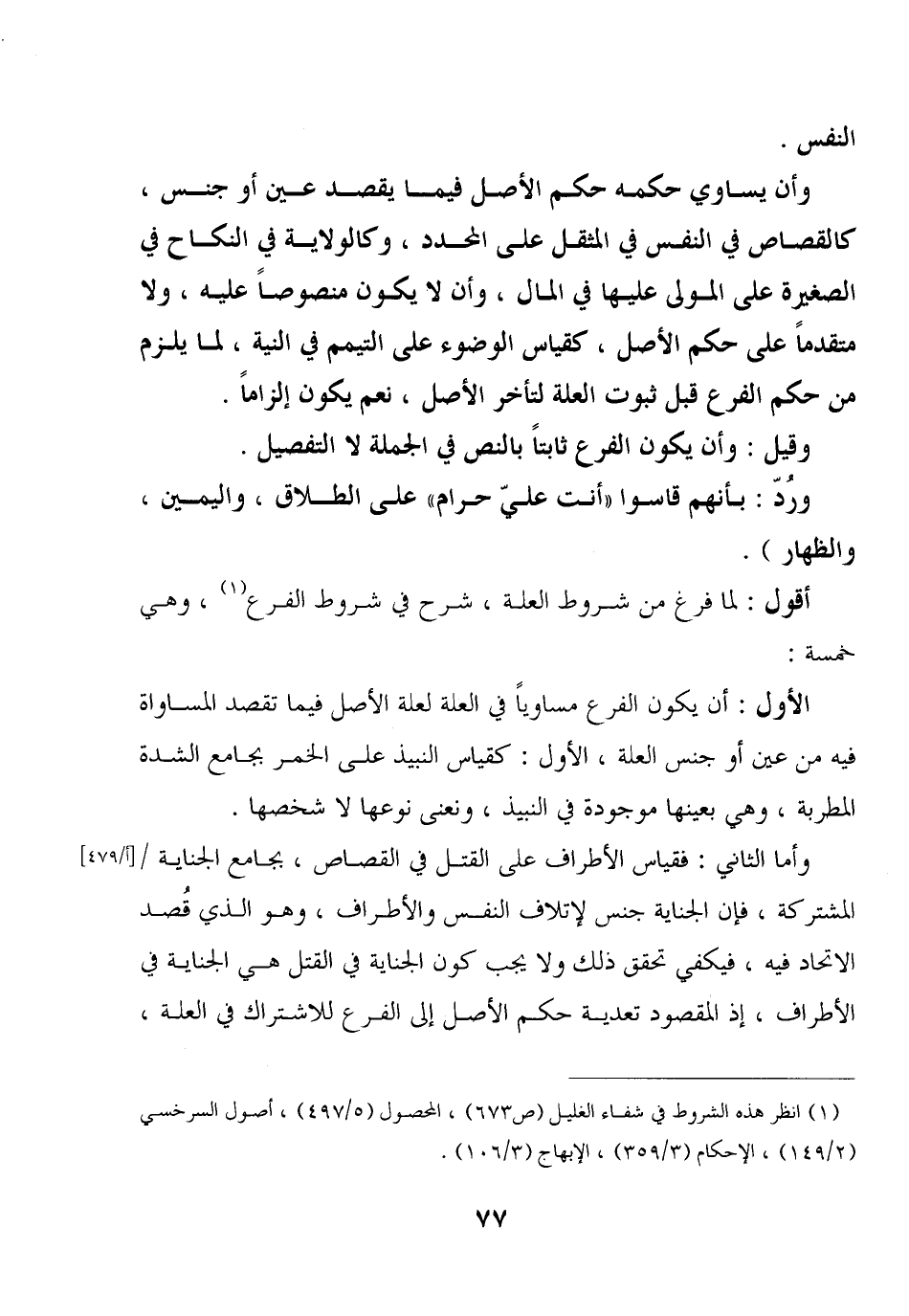 الأول: أن يكون الفرع مساويا في العلة لعلة الأصل فيما تقصد المساواة فيه من عين أو جنس العلة، الأول: كقياس النبيذ على الخمر بجامع الشدة المطربة، وهي بعينها موجودة في النبيذ، ونعنى نوعها لا شخصها.