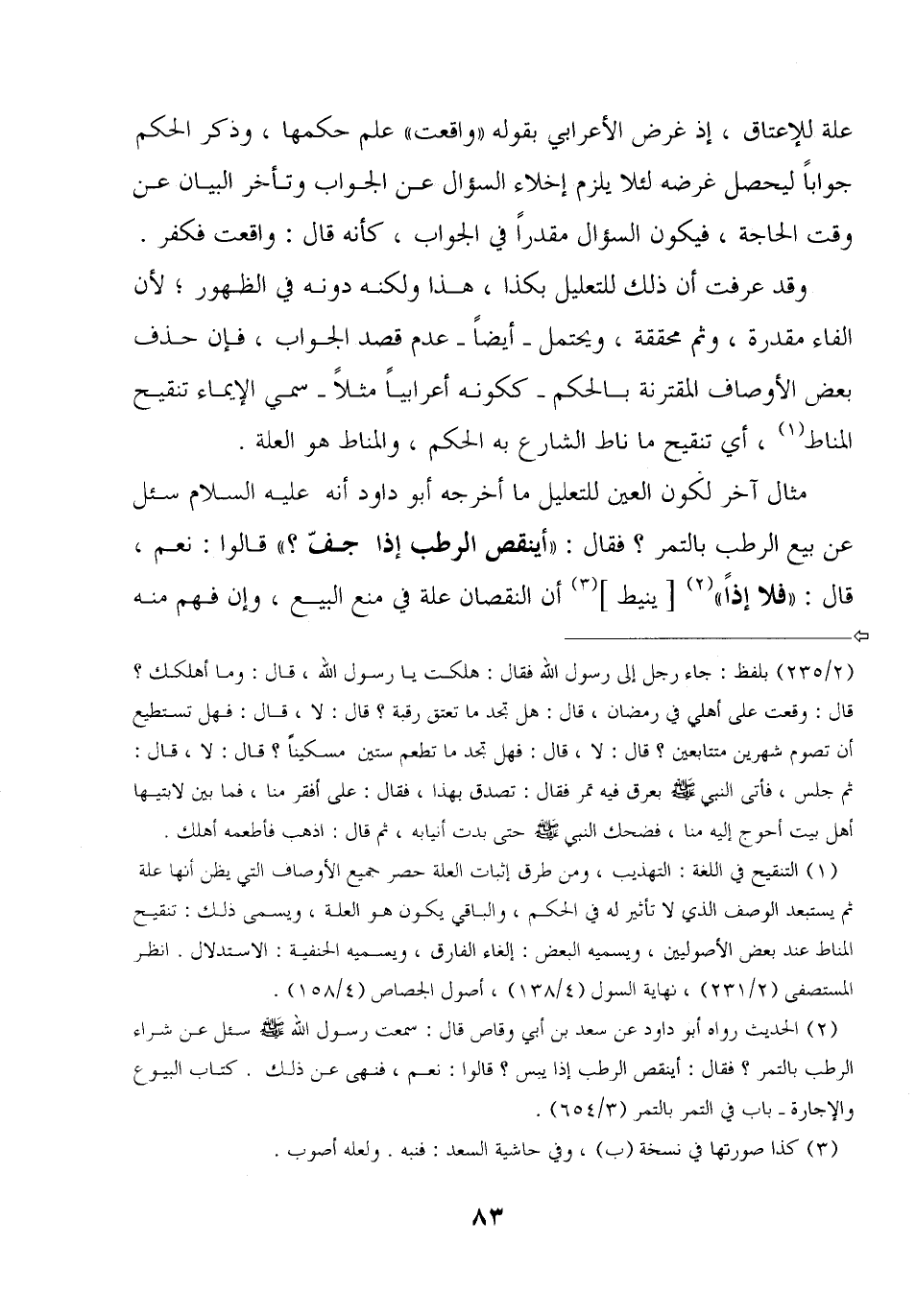 وقد عرفت أن ذلك للتعليل بكذا، هذا ولكنه دونه في الظهور؛ لأن الفاء مقدرة، وثم محققة، ويحتمل –أيضا- عدم قصد الجواب، فإن حذف بعض الأوصاف المقترنة بالحكم –ككونه أعرابيا مثلا- سمي الإيماء تنقيح المناط، أي تنقيح ما ناط الشارع به الحكم، والمناط هو العلة.