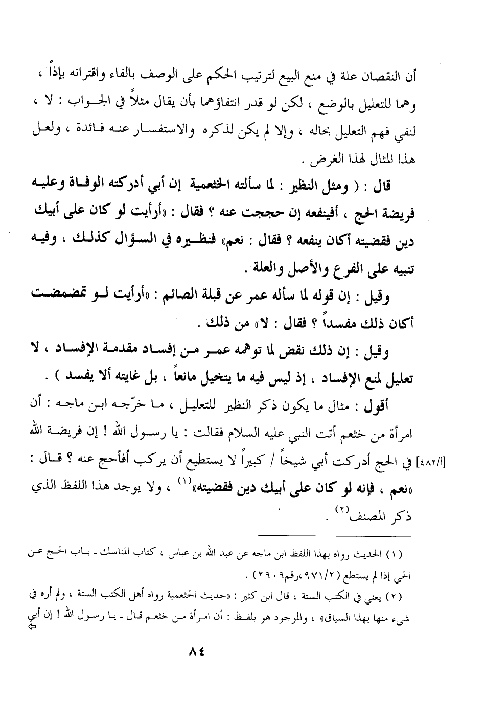 قال: (ومثل النظير: لما سألته الخثعمية إن أبي أدركته الوفاة وعليه فريضة الحج، أفينفعه إن حججت عنه؟ فقال: "أرأيت لو كان على أبيك دين فقضيته أكان ينفعه؟ فقال: نعم" فنظيره في السؤال كذلك، وفيه تنبيه على الفرع والأصل والعلة.