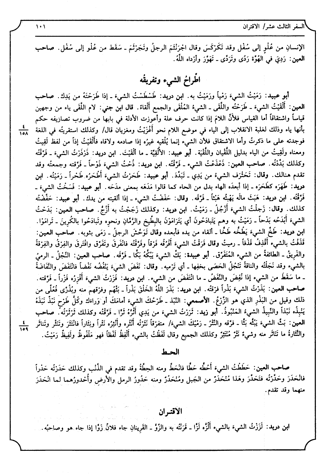 أَبُو عُبَيْد: رميت الشّيء رمياً ورميت بِهِ: ابْن دُرَيْد: طَسْطَسْت الشّيء: إِذا طرحته من يدك. صَاحب الْعين: ألقيت الشّيء: طرحته والَّلقى: الشّيء المُلْقى وَالْجمع ألقاءٌ. قَالَ ابْن جني: لَام اللَّقى يَاء من وَجْهَيْن قِيَاسا واشتقاقاً أما الْقيَاس فَلِأَن اللَّام إِذا كَانَت حرف علّة وأعوزت الْأَدِلَّة فِي بَابهَا من ضروب تصاريفه حكم بِأَنَّهَا يَاء وَذَلِكَ لغَلَبَة الانقلاب إِلَى الْيَاء فِي مَوْضِع اللَّام فمرَّ أَغْزَيْت ومغزيان قَالَ وَكَذَلِكَ استقريته فِي اللُّغَة فَوَجَدته على مَا ذكرت وَأما الِاشْتِقَاق فَلِأَن الشّيء إِنَّمَا يلقيه غَيره إِذا صادمه ولاقاه، فألقيت إِذا من لفظ لقِيْتُ وَمَعْنَاهُ، وَلَقِيت من الْيَاء بِدَلِيل اللُّقيان واللُّقْية. أَبُو عُبَيْد: الأُلْقِية: مَا ألقيت. ابْن دُرَيْد: ذرْذَرْت الشّيء: فرَّقته وَكَذَلِكَ بدَّدْته. صَاحب الْعين: ذَعْذَعْت الشّيء: فرَّقته. ابْن دُرَيْد: ذُحْت الشّيء ذَوْحاً: فرَّقته وَجمعته وَقد تقدم هُنَالك. وَقَالَ تحَثْرَف الشّيء من يَدي: تبدَّد. أَبُو عُبَيْد: طحَّرت الشّيء أطحَرُه طَحْراً: رميته. ابْن دُرَيْد: طهَرَه كطحره: إِذا أبعده الْهَاء بدل من الْحَاء كَمَا قَالُوا مدهه بِمَعْنى مدحه. أَبُو عُبَيْد: فسخت الشّيء: فرَّقته. ابْن دُرَيْد: هبَثَ مالَه يهْبِثُه هَبْثاً: فرَّقه. وَقَالَ: حَفَضْت الشّيء: إِذا أَلقيته من يدك. أَبُو عُبَيْد: حفضْته كَذَلِك. وَقَالَ: زَجَلْت الشّيء أزجُل: رميت. ابْن دُرَيْد: وَكَذَلِكَ زجَجْت بِهِ أزُجُّ. صَاحب الْعين: بدَحْت الشّيء أبدَحُه بَدْحاً: رميت بِهِ وهم يتبادحون أَي يترامون بالبِطِّيخ والرُّمّان وَنَحْوه، وتبادحوا بالكُرين: ترامَوا. ابْن دُرَيْد: طخَّ الشّيء يطُخُّه طَخّاً: أَلْقَاهُ من يَده فَأَبْعَده، وَقَالَ توحَّش الرَّجُل: رمى بِثَوْبِهِ. صَاحب الْعين: قذفت بالشّيء أقذِف قَذْفاً: رميت، وَقَالَ فرَقت الشّيء أفرُقُه فَرْقاً وفرَّقته فانفرق وتفرَّق وافترق، والفِرق والفِرقة والفَريق: الطّائفة من الشّيء المتفرِّق. أَبُو عُبَيْدة: بكَّ الشّيء يبكُّه بَكّاً: فرَّقه. صَاحب الْعين: النّجْل: الرّمي بالشّيء وَقد نجلته، والنّاقة تنجُل الْحَصَى بخفِّها: أَي ترميه. وَقَالَ نفض الشّيء ينفُضُه نفْضاً فانتفض، والنّفاضة: مَا سقط من الشّيء إِذا نفض، والنّفْض: مَا انتفض من الشّيء. ابْن دُرَيْد: فزَرْت الشّيء أفزِرُه فَزْراً: فرَّقته. صَاحب الْعين: بذَرْت الشّيء بَذْراً: فرَّقته. ابْن دُرَيْد: بذر الله الْخلق بَذراً: بثَّهم وفرَّقهم مِنْهُ وبُذُرَّى فُعُلَّى من ذَلِك وَقيل من الْبذر الَّذِي هُوَ الزّرع. الْأَصْمَعِي: النّبْذ: طرحك الشّيء أمامك أَو وَرَاءَك وكلّ طَرح نبذٌ نبذَه ينبِذُه نَبْذاً، والنّبيذ: الشّيء المنبوذ. أَبُو زيد: ثَرَرْت الشّيء من يَدي أثُرُّه ثرَّاً: فرَّقته وَكَذَلِكَ ثرثرته. صَاحب الْعين: بثَّ الشّيء يبثُّه بَثّاً: فرَّقه، والنّثر: رميك الشّيء متفرِّقاً، نثرتُه أنثُرُه وأنثِرُه نَثراً ونِثاراً فانتثر وتنثَّر وتناثر والنّثارة مَا تناثر مِنْهُ وشيءٌ نثْرٌ منتثر وَكَذَلِكَ الْجَمِيع، وَقَالَ لفَظْت بالشّيء ألفِظُ لَفْظاً فَهُوَ ملفوظٌ ولَفيظٌ رميت.