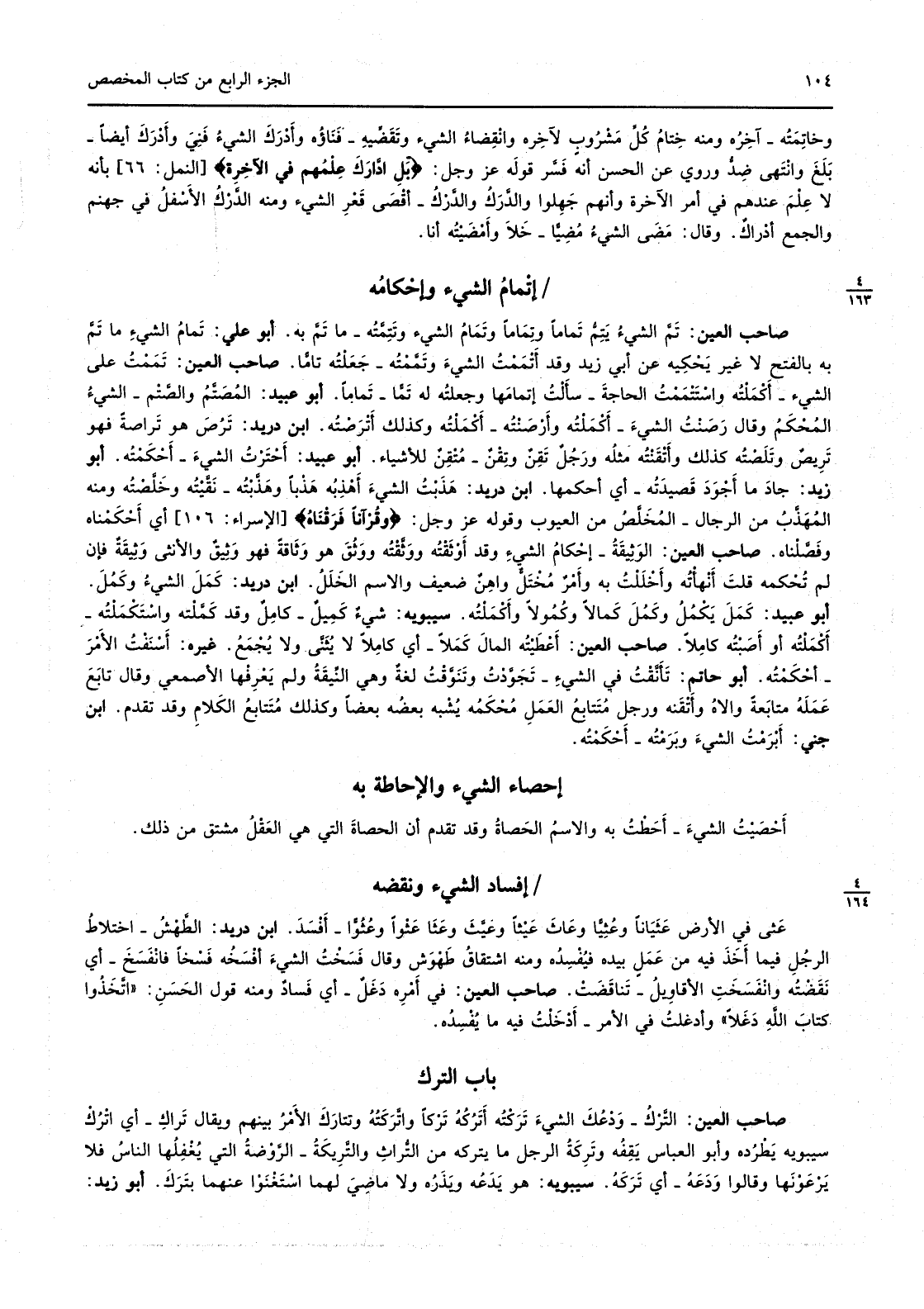 صَاحب الْعين: تمَّ الشّيء يتِمُّ تَمامًا وتِماماً، وَتَمام الشّيء وتتمَّته: مَا تمَّ بِهِ. أَبُو عَليّ: تَمام الشّيء مَا تمَّ بِهِ بِالْفَتْح لَا غير يحكيه عَن أبي زيد وَقد أتممت الشّيء وتمَّمته: جعلته تامّاً. صَاحب الْعين: تمَمت على الشّيء: أَكْمَلْتُه، واسْتَتْمَمْت الحاجةَ: سأَلْتُ إتْمامَها وجعلتُه لَهُ تِمّاً: أَي تَمامًا. أَبُو عُبَيْد: المُصَتَّم والصَّتم: الشّيء الْمُحكم، وَقَالَ رصنت الشّيء: أَكْمَلْتُه، وأَرْصَنْتُه: أكملته وَكَذَلِكَ أَتْرَصْته. ابْن دُرَيْد: تَرُصَ هُوَ تَراصةً فَهُوَ تَريصٌ وتلَصْته كَذَلِك وأَتْقَنْتُه مثله وَرجل تقِنٌ وتِقْنٌ: متقنٌ للأشياء. أَبُو عُبَيْد: احترْت الشّيء: أحكمته. أَبُو زيد: جادَما أحودَ قصيدته: أَي أحكمها. ابْن دُرَيْد: هذَبت الشّيء أهْذِبه هَذْباً وهذَّبته: نقَّيته وخلَّصته، وَمِنْه المهذَّب من الرّجال: المخلَص من الْعُيُوب وَقَوله عز وَجل: (وقرْآناً فرَقْناه) أَي أحكمناه وفصَّلناه. صَاحب الْعين: الْوَثِيقَة: إحكام الشّيء وَقد أوثقته ووثَّقْته ووثُق هُوَ وَثاقةً فَهُوَ وثيقٌ وَالْأُنْثَى وثيقةٌ فَإِن لم تُحكِمه قلتَ أَنْهَأتُه وأَخْلَلْت بِهِ وأَمر مُخْتَلٌّ: واهنٌ ضَعِيف وَالِاسْم: الْخلَل. ابْن دُرَيْد: كمَلَ الشّيء وكمُل. أَبُو عُبَيْد: كمَل يكمُل وكمُل كمالاً وكُمولاً وأكملته. سِيبَوَيْهٍ: شيءٌ كميلٌ: كاملٌ وَقد كمَّلته واستكملته: أكملته أَو أصبته كَامِلا. صَاحب الْعين: أَعْطيته المَال كَمَلاً: أَي كَامِلا لَا يُثنَّى وَلَا يُجمع. غَيره: أسْنَفْت الْأَمر: أحكمته. أَبُو حَاتِم: تأنَّقت فِي الشّيء: تجوَّدْت وتنوَّقت لغةٌ وَهِي النّيقَة وَلم يعرفهَا الْأَصْمَعِي وَقَالَ تَابع عَمَلَه متابَعةً: والاهُ وأَتْقَنَه، وَرجل مُتَتابِع الْعَمَل: مُحْكَمُه يُشبه بعضهُ بَعضاً وَكَذَلِكَ مُتَتابعُ الْكَلَام وَقد تقدم. ابْن جني: أبرمْت الشّيء وبَرَمْته: أحكمته.