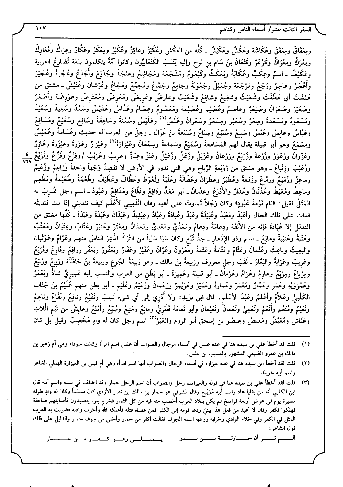 ومِعْفاق ومِعْفَق، وعُكاشة وعَكْش وعُكَيْش كُله من العَكْش، وعُكَيْز وعاكز وعُكَيْز، ومِعْكَر وعَكّارٌ، وعِراكٌ ومُعارِكٌ ومِعْرَكٌ ومِعراكٌ وكَوْعرٌ، وكنعان بن سَام بن نوح وَإِلَيْهِ يُنسب الكنعانيون وَكَانُوا أمَّةً يَتَكَلَّمُونَ بلغَة تضارع الْعَرَبيَّة. وعُكَيْف: اسْم، وعِكَبٌّ وعُكابَةُ وبَعْكَكٌ وكَيْعومٌ ومَشْجَعة ومُجاشِع وعَنجَدٌ وجُدَيعٌ وأجْدَعُ، وعُجْرَةُ وعُجَيْرٌ وأعْجَرُ وعاجِرٌ ورَجْعٌ ومَرْجَعة وجُعَيْلٌ وجَعَوْنَةُ وجامِعٌ وجَمّاعٌ ومُجَمِّعٌ ومَجّاعٌ وعُرْشان وعُنَيْشٌ: مُشْتَقّ من عَنَشْتُ أَي عَطَفْتُ، وشُعَيْثٌ وشَفيعٌ وشافعٌ وشُعَيْبٌ وعارِضٌ وعَرِيضٌ ومُعرِضٌ ومُعتَرِضٌ وعَوْرِضَة وأصْعَرُ وصُعَيْرٌ وصَعرانُ وصَيْعَرٌ وعاصِمٌ وعُصَيْم وعُصَيْمة ومَعصومٌ وعصامٌ وعَدّاسٌ وعُدَيْسٌ وسعْدٌ وسَعيدٌ وسُعَيْدٌ ومسْعودٌ ومَسْعَدَةُ وسِعْرٌ وسُعَيْرٌ ومِسْعَرٌ وسَعْرانُ وعَلَسٌ وعُلَيْسٌ وسُعْنةُ وساعِفَةُ وسافِع وسُفَيْعٌ ومُسافعٌ وعباسٌ وعابِسٌ وعَبْسٌ وسَبِيعٌ وسُبَيْعٌ وسِباعٌ وسُبَيْعةُ ابْن غزال: رجل من الْعَرَب لَهُ حَدِيث، وعُسامة وعُمَيْس ومِسْمع وَهُوَ أَبُو قَبيلَة يُقَال لَهُم المَسامعة، وسُمَيْع وسَمَاعة وسِمعان وعَيْزارة وعَيْزار وعَزْرة وعَيْزرة وعازِر وعَزرانُ وزَعْوَرٌ وزُرْعةُ وزُرَيْعٌ وزَرْعانُ وعُزَيْلٌ وزَعْلٌ وزُعَيْلٌ وعَنْزٌ وعِنازٌ وعَرِيبٌ وعُرَيْبٌ وفِزْعٌ وفَزّاعٌ وفُزَيعٌ وزُعَيْبٌ وزِنْباعٌ: وَهُوَ مُشْتَقّ من زَوْبَعَة الرِّيَاح وَهِي التّي تَدور فِي الأَرْض لَا تقصِدُ وَجها وَاحِدًا، وزاعِمٌ وزُعيم وماعز وزُمَيع وزَمّاع وزَمْعة وعُطَيرٌ وعَطْرانُ وعَطالَةُ وعُلْبَةُ ولَعْوَطٌ وعَطّافٌ وعُطَيفٌ وطُعمة وطُعَيمة ومُطْعِم وماعط ومُعَيط وعُدْثان وعُدار والأدْرَعُ وعَدنان: أَبُو مَعَدٍّ، ودافِعٌ ودَفّاعُ ومُدافعٌ وعَبّودٌ: اسْم رجل ضُرب لَهُ الْمثل فَقيل: نَام نوْمَةَ عبّودٍ، وَكَانَ رجلا تماوتَ على أَهله وَقَالَ اندُبِيني لأَعْلَمَ كَيفَ تَنْدُيبني إِذا مِتُّ فندبتْه فَمَاتَ على تِلْكَ الْحَال. وأعْبُدٌ ومَعبَدٌ وعُبيدةُ وعبْدٌ وعُبادةُ وعَبّادٌ وعِبْديدٌ وعَبْدانُ وعَبْدةُ وعَبَدَةُ: كلهَا مُشْتَقّ من التّذلل إلاّ عُبادة فَإِنَّهُ من الأنفة، ودِعامة ودِعام ومَعَدِّيّ ومَعْدي ومَعْدان ومِعْتَر وعُتَير وعَتّاب وعِتْبان ومُعَتِّب وعُتبَةُ وعُتَيْبة ومانع: اسْم وَذُو الأذعارِ: جَدُّ تُبَّع وَكَانَ سَبَا سَبْياً من التّرك فذعِرَ النّاسُ مِنْهُم، وعَرّام وعَوْثَبان والبَعيث وباعث وَعُثْمَان وعَثّام وعَثّامة وعَثْمة ومَعْرونٌ وعُرّان وعُفَير وعَفَارٌ ويَعْفورٌ ويَعْفُرُ ورافِعٌ وفارِعٌ وفُرَيْعٌ وعَرِيبٌ وعَرابَةُ والبَعَّارُ: لقب رجل مَعْرُوف، وَرَبِيعَة بن مَالك: وَهُوَ ربيعَة الْجُوع وَرَبِيعَة بن حَنْظَلَة، ورَبِيعٌ ورُبَيْعٌ ومِرْباعٌ ومِرْبَعٌ وعارم وعُرام وعَرْمان: أَبُو قَبيلَة، وعَميرة: أَبُو بطن من الْعَرَب والنّسب إِلَيْهِ عَمِيري شَاذ، ويَعْمُر وعَمْرَوَيْه وَعمر وعمار ومَعْمر وعُمارة وعُمَير وعُوَيمر ورَعْمان ورُعَيْم وعُلَيم: أَبُو بطن مِنْهُم عُلَيم بن جَناب الْكَلْبِيّ، وعَلاّم وَأعلم وَعبد الأَعْلَم. قَالَ ابْن دُرَيْد: وَلَا أَدْرِي إِلَى أَي شَيْء نُسب، ونُفَيع وَنَافِع ونَفّاع وناعم ونُعَيم ومُنَعَّم وأنعَم ونُعْمى ونُعْمانُ ونُعَيْمانٌ وَأَبُو نَعامة: قَطَري، ومانع ومَنيعٌ ومُنَيعٌ وأمْنَعُ وعايشٌ من تَيْم اللاّت وعيَّاش ومُعَيِّش ومَعيصٌ وعِيصُو بن إِسْحَاق أَبُو الرّوم، والعَيْرُ: اسْم رجل كَانَ لَهُ وَاد مخصب وَقيل بل كَانَ
