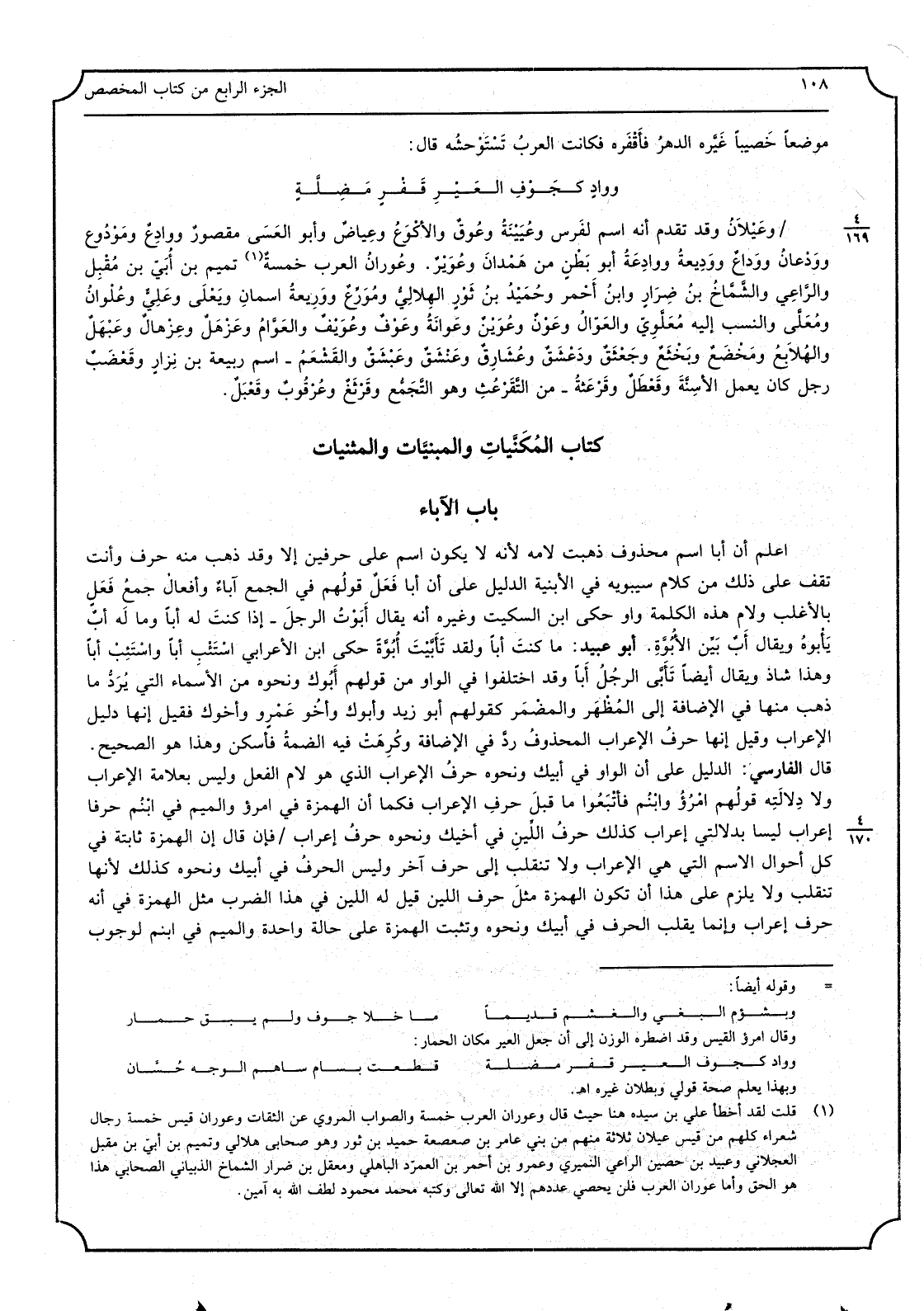 ? بَاب الآباءاعلم أَن أَبَا اسْم مَحْذُوف ذهبت لامه لِأَنَّهُ لَا يكون اسْم على حرفين إلاّ وَقد ذهب مِنْهُ حرف وَأَنت تقف على ذَلِك من كَلَام سِيبَوَيْهٍ فِي الْأَبْنِيَة الدّليل على أَن أَبَا فَعَلٌ قولُهم فِي الْجمع آباءٌ وأفعالٌ جمع فَعَلٍ بالأغلب وَلَام هَذِه الْكَلِمَة وَاو، حكى ابْن السّكيت وَغَيره أَنه يُقَال أَبَوْت الرَّجُل: إِذا كنت لَهُ أَبَا وَمَاله أبٌ يأْبُوه وَيُقَال أَب بيِّن الأُبوَّة. أَبُو عُبَيْد: مَا كنت أَبَا وَلَقَد تأَبَّيْت أُبُوَّة، حكى ابْن الأَعْرابِي: اسْتَئْبِ أَبَا واسْتَئِب أَبَا وَهَذَا شَاذ، وَيُقَال أَيْضا تأَبَّى الرَّجُل أَبَا، وَقد اخْتلفُوا فِي الْوَاو من قَوْلهم أَبوك وَنَحْوه من الْأَسْمَاء التّي يُرَدُّ مَا ذهب مِنْهَا فِي الإِضافة إِلَى المُظهَر والمضمَر كَقَوْلِهِم أَبُو زيد وَأَبُوك وأخو عَمْرو وأخوك فَقيل إِنَّهَا دَلِيل الإِعراب وَقيل إِنَّهَا حرف الإِعراب الْمَحْذُوف رُد فِي الإِضافة وكُرهت فِيهِ الضّمة فأسكن وَهَذَا هُوَ الصَّحِيح. قَالَ الْفَارِسِي: الدّليل على أَن الْوَاو فِي أَبِيك وَنَحْوه من حرف الإِعراب الَّذِي هُوَ لَام الْفِعْل وَلَيْسَ بعلامة الإِعراب وَلَا دلالتّه قَوْلهم امْرُؤْ وابْنُم فأتبعوا مَا قبل حرف الإِعراب فَكَمَا أَن الْهمزَة فِي امْرُؤ وَالْمِيم فِي ابنُم حرفا إِعْرَاب ليسَا بدلالتي إِعْرَاب كَذَلِك حرف اللِّين فِي أَخِيك وَنَحْوه حرف إِعْرَاب، فَإِن قَالَ إِن الْهمزَة ثَابِتَة فِي كل أَحْوَال الِاسْم التّي هِيَ الإِعراب وَلَا تنْقَلب إِلَى حرف آخر وَلَيْسَ الْحَرْف فِي أَبِيك وَنَحْوه كَذَلِك لِأَنَّهَا تنْقَلب وَلَا يلْزم على هَذَا أَن تكون الْهمزَة مثل حرف اللين قيل لَهُ اللين فِي هَذَا الضّرب مثل الْهمزَة فِي أَنه حرف إِعْرَاب وَإِنَّمَا يقلب الْحَرْف فِي أَبِيك وَنَحْوه وَتثبت الْهمزَة على حَالَة وَاحِدَة وَالْمِيم فِي ابنم لوُجُوب