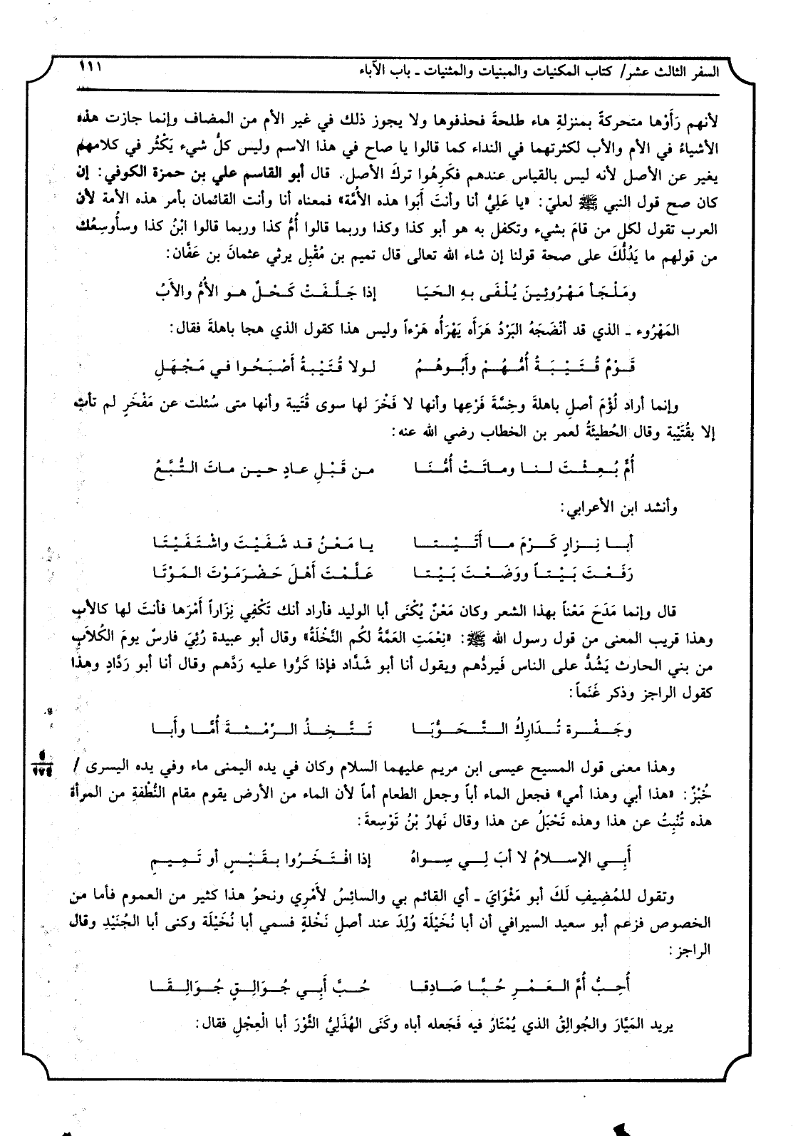 لأَنهم رأوها متحركة بِمَنْزِلَة هَاء طَلْحَة فحذفوها وَلَا يجوز ذَلِك فِي غير الْأُم من الْمُضَاف وَإِنَّمَا جَازَت هَذِه الْأَشْيَاء فِي الْأُم وَالْأَب لكثرتهما فِي النّداء كَمَا قَالُوا يَا صَاح فِي هَذَا الِاسْم وَلَيْسَ كل شَيْء يكثر فِي كَلَامهم يُغير عَن الأَصْل لِأَنَّهُ لَيْسَ بِالْقِيَاسِ عِنْدهم فكرهوا ترك الأَصْل. قَالَ أَبُو الْقَاسِم عَليّ بن حَمْزَة الْكُوفِي: إِن كَانَ صَحَّ قَول النّبي صلّى الله عَلَيْهِ وسلّم لعَلي: (يَا عليّ أَنا وَأَنت أبَوا هَذِه الآمة) . فَمَعْنَاه أَنا وَأَنت القائمان بِأَمْر هَذِه الْأمة لِأَن الْعَرَب تَقول لكل من قَامَ بِشَيْء وتكفل بِهِ هُوَ أَبُو كَذَا وَكَذَا وَرُبمَا قَالُوا أم كَذَا وَرُبمَا قَالُوا ابْن كَذَا وسأوسعك من قَوْلهم مَا يدلك على صِحَة قَوْلنَا إِن شَاءَ الله تَعَالَى، قَالَ تَمِيم بن مقبل يرثي عُثْمَان بن عَفَّان: وملجأ مهروئين يُلفى بِهِ الحَيا إِذا جَلَّفتْ كَحْلٌ هُوَ الْأُم والأبُ المَهْروء: الَّذِي قد أنضجه الْبرد. هرأَه يهرأَه هَرْءاً. وَلَيْسَ هَذَا كَقَوْل الَّذِي هجا باهلة فَقَالَ: قومٌ قُتيبةُ أمّهم وأبوهم لَوْلَا قتيبةُ أَصْبحُوا فِي مَجْهَلِ وَإِنَّمَا أَرَادَ لؤم أصل باهلة وخسة فرعها وَأَنَّهَا لَا فَخر لَهَا سوى قُتَيْبَة وَأَنَّهَا مَتى سُئِلت عَن مفخر لم تأت إلاّ بقتيبة وَقَالَ الحُطيئة لعمر بن الْخطاب رَضِي الله عَنهُ: أمُّ بُعثتَ لنا وَمَاتَتْ أمّنا من قيلِ عادٍ حِين مَاتَ النّبعُ وَأنْشد ابْن الأَعْرابِي: أَبَا نزارٍ كَرْمَ مَا أَتَيْتنَا يَا معنُ قد شَفيتَ واشتفيتا رفعت بَيْتا وَوضعت بَيْتا علّمت أهل حَضرمَوْت الموتا قَالَ: وَإِنَّمَا مدح مَعْناً بِهَذَا الشّعر وَكَانَ معن يكنى أَبَا الْوَلِيد فَأَرَادَ أَنَّك تَكْفِي نزاراً أمرهَا أَنْت لَهَا كَالْأَبِ وَهَذَا قريب الْمَعْنى من قَول رَسُول الله صلّى الله عَلَيْهِ وسلّم: (نِعْمَتِ العَمَّةُ لكم النّخلة) . وَقَالَ أَبُو عُبَيْدة: رُئي فَارس يَوْم الْكلاب من بني الْحَارِث يشد على النّاس فيردهم وَيَقُول: أَنا أَبُو شَدَّاد. فَإِذا كرّوا عَلَيْهِ ردهم، وَقَالَ: أَنا أَبُو رَدّاد. وَهَذَا كَقَوْل الرّاجز وَذكر غنما: وجَفْرة تُدارِك التّحوبا تنَّخِذ الرّمثة أما وَأَبا وَهَذَا معنى قَول الْمَسِيح عِيسَى بن مَرْيَم عَلَيْهِمَا السّلام وَكَانَ فِي يَده الْيُمْنَى مَاء وَفِي يَده الْيُسْرَى خبز: هَذَا أبي وَهَذَا أُمِّي، فَجعل المَاء أَبَا وَجعل الطّعام أما لِأَن المَاء من الأَرْض يقوم مقَام النّطفة من الْمَرْأَة هَذِه تنْبت عَن هَذَا وَهَذِه تحبل عَن هَذَا، وَقَالَ نَهَار بن تَوْسِعة: أبي الإِسلامُ لَا أبَ لي سواهُ إِذا افْتَخرُوا بقيسٍ أَو تميمِ وَتقول للمُضيف لَك أَبُو مَثواي: أَي الْقَائِم بِي والسّائس لأمري، وَنَحْو هَذَا كثير من الْعُمُوم فَأَما من الْخُصُوص فَزعم أَبُو سعيد السّيرافي أَن أَبَا نُخيلة وُلد عِنْد أصل نَخْلَة فسُمي أَبَا نخيلة وكني أَبَا الجُنيد، وَقَالَ الرّاجز: أحبُّ أمَّ العَمْرِ حبا صَادِقا حبَّ أبي جُوالِقٍ جُوالِقا يُرِيد المَيّار والجُوالق الَّذِي يُمتار فِيهِ، فَجعله أَبَاهُ، وكنى الْهُذلِيّ الثّور أَبَا الْعجل فَقَالَ:
