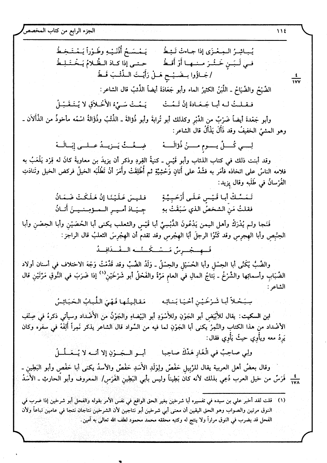 يُبَاشر المِعْزى إِذا جَاءَت تئِطُّ يمسح أدنَبِهِ وطَوْراً يَمْتَخِطْ فِي لبَنٍ خَثُرَ مِنْهَا أَو أقِطْ حَتَّى إِذا كَاد الظّلام يخْتَلط جاؤا بِضَيْحٍ هَل رَأَيْت الذِّئْب قطْ الضَّيْح والضَّياح: اللَّبن الْكثير المَاء، وَأَبُو جعادة أَيْضا الذِّئْب، قَالَ الشّاعر: فَقلت لَهُ أَبَا جَعادَة إِن تمُت يمت سيِّءُ الْأَخْلَاق لَا يُتَقَبَّلُ وَأَبُو جعدة أَيْضا ضرب من الدّبْر وَكَذَلِكَ أَبُو ترابة، وَأَبُو ذؤالة: الذِّئْب وذؤالة اسْمه مأخوذٌ من الذّألان: وَهُوَ الْمَشْي الْخَفِيف وَقد ذأل يذأَل قَالَ الشّاعر: لي كلّ يَوْم من ذؤاله ضِغْثٌ يزِيد على إبَالَهْ وَقد أبنت ذَلِك فِي كتاب الذئاب، وَأَبُو قيس: كنية القرد، وَذكر أَن يزِيد بن مُعَاوِيَة كَانَ لَهُ قرد يلْعَب بِهِ فلامه النّاس على اتِّخَاذه فَأمر بِهِ فشُدَّ على أتانٍ وحشيَّة ثمَّ أُطْلِقت وَأمر أَن تطلبه الْخَيل فركض الْخَيل وتنادت الفرسان فِي طلبه وَقَالَ يزِيد: تمسَّك أَبَا قيسٍ على أرحَبِيَّةٍ فَلَيْسَ علينا إِن هلَكَت ضمانُ فَقلت من الشّخص الَّذِي سبَقَتْ بِهِ جيادَ أَمِير الْمُؤمنِينَ أتانُ فنجا وَلم يُدرك، وَأهل الْيمن يدعونَ الدّبسيَّ أَبَا قيس، والثّعلب يكنى أَبَا الحصَين وَأَبا الحِصْن وَأَبا الحِنْبِص وَأَبا الِهِجْرِس وَقد كنّوا الرَّجُل أَبَا الهجرس وَقد تقدم أَن الهجرس الثّعلب، قَالَ الرّاجز: فهِجرِسٌ مسكَنُه الفَدافِدُ والضّبُّ يكنّى أَبَا الحِسْل وَأَبا الحُسَيْل، والحِسل: ولد الضّبّ، وَقد قدمت وَجه الِاخْتِلَاف فِي أَسْنَان أَوْلَاد الضّباب وأسمائها، والشّرْخُ نِتاج المَال فِي الْعَام مرًّة، والفَحْلُ: أَبُو شَرْخَين إِذا ضَرَبَ فِي النّوقِ مرَّتين قَالَ الشّاعر: سِبَحْلاً أَبَا شَرْخَين أَحْيَا بَنانِه مَقاليتُها فهْيَ اللُبابُ الحَبائسُ ابْن السّكيت: يُقَال للأبيض: أَبُو الجَوْن، وللأسود: أَبُو الْبَيْضَاء، والجَوْن من الأضداد وَسَيَأْتِي ذكره فِي صنف الأضداد من هَذَا الْكتاب، والنّمِرُ يكنَّى أَبَا الجَوْن لما فِيهِ من السّواد، قَالَ الشّاعر يذكر نمِراً ألِفَهُ فِي سَفَره وَكَانَ يرد مَعَه ويأوي حَيْثُ يأوي فَقَالَ: ولي صاحبٌ فِي الْغَار هَدَّكَ صاحبا أَبُو الجَوْن إلاّ أَنه لَا يُعَلَّلُ وَقَالَ بعض أهل الْعَرَبيَّة يُقَال للرَّبيل حَفْصٌ ولولد الْأسد حَفصٌ، والأسد يكنى أَبَا حَفْص، وَأَبُو البَطين: فرَسٌ من خيل الْعَرَب دُعِي بذلك لِأَنَّهُ كَانَ بَطيناً وَلَيْسَ بِأبي البَطين الفَرَس الْمَعْرُوف، وَأَبُو الْحَارِث: الْأسد،