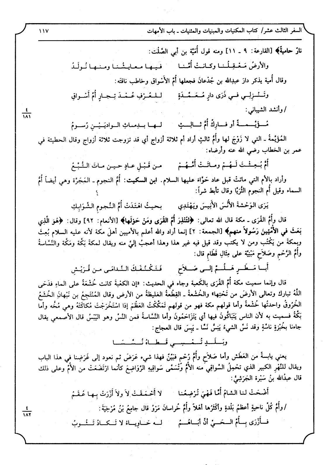نارٌ حامِيَةٌ) وَمِنْه قَول أميَّة بن أبي الصَّلت: والأرضُ مَعْقِلُنا وَكَانَت أُمَّنا فِيهَا معايِشُنا وَمِنْهَا نَوْلَدُ وَقَالَ أميّة يذكر دَار عبد الله بن جدعَان فَجَعلهَا أمَّ الْأَسْوَاق وخاطب ناقتَه: وتَنْزِلي فِي ذَرَى دارٍ مُعَمَّدَةٍ عُمْدَ تِجارٍ أّمِّ أَسواقِ وَأنْشد الشّيباني: مُؤَيَّمّةٌ أَو فاركٌ أُمُّ ثالثّ لَهَا بدِماثِ الواديين رُسومُ المؤيَّمة: التّي لَا زوج لَهَا، وأمُّ ثالثّ: أَرَادَ أم ثَلَاثَة أَزوَاج أَي قد تزوجت ثَلَاثَة أَزوَاج، وَقَالَ الحطيئة فِي عمر بن الخطّاب رَضِي الله عَنهُ وأرضاه: أُمٌّ بُعِثْتَ لَهُم وَمَاتَتْ أُمُّهم من قبل عادٍ حِين مَاتَ التّبَّعُ وَأَرَادَ بِالْأُمِّ التّي مَاتَت قبل عَاد حوّاء عَلَيْهَا السّلام. ابْن السّكيت: أمُّ النّجوم: المَجَرَّة وَهِي أَيْضا أم السّماء، وَقيل أم النّجوم: الثّريّا، وَقَالَ تأبَّطَ شرّا: يرى الوَحْشَةَ الأُنْسَ الأَنِيسَ ويَهْتَدي بحيثُ اهْتَدَتْ أمُّ النُّجومِ الشَّوابِكِ قَالَ وأمُّ الْقرى: مكَّة قَالَ الله تَعَالَى: (لِتُنْذِرَ أُمَّ القُرى وَمن حَولَها) وَقَالَ: (هُوَ الَّذِي بعثَ فِي الأُمِّيّينَ رَسُولا مِنْهُم) إِنَّمَا أَرَادَ وَالله أعلم بالأمِّيين أهل مَكَّة لِأَنَّهُ عَلَيْهِ السّلام بُعث وبمكة من يكْتب وَمن لَا يكْتب وَقد قيل فِيهِ غير هَذَا وَهَذَا أعجب إليَّ مِنْهُ، وَيُقَال لمَكَّة بَكَّة ومكَّة والنّساسةُ وأمُّ الرّحْمِ وصَلاحِ مبنيَّة على مِثَال قَطامِ قَالَ: أَبَا مطَرٍ هلُمَّ إِلَى صلاحِ فتَكْنُفَكَ النّدامى من قُرَيشِ قَالَ وَإِنَّمَا سميت مَكَّة أم الْقرى بِالْكَعْبَةِ، وَجَاء فِي الحَدِيث: (إنَّ الْكَعْبَة كَانَت خُشْعَةً على المَاء فدَحى الله تبَارك وَتَعَالَى الأَرْض من تحتهَا) والخُشعة: الْقطعَة الغليظة من الأَرْض، وَقَالَ المنتجِع بن نَبهَان الخُشَع: الخُروق واحدتها: خُشْعَةُ وَأما قَوْلهم مَكَّة فَهُوَ من قَوْلهم تمكَّكْتُ العَظْمَ إِذا استخرجت مُكاكَتَهُ وَهِي مُخُّه، وَأما بَكَّة فسُمِّيت بِهِ لأنّ النّاس يتباكُّونَ فِيهَا أَي يتزاحمون، وَأما النّساسة فَمن النّسِّ وَهُوَ اليُبْسُ، قَالَ الْأَصْمَعِي: يُقَال جَاءَنَا بخبزةٍ ناسَّةٍ وَقد نسَّ الشّيءُ ينِسُّ نَسّاً: يبِسَ، قَالَ العجاج: وبَلَدٍ تُمْسي قَطاهُ نُسّا يَعْنِي يابسة من الْعَطش، وَأما صلاحِ وأمُّ رُحْمٍ فبَيِّنٌ، فَهَذَا شيءٌ عرَضَ، ثمَّ نعود إِلَى غرضنا فِي هَذَا الْبَاب، وَيُقَال للنهر الْكَبِير الَّذِي تحمل السّواقي مِنْهُ الْأُم وتسمَّى سواقيه الرّواضِعَ كَأَنَّمَا ارتَضَعَتْ من الأمّ وعَلى ذَلِك قَالَ عبد الله بن سُبْرَة الجَرَشيُّ: أضحَت لنا الشّامُ أُمّاً فَهِيَ تُرْضِعُنا لَا أحَقَّتْ لَا وَلَا أّزْرَتْ بهَا عُقَمُ وأمُّ كلِّ نَاحيَة أعظم بلدةٍ وأكثرُها أَهلا، وأمُّ خُراسانَ مرْوُ قَالَ جَامع بن مُرْخِيَةَ: فأزرى بأمِّ الحَيِّ أنَّ أباهُمُ لَهُ حاوياءُ لَا تكادُ تثوبُ