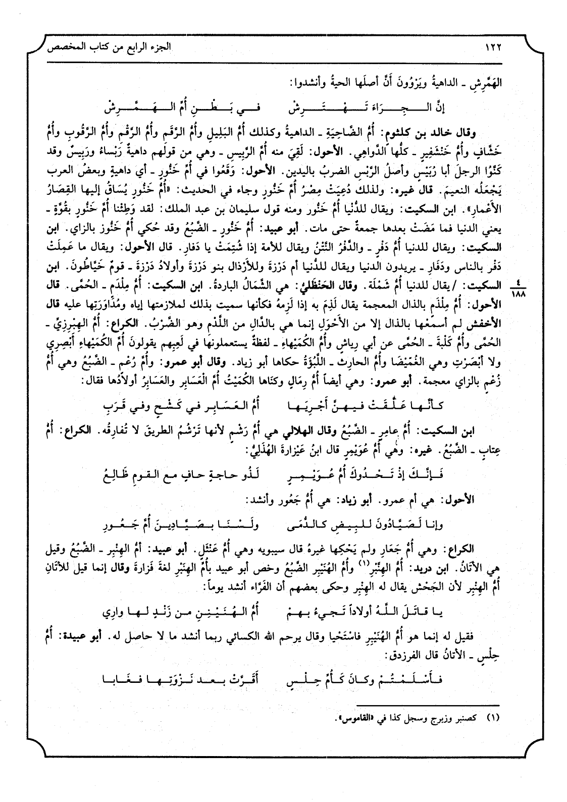 الهَمَّرِش: الدّاهية ويروون أَن أَصْلهَا الحيّة، وأنشدوا: إنَّ الجِراءَ تَهْتَرِشْ فِي بَطنِ أُمِّ الهَمَّرِشْ وَقَالَ خَالِد بن كُلْثُوم: أُمّ الضّاحِيَة: الدّاهية، وَكَذَلِكَ أُمّ البَليل، وأُمّ الرّقَم، وأُمّ الرّقْم، وأُمّ الرّقوب، وأُمّ خَشَّاف، وأُمّ خَنْشَفير: كلهَا الدّواهي. الْأَحول: لقيض مِنْهُ أُمّ الرّبيس: وَهِي من قَوْلهم داهيةٌ رَبْساء ورَبيس وَقد كَنّوا الرَّجُل أَبَا رُبَيْس وأصل الرّبْس الضّرب باليدين. الْأَحول: وَقَعُوا فِي أُمّ خَنُّور: أَي داهية، وَبَعض الْعَرَب يَجعله النّعيم. قَالَ غَيره: وَلذَلِك دُعيَت مِصر أُمّ خَنُّور، وَجَاء فِي الحَدِيث: أُمّ خَنُّور يُساقُ إِلَيْهَا القِصار الْأَعْمَار (. ابْن السّكيت: وَيُقَال للدنيا أُمّ خَنُّور، وَمِنْه قَول سُلَيْمَان بن عبد الْملك: لقد وَطِئنا أُمّ خَنُّور بقُوَّة: يَعْنِي الدّنيا، فَمَا مَضَت بعْدهَا جُمُعَة حَتَّى مَاتَ. أَبُو عُبَيْد: أُمّ خَنُّور: الضّبُع، وَقد حُكي: أُمّ خَنُّور بالزاي. ابْن السّكيت: وَيُقَال للدنيا أُمّ دَفْر: والدّفْر النّتْن، وَيُقَال للْأمة إِذا شُتمت يَا دَفار. قَالَ الْأَحول: وَيُقَال مَا عملَتْ دَفْر بالنّاس، ودَفار: يُرِيدُونَ الدّنيا، وَيُقَال للدنيا: أُمّ دَرْزَة، وللأرذال بَنو دَرْزَة، وَأَوْلَاد دَرْزَة: قوم خيّاطون. ابْن السّكيت: يُقَال للدنيا أُمّ شَمْلَة. وَقَالَ الحَنْظَلي: هِيَ الشّمال الْبَارِدَة. ابْن السّكيت: أُمّ مِلْدَم: الحُمّى، قَالَ الْأَحول: أُمّ مِلْذَم بِالذَّالِ الْمُعْجَمَة، يُقَال لَذِم بِهِ إِذا لزمَه، فَكَأَنَّهَا سميت بذلك لملازمتها إِيَّاه ومُداورتها عَلَيْهِ. قَالَ الْأَخْفَش: لم أسمعها بِالذَّالِ إلاّ من الْأَحول، إِنَّمَا هِيَ بالدّال من اللَّدْم وَهُوَ الضّرب. الكراع: أُمّ الهِبْرِزِيّ: الحُمّى، وأُمّ كَلْبَة: الحُمّى، عَن أبي رياشٍ وأُمّ الكُمَيْهاء: لفظةٌ يستعملونها فِي لعبهم يَقُولُونَ أُمّ الكُمَيْهاء أبْصِري وَلَا أبْصَرْتِ، وَهِي الغُمُيْضا، وأُمّ الْحَارِث: اللَّبُؤَة، حَكَاهَا أَبُو زِيَاد. وَقَالَ أَبُو عَمْرو: وأُمّ رُعْم: الضّبُع، وَهِي أُمّ زُعْم بالزاي مُعْجمَة. أَبُو عَمْرو: وَهِي أَيْضا أُمّ رِمال، وكناها الكُمَيْت أُمّ العَسابِر، والعَسابُر أَوْلَادهَا، فَقَالَ: كأنَّها عَلَّقَتْ أَجْرِيَها أُمُّ العَسابِر فِي كَشْحٍ وَفِي قَرَبِ ابْن السّكيت: أُمّ عامِر: الضّبُع، وَقَالَ الْهِلَالِي: هِيَ أُمّ رَشْم: لِأَنَّهَا تَرْشُم الطّريق لَا تُفارقه. الكراع: أُمّ عِتاب: الضّبُع. غَيره: وَهِي أُمّ عُوَيْمِر، قَالَ ابْن عَيْزارة الهُذَلي: فإنَّكَ إذْ تَحْدوكَ أُمُّ عُوَيْمِرٍ لَذو حاجةٍ حافٍ مَعَ القومِ ظالِعُ الْأَحول: هِيَ أم عَمْرو. أَبُو زِيَاد: هِيَ أُمّ جَعور، وَأنْشد: وَإِنَّا لَصَيَّادون للبِيضِ كالدّمى ولسنا بصَيَّادينَ أمّ جَعورِ الكراع: وَهِي أُمّ جَعار، وَلم يحكها غَيره. قَالَ سِيبَوَيْهٍ: وَهِي أُمّ عَنْثَل. أَبُو عُبَيْد: أُمّ الهِنْبَر: الضّبُع، وَقيل هِيَ الأتان. ابْن دُرَيْد: أُمّ الهِنَّبْر، وأُمّ الهُنَيْبِر: الضّبُع، وَخص أَبُو عُبَيْد بِأم الهِنَبْر لُغَة فَزارة وَقَالَ: إِنَّمَا قيل للأتان أُمّ الهِنْبِر لِأَن الجَحش يُقَال لَهُ الهِنْبِر، وَحكى بَعضهم أَن الفَرَّاء أنْشد يَوْمًا: يَا قاتَلَ اللهُ أَوْلَادًا تجيءُ بهمْ أُمّ الهُنَيْنِنِ من زَنْدٍ لَهَا واري فَقيل إِنَّمَا هُوَ أُمّ الهُنَيْبِر فاسْتحيا، وَقَالَ يرحمُ الله الْكسَائي، رُبمَا أنْشد مَا لَا حَاصِل لَهُ. أَبُو عُبَيْدة: أُمّ حِلْس: الأتان، قَالَ الفرزدق: فأسْلَمْتُم وَكَانَ كأُمّ حِلْسٍ أقْرَتْ بعد نَزْوَتِها فغابا