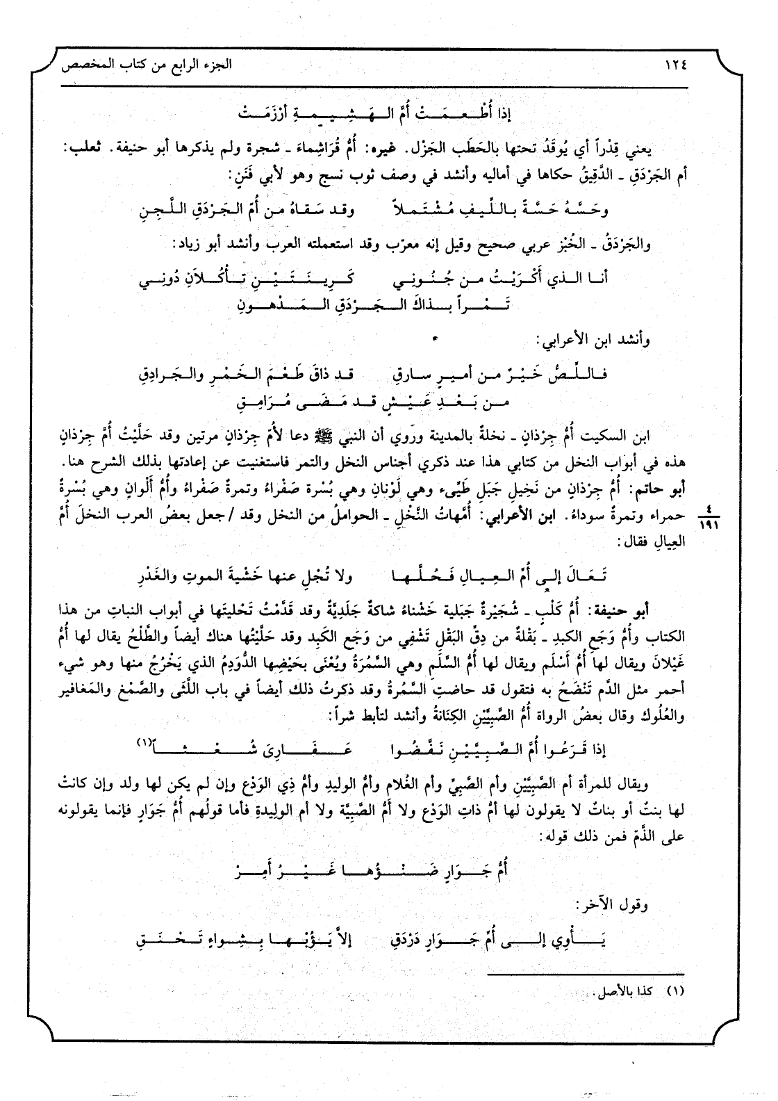 إِذا أُطعِمَتْ أُمَّ الهَشيمةِ أرْزَمَتْ يَعْنِي قِدْراً: أَي يُوقد تحتهَا بالحطب الجَزْل. غَيره: أُمّ قُراشِماء: شَجَرَة، وَلم يذكرهَا أَبُو حنيفَة. ثَعْلَب: أُمّ الجَرْدَق: الدّقيق، حَكَاهَا فِي أَمَالِيهِ، وَأنْشد فِي وصف ثوب نسج وَهُوَ لأبي فَنَن: وحَسَّهُ حَسَّةً باللِّيفِ مُشْتَملاً وَقد سقَاهُ من أُمِّ الجَرْدَقِ اللَّجِنِ والجَرْدق: الْخبز، عَرَبِيّ صَحِيح، وَقيل إِنَّه مُعرب وَقد استعملته الْعَرَب، وَأنْشد أَبُو زِيَاد: أَنا الَّذِي أَكْرَيْتُ من جُنوني كَرِيْنَتَيْنِ تأكُلانِ دوني تَمراً بذاكَ الجَرْدَقِ المَدْهونِ وَأنْشد ابْن الأَعْرابِي: فاللَّصُّ خَيْرٌ من أميرٍ سارقِ قد ذاقَ طَعمَ الخَمرِ والجَرادِقِ مِن بعدِ عَيشٍ قد مضى مُرامِقِ ابْن السّكيت: أُمّ جِرْذان: نَخْلَة بِالْمَدِينَةِ، وَرُوِيَ أَن النّبي صلّى الله عَلَيْهِ وسلّم دَعَا لأُمّ جِرْذان مرَّتَيْنِ، وَقد حَلَّيْتُ أُمّ جِرذان هَذِه فِي أَبْوَاب النّخل من كتابي هَذَا عِنْد ذكري أَجنَاس النّخل والتّمر فاستغنيت عَن إِعَادَتهَا بذلك الشّرح هُنَا. أَبُو حَاتِم: أُمّ جِرْذان: من نخيل جبل طَيْئٍ، وَهِي لَونان، وَهِي بُسْرة صفراء وتمرةٌ صفراء، وأُمّ أَلْوان وَهِي بًسْرة حَمْرَاء وَتَمْرَة سَوْدَاء. ابْن الأَعْرابِي: أُمَّهاتُ النّخْل: الْحَوَامِل من النّخل، وَقد جعل بعض الْعَرَب النّخلَ أُمّ العِيال، فَقَالَ: تعالَ إِلَى أُمّ العِيالِ فحُلَّها وَلَا تُجْلِ عَنْهَا خَشيةَ الموتِ والغَدْرِ أَبُو حنيفَة: أُمّ كَلْب: شُجَيْرة جَبَلية خَشْناء شاكةٌ جَلَدِيَّة، وَقد قدمت تَحليتها فِي أَبْوَاب النّبات من هَذَا الْكتاب، وأُمّ وَجَع الكبد: بَقْلَةٌ من دِقِّ البَقْل، تَشفي من وجع الكبد، وَقد حَلَّيْتها هُنَاكَ أَيْضا، والطّلْح يُقَال لَهَا أُمّ غَيْلان، وَيُقَال لَهَا أُمّ أَسْلَم، وَيُقَال لَهَا أُمّ السّلَم: وَهِي السَّمُرَة، ويُعنى بحَيْضِها الدّوَدِم الَّذِي يخرج مِنْهَا وَهُوَ شَيْء أَحْمَر مثل الدّم تَنْضَح بِهِ فَتَقول قد حَاضَت السّمُرة. وَقد ذكرت ذَلِك أَيْضا فِي بَاب اللَّثى والصَّمغ والمَغافير والعُلوك، وَقَالَ بعض الرّواة: أُمّ الصَّبِيَّيْن: الكِنانة، وَأنْشد لتأبط شرا: إِذا قَرَعوا أُمّ الصَّبِيَّيْن نَفَّضوا عَفاريَ شُعْثا وَيُقَال للْمَرْأَة أم الصَّبِيَّيْن وأُمّ الصَّبِي، وأُمّ الغُلام، وأُمّ الوَليد، وأُمّ ذِي الوَرْع، وَإِن لم يكن لَهَا ولد، وَإِن كَانَت لَهَا بنت أَو بَنَات لَا يَقُولُونَ لَهَا أُمّ ذَات الوَرْع وَلَا أُمّ الصًّبِيَّة وَلَا أُمّ الوَليدة، فَأَما قَوْلهم أُمّ جَوَار، فَإِنَّمَا يَقُولُونَهُ على الذَّمِّ، فَمن ذَلِك قَوْله: أُمّ جَوارٍ ضَنْؤها غَيرُ أَمِرْ وَقَول الآخر: يأوي إِلَى أُمّ جَوارٍ دَرْدَقِ إلاّ يَؤبْها بِشِواءٍ تَحْنَقِ