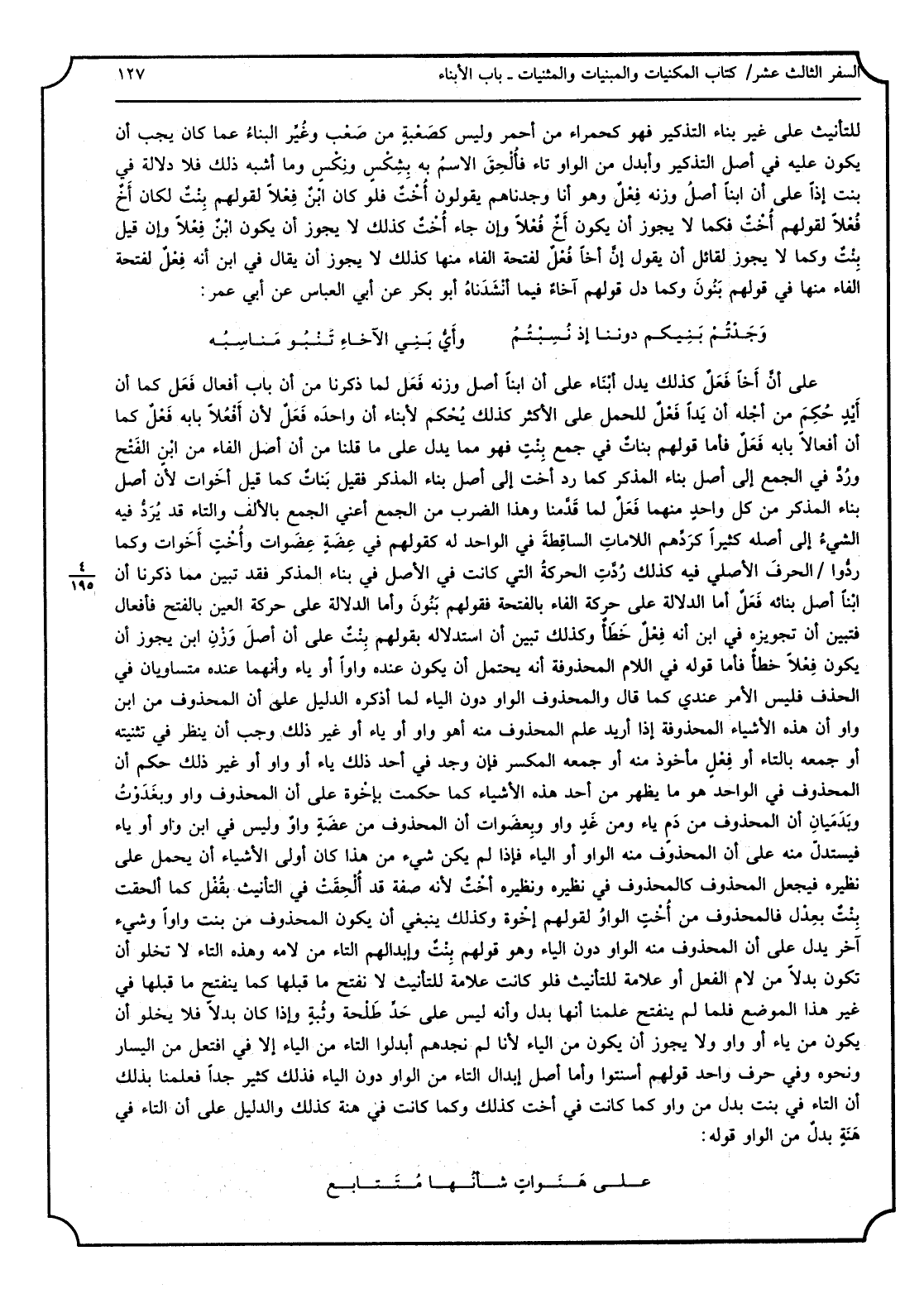 للتأنيث على غير بِنَاء التّذكير فَهُوَ كحمراء من أَحْمَر وَلَيْسَ كصعبةٍ من صَعْبٍ وغُيِّر الْبناء عمّا كَانَ يجب أَن يكون عَلَيْهِ فِي أصل التّذكير وأُبدِل من الْوَاو تَاء فاُلحِق الِاسْم بِهِ بشِكْسٍ ونِكْسٍ وَمَا أشبه ذَلِك فَلَا دلَالَة فِي بنت إِذا على أَن ابْنا أصل وَزنه فِعلٌ وَهُوَ أَنا وجدناهم يَقُولُونَ أُخْتُ فَلَو كَانَ ابنُ فِعلاً لقَولهم بنتٌ لَكَانَ أخٌ فُعْلاً لقَولهم أختٌ فَكَمَا لَا يجوز أَن يكون أخُ فُعلاً وَإِن جَاءَ أختٌ كَذَلِك لَا يجوز أَن يكون ابنٌ فِعلاً وَإِن قيل بنتُ، وكما لَا يجوز لقَائِل أَن يَقُول إِن أَخا فُعْلٌ لفتحة الْفَاء مِنْهَا كَذَلِك لَا يجوز أَن يُقَال فِي ابْن إِنَّه فِعْلٌ لفتحة الْفَاء مِنْهَا فِي قَوْلهم بنونَ وكما دلَّ قَوْلهم آخاءٌ فِيمَا أنشَدَناهُ أَبُو بكر عَن أبي الْعَبَّاس عَن أبي عمر: وَجَدْتُمْ بَنيكم دُوننَا إِذْ نُسِبْتُم وأيُّ بني الآخاء تَنْبو مَناسبُه على أَن أَخا فَعَلٌ كَذَلِك يدل أَبنَاء على أَن ابْنا أصل وَزنه فَعَل لما ذكرنَا من أَن بَاب أَفعَال فَعَل كَمَا أَن أيْدٍ حُكِمَ من أَجله أَن يدا فَعْلٌ للْحَمْل على الْأَكْثَر كَذَلِك يُحكم لأبناء أَن واحده فَعَلٌ لِأَن أفْعُلاً بَابه فَعْلٌ كَمَا أفعالا بَابه فَعَلٌ، فَأَما قَوْلهم بناتُ فِي جمع بنتٍ فَهُوَ مِمَّا يدل على مَا قُلْنَا من أَن أصل الْفَاء من ابنٍ الفتْح ورُدَّ فِي الْجمع إِلَى أصل بِنَاء الْمُذكر كَمَا ردَّ أُخْت إِلَى أصل بِنَاء الْمُذكر فَقيل بناتٌ كَمَا قيل أخَواتٌ لِأَن أصل بِنَاء الْمُذكر من كل وَاحِد مِنْهُمَا فَعَلٌ لما قدَّمنا وَهَذَا الضّرب من الْجمع أَعنِي الْجمع بِالْألف والتّاء قد يُرَدُّ فِيهِ الشّيء إِلَى أَصله كثيرا كردِّهم الّلاماتِ السّاقطة فِي الْوَاحِد لَهُ كَقَوْلِهِم فِي عِضَّة عِضَوات وأُختٍ أخَوات وكما ردُّوا الْحَرْف الْأَصْلِيّ فِيهِ كَذَلِك رُدَّتِ الْحَرَكَة التّي كَانَت فِي الأَصْل فِي بِنَاء الْمُذكر فقد تبيَّن مِمَّا ذكرنَا أَن ابْنا أصل بنائِهِ فَعَلٌ، أما الدّلالة على حَرَكَة الْفَاء بالفتحة فَقَوْلهم بنُونَ، وَأما الدّلالة على حَرَكَة الْعين بِالْفَتْح فأفعال فَتبين أَن تجويزه فِي ابْن أَنه فِعْلٌ خطأٌ وَكَذَلِكَ تبين أَن استدلاله بقَوْلهمْ بنتٌ على أَن أصل وزنِ ابْن يجوز أَن يكون فِعْلاً خطأٌ، فَأَما قَوْله فِي اللَّام المحذوفة أَنه يحْتَمل أَن يكون عِنْده واواً أَو يَاء وأنهما عِنْده متساويان فِي الْحَذف فَلَيْسَ الْأَمر عِنْدِي كَمَا قَالَ والمحذوف الْوَاو دون الْيَاء لما أذكرهُ الدّليل على أَن الْمَحْذُوف من ابْن وَاو أَن هَذِه الْأَشْيَاء المحذوفة إِذا أُرِيد علم الْمَحْذُوف مِنْهُ أهوَ وَاو أَو يَاء أَو غير ذَلِك وَجب أَن يُنْظَر فِي تثنيته أَو جمعه بالتّاء أَو فِعْلٍ مَأْخُوذ مِنْهُ أَو جمعه المكسر فَإِن وجد فِي أحد ذَلِك يَاء أَو وَاو أَو غير ذَلِك حكم أَن الْمَحْذُوف فِي الْوَاحِد هُوَ مَا يظْهر من أحد هَذِه الْأَشْيَاء كَمَا حكمت بأخْوة على أَن الْمَحْذُوف وَاو بغَدَوْتُ وبدَمَيانِ أَن الْمَحْذُوف من دمٍ يَاء وَمن غدٍ وَاو وبعِضَوات أَن الْمَحْذُوف من عِضَةٍ واوٌ وَلَيْسَ فِي ابْن وَاو أَو يَاء فيستدلّ مِنْهُ على أَن الْمَحْذُوف مِنْهُ الْوَاو أَو الْيَاء فَإِذا لم يكن شيءٌ من هَذَا كَانَ أولى الْأَشْيَاء أَن يحمل على نَظِيره فَيجْعَل الْمَحْذُوف كالمحذوف فِي نَظِيره وَنَظِيره أُخْتٌ لِأَنَّهُ صفة قد أُلْحِقَت فِي التَّأْنِيث بقُفْل كَمَا ألحقت بنتٌ بعِدْل، فالمحذوف من أختٍ الْوَاو لقَولهم إخْوَة، وَكَذَلِكَ يَنْبَغِي أَن يكون الْمَحْذُوف من بنت واوا، وَشَيْء آخر يدل على أَن الْمَحْذُوف مِنْهُ الْوَاو دون الْيَاء وَهُوَ قَوْلهم بنتٌ وإبدالهم التّاء من لامه وَهَذِه التّاء لَا تَخْلُو أَن تكون بَدَلا من لَام الْفِعْل أَو عَلامَة للتأنيث فَلَ