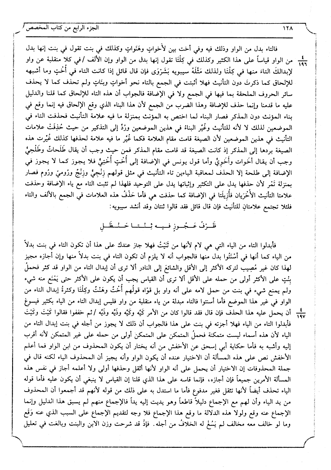 فالتّاء بدل من الْوَاو وَذَلِكَ فِيهِ وَفِي أُخْت بَين لأَخَواتٍ وهَنَواتٍ، وَكَذَلِكَ فِي بنت تَقول فِي بنت أَنَّهَا بدل من الْوَاو قِيَاسا على هَذَا الْكثير، وَكَذَلِكَ فِي كِلْتا تَقول أَنَّهَا بدل من الْوَاو وَأَن الأَلِف فِي كلا منقلبة عَن وَاو لإبدالك التّاءَ مِنْهَا فِي كِلتا وَلذَلِك مثَّلَه سِيبَوَيْهٍ بشَرْوَى فَإِن قَالَ قَائِل إِذا كَانَت التّاء فِي أختٍ وَمَا أشبهه للإلحاق كَمَا ذكرتَ دون التّأنيث فَهَلا أَثْبَتَت فِي الْجمع بالتّاء نَحْو أخواتٍ وبناتٍ وَلم تحذف كَمَا لَا يحذف سَائِر الْحُرُوف الملحقة بِمَا فِيهَا فِي الْجمع وَلَا فِي الإِضافة فَالْجَوَاب أَن هَذِه التّاء للإلحاق كَمَا قُلْنَا والدّليل عَلَيْهِ مَا قدمنَا وَإِنَّمَا حذف للإضافة وَهَذَا الضّرب من الْجمع لِأَن هَذَا الْبناء الَّذِي وَقع الإِلحاق فِيهِ إِنَّمَا وَقع فِي بِنَاء الْمُؤَنَّث دون الْمُذكر فَصَارَ الْبناء لما اخْتصَّ بِهِ الْمُؤَنَّث بِمَنْزِلَة مَا فِيهِ عَلامَة التّأنيث فحذفت التّاء فِي الْمَوْضِعَيْنِ لذَلِك لَا لِأَنَّهُ للتأنيث وغُيِّر الْبناء فِي هذَيْن الْمَوْضِعَيْنِ ورُد إِلَى التّذكير من حَيْثُ حُذفت عَلَامَات التّأنيث فِي هذَيْن الْمَوْضِعَيْنِ لِأَن الصِّيغَة قَامَت مقَام الْعَلامَة فَكَمَا نميِّز مَا فِيهِ عَلامَة لحذفها كَذَلِك غُيِّرت هَذِه الصِّيغَة بردهَا إِلَى الْمُذكر إِذْ كَانَت الصِّيغَة قد قَامَت مقَام الْمُذكر فَمن حَيْثُ وَجب أَن يُقَال طَلَحات وطَلْحِيّ وَجب أَن يُقَال أخَوات وأَخَوِيّ وَأما قَول يُونُس فِي الإِضافة إِلَى أُخْت أُخْتِيّ فَلَا يجوز كَمَا لَا يجوز فِي الإِضافة إِلَى طَلْحَة إلاّ الْحَذف لمعاقبة الياءين تَاء التّأنيث فِي مثل قَوْلهم زِنْجِيّ وزِنْج ورُومِيّ ورُوم فَصَارَ بِمَنْزِلَة تَمر لِأَن حذفهَا يدل على التّكثير وإثباتها يدل على التّوحيد فَلهَذَا لم تثبت التّاء مَعَ يَاء الإِضافة وحذفت علامتا التّأنيث الأخريان فأُزيلتا فِي الإِضافة كَمَا حذفت هِيَ فَأَما حذف هَذِه العلامات فِي الْجمع بِالْألف والتّاء، فلئلا تَجْتَمِع علامتان للتأنيث، فَإِن قَالَ قَائِل: فقد قَالُوا: ثِنْتَانِ، وَقد أنْشد سِيبَوَيْهٍ: ظَرْفُ عَجوزٍ فِيهِ ثِنْتا حَنْظَلِ فأبدلوا التّاء من الْيَاء التّي هِيَ لَام لِأَنَّهَا من ثَنَيْت فَهَلا جَازَ عنْدك على هَذَا أَن تكون التّاء فِي بنت بَدَلا من الْيَاء كَمَا أَنَّهَا فِي أسْنَتوا بدل مِنْهَا فَالْجَوَاب أَنه لَا يلْزم أَن تكون التّاء فِي بنت بَدَلا مِنْهَا وَإِن أجَاز مجيز لهَذَا كَانَ غير مُصيب لتَركه الْأَكْثَر إِلَى الْأَقَل والشّائع إِلَى النّادر إلاّ ترى أَن إِبْدَال التّاء من الْوَاو قد كثر فحملُ بِنْتٍ على الْأَكْثَر أولى من حمله على الْأَقَل إلاّ ترى أَن الْقيَاس يجب أَن يكون على الْأَكْثَر حَتَّى يَمنع مِنْهُ شَيْء وَلم يمْنَع شَيْء فِي بنت من حمل لامه فَأَما اسنتوا فالتّاء مبدلة من يَاء منقلبة من وَاو فَلَيْسَ إِبْدَال التّاء من الْيَاء بِكَثِير فيسوغ أَن يحمل عَلَيْهِ هَذَا الْحَذف فَإِن قَالَ: فقد قَالُوا: كَانَ من الْأَمر كَيَّه وكَيَّه، وذَيَّه وذَيَّه، ثمَّ خففوا فَقَالُوا: كَيْتَ وكَيْت، فأبدلوا التّاء من الْيَاء، فَهَلا أجزته فِي بنت على هَذَا فَالْجَوَاب أَن ذَلِك لَا يجوز من أَجله فِي بنت إِبْدَال التّاء من الْيَاء لِأَن هَذِه أَسمَاء لَيست متمكنة فحملُ المتمكن على المتمكن أولى من حمله على غير المتمكن لِأَنَّهُ أقرب إِلَيْهِ وأشبه بِهِ، فَأَما حِكَايَة أبي إِسْحَاق عَن الْأَخْفَش من أَنه يخْتَار أَن يكون الْمَحْذُوف من ابْن الْوَاو فَمَا أعلم الْأَخْفَش نَص هَذِه الْمَسْأَلَة أَن الِاخْتِيَار عِنْده أَن يكون الْوَاو وَأَنه يُجِيز أَن الْمَحْذُوف الْيَاء لكنه قَالَ فِي جملَة المحذوفات أَن الِاخْتِيَار أَن يحمل على أَنه الْوَا