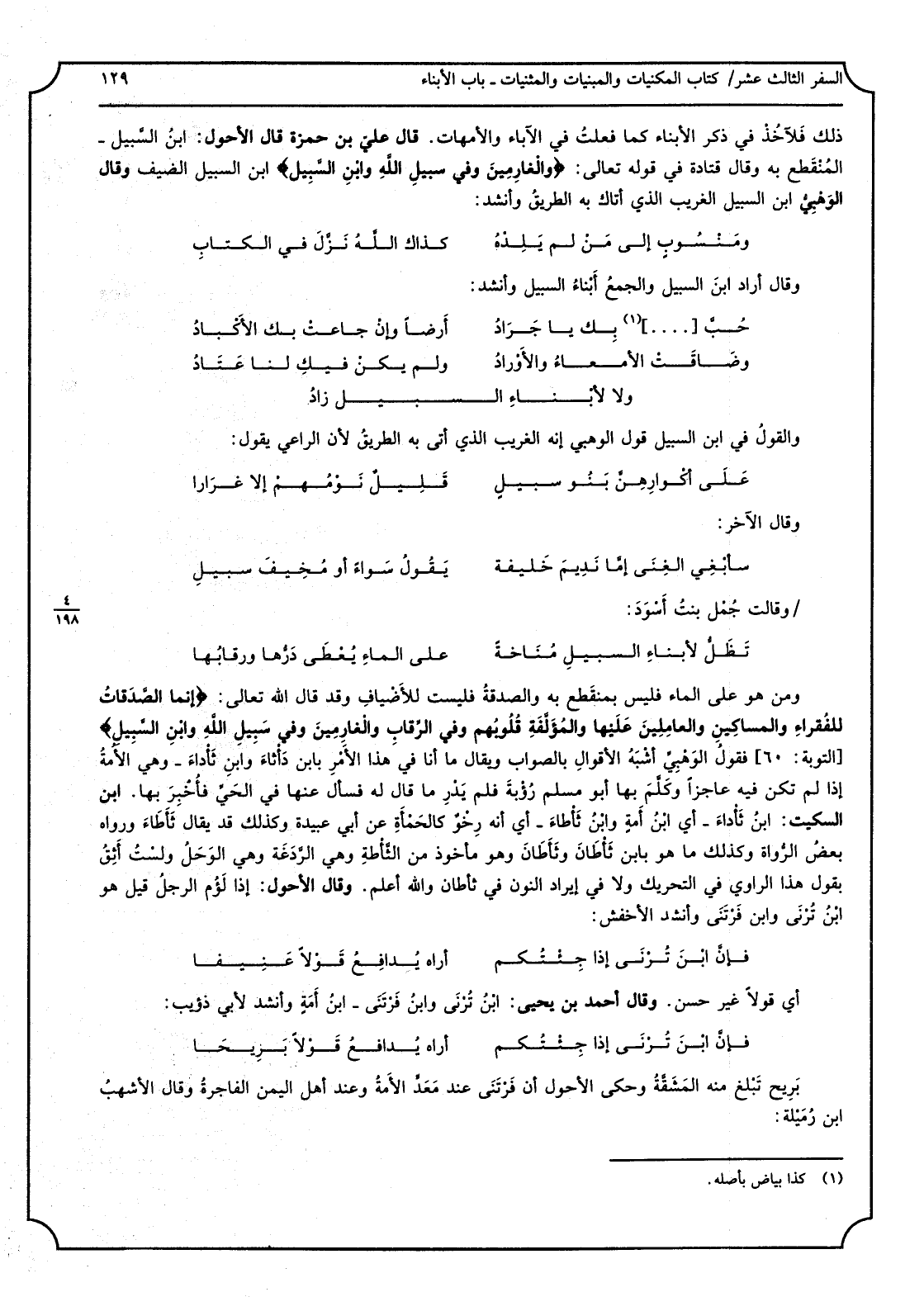 ذَلِك فلآخذ فِي ذكر الْأَبْنَاء كَمَا فعلت فِي الإِباء والأمهات، قَالَ عَليّ بن حَمْزَة: قَالَ الْأَحول: ابْن السّبيل: المُنقطِع بِهِ، وَقَالَ قَتَادَة فِي قَوْله تَعَالَى: (والغارمين وَفِي سَبِيل الله وابْن السّبيل) . ابْن السّبيل الضّيف. وَقَالَ الوَهْبِيّ: ابْن السّبيل: الْغَرِيب الَّذِي أَتَاك بِهِ الطّريق، وَأنْشد: ومَنْسوبٍ إِلَى من لم يَلِدْهُ كَذَاك اللهُ نَزَّلَ فِي الكتابِ وَقَالَ: أَرَادَ ابْن السّبيل، وَالْجمع: أبْناء السّبيل، وَأنْشد: حُبَّ بكِ يَا جَرادُ أرْضاً وإنْ جاعتْ بك الأكباد وضاقَتْ الأمعاء والأَوْرادُ وَلم يكنْ فيكِ لنا عَتادُ وَلَا لأبْناءِ السّبيلِ زادُ وَالْقَوْل فِي ابْن السّبيل: قَول الْوَهْبِي أَنه الْغَرِيب الَّذِي أَتَى بِهِ الطّريق، لِأَن الرّاعي يَقُول: عَلى أكْوارِهِنَّ بَنو سبيلٍ قَليلٌ نَوْمُهُم إلاّ غِرارا وَقَالَ الآخر: سأبْغي الغِنى إمّا نَديمَ خَايفة يَقولُ سَواءً أَو مُخيفَ سبيلِ وقالتّ جُمْل بنت أسْوَد: تَطَلُّ لأبناءِ السّبيلِ مُناخةً على الماءِ يُعطى دَرُّها ورقابها وَمن هُوَ على المَاء فَلَيْسَ بمنقطع بِهِ وَالصَّدَََقَة فَلَيْسَتْ للأضياف، وَقد قَالَ الله تَعَالَى (إِنَّمَا الصَّدقَات للفُقراءِ والمساكينِ والعامِلينَ عَلَيْهَا والمُؤَلَّفَةِ قُلوبهُم وَفِي الرّقابِ والغارِمين وَفِي سَبيلِ الله وابْن السّبيلِ) . فَقَوْل الْوَهْبِي أشبَهُ الْأَقْوَال بِالصَّوَابِ، وَيُقَال مَا أَنا فِي هَذَا لأمر بابْن دَأْثاء، وابْن ثَأْداء وَهِي الأَمَة إِذا لم تكن فِيهِ عَاجِزا، وكَلَّم بهَا أَبُو مُسلم رُؤْبة فَلم يَدْرِ مَا قَالَ لَهُ فَسَأَلَ عَنْهَا فِي الحَيِّ فأُخبِر بهَا. ابْن السّكيت ابْن ثَأْداء أَي ابْن أَمةٍ، وابْن ثَأْطاء أَي إِنَّه رِخْوٌ كالحَمْأَة، عَن أَبُو عُبَيْدة وَكَذَلِكَ قد يُقَال ثَأْطاء، وَرَوَاهُ بعض الرّواة، وَكَذَلِكَ مَا هُوَ بابْن ثَأْطان وثَأَطان، وَهُوَ مَأْخُوذ من الثّأْطَة وَهِي الرّدَغَة، وَهِي الوَحَل، وَلست أَثِق بقول هَذَا الرّاوي فِي التّحريك وَلَا فِي إِيرَاد النّون فِي ثأطان، وَالله أعلم. وَقَالَ الْأَحول إِذا لَؤُمَ الرَّجُل قيل هُوَ ابْن تُرْنى، وابْن فَرْتَنى، وَأنْشد الْأَخْفَش فإنَّ ابْن تُرْنى إِذا جِئْتُكُم أرَاهُ يُدافِعُ قَوْلاً عَنيفا أَي قولا غير حسن، وَقَالَ أَحْمد بن يحيى: ابْن تُرْنى وابْن فَرْتَنى: ابْن أَمَة، وَأنْشد لأبي ذُؤَيْب: فإنَّ ابْن تُرْنى إِذا جئتُكم أرَاهُ يُدافعُ قَوْلاً بَريحا بَريح: تبلغ مِنْهُ المَشَقَّة، وَحكى الْأَحول أَن فَرْتَنى عِنْد مَعَدٍ الْأمة، وَعند أهل الْيمن: الْفَاجِرَة. وَقَالَ الْأَشْهب بن رُمَيْلة: