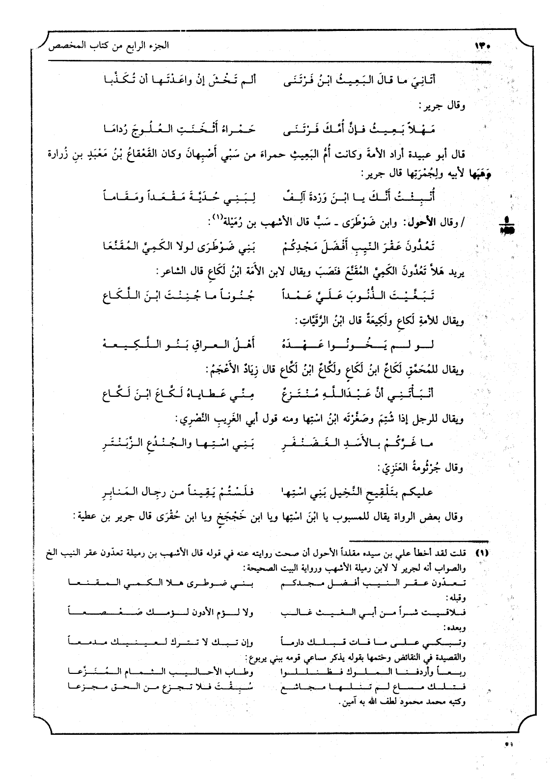 أتانيَ مَا قالَ البَعيثُ ابْن فَرْتَنى ألم تَخشَ إنْ واعَدْتَها أَن تُكَذَّبا وَقَالَ جرير: مَهْلاً بَعيثُ فإنَّ أُمَّكَ فَرْتَنى حَمراءُ أَثْخَنَتِ العُلوجَ رُداما قَالَ أَبُو عُبَيْدة: أَرَادَ الْأمة، وَكَانَت أُمُّ البَعيثِ حمراءَ من سَبْي أصْبهان وَكَانَ القَعْقاع بن مَعْبَد بنِ زُرارة وَهبها لِأَبِيهِ ولجُمْرَتها، قَالَ جرير: أُنْبِئْتُ أَنَّكَ يَا ابْن وَرْدَةَ آلِفٌ لبَني حُدَيَّةَ مَقْعَداً ومَقاما وَقَالَ الْأَحول: وابْن ضَوْطَرى: سَبٌّ. قَالَ الْأَشْهب بن رُمَيْلة: تَعُدُّونَ عَقْرَ النّيبِ أفْضَلَ مَجْدِكُمْ بَني ضَوْطَرى لَوْلَا الكَمِيِّ المُقَنَّعا يُرِيد: هَلاّ تَعُدّون الكَميَّ المُقَنَّع، فنَصَب، وَيُقَال لابْن الأَمَة: ابْن لَكاع، قَالَ الشّاعر: تَبَغَّيْتَ الذُّنوبَ عَلَيَّ عَمْداً جُنوناً مَا جُنِنْتَ ابْن اللَّكاع وَيُقَال للأَمَة: لَكاع ولَكِيعَة، قَالَ ابْن الرّقَيَّات: لَو لم يَخونوا عَهْدَهُ أَهْلُ العراقِ بَنو اللَّكِيعَهْ وَيُقَال للحُمَّق: لَكاع ابْن لَكاع، ولَكَّاع ابْن لَكَّاع، قَالَ زِيَاد الْأَعْجَم: أَنْبَأَتْني أنَّ عبد الله مُنْتَزَعٌ مِنّي عَطاياهُ لَكَّاع ابْن لَكَّاع وَيُقَال للرجل إِذا شُتِم وصَغَّرتَهُ: ابْن اسْتِها، وَمِنْه قَول أبي الْغَرِيب النّصْرِي: مَا غَرَّكُمْ بالأسَدِ الغَضَنْفَرِ بَني استِها والجُنْدُعِ الزّبَنْتَرِ وَقَالَ جُرثومةُ العَنَزي: عَلَيْكُم بتَلْقيحِ النّخيلِ بَني استِها فلستُمْ يَقيناً من رِجالِ المَنابِرِ وَقَالَ بعض الرّواة: يُقَال للمسبوب: يَا ابْن اسْتِها، وَيَا ابْن خَجْعَبخ، وَيَا ابْن حُقْرَى، قَالَ جرير بن عَطِيَّة: