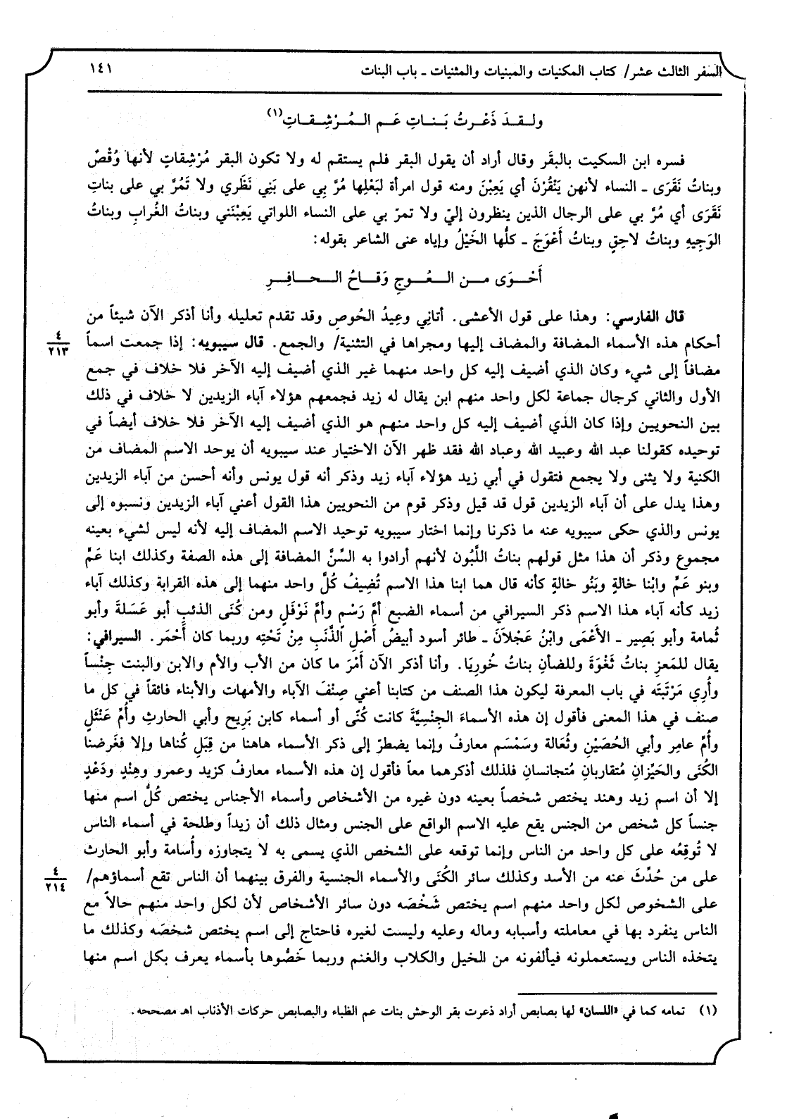 وَلَقَد ذَعَرْتُ بَنَاتِ عَم المُرْشِقاتِ فسره ابْن السّكيت بالبقر، وَقَالَ: أَرَادَ أَن يَقُول الْبَقر فَلم يستقم لَهُ، وَلَا تكون الْبَقر مُرْشِقات لِأَنَّهَا وُقْص، وبَنَات نَقَرى: النّساء، لِأَنَّهُنَّ يَنْقُرْنَ: أَي يَعِبْنَ، وَمِنْه قَول امْرَأَة لبَعْلِها: مُرَّ بِي على بَني نَظَرن، وَلَا تَمُرَّ بِي على بَنَات نَقَرى: أَي مُرّ بِي على الرّجال الَّذِي ينظرُونَ إليّ وَلَا تمرّ بِي على النّساء اللواتي يعِبْنَني، وبَنَات الغُراب، وبَنَات الوَجيه، وبَنَات لاحِق، وبَنَات أَعْوَج: كلُّها الخَيْل، وإياه عَنى الشّاعر بقوله: أَحْوى من العُوجِ وَقاحُ الحافِرِ قَالَ الْفَارِسِي: وَهَذَا على قَول الْأَعْشَى: أَتَانِي وعِيد الحُوص وَقد تقدَّم تَعْلِيله، وَأَنا أذكر الْآن شَيْئا من أَحْكَام هَذِه الْأَسْمَاء المضافة والمضاف إِلَيْهَا ومجراها فِي التّثنية وَالْجمع، قَالَ سِيبَوَيْهٍ: إِذا جمعت اسْما مُضَافا إِلَى شَيْء وَكَانَ الَّذِي أضيف إِلَيْهِ كل وَاحِد مِنْهُمَا غير الَّذِي أضيف إِلَيْهِ الآخر فَلَا خلاف فِي جمع الأول والثّاني كرجال جمَاعَة لكل وَاحِد مِنْهُم ابْن يُقَال لَهُ زيد فَجَمعهُمْ هَؤُلَاءِ آبَاء الزّيدين لَا خلاف فِي ذَلِك بَين النّحويين وَإِذا كَانَ الَّذِي أضيف إِلَيْهِ كل وَاحِد مِنْهُم هُوَ الَّذِي أضيف إِلَيْهِ الآخر فَلَا خلاف أَيْضا فِي توحيده كَقَوْلِنَا عبد الله وَعبيد الله وَعباد الله فقد ظهر الْآن الِاخْتِيَار عِنْد سِيبَوَيْهٍ أَن يوحد الِاسْم الْمُضَاف من الكنية وَلَا يثنى وَلَا يجمع فَتَقول فِي أبي زيد هَؤُلَاءِ آبَاء زيد، وَذكر أَنه قَول يُونُس وَأَنه أحسن من آبَاء الزّيدين وَهَذَا يدل على أَن آبَاء الزّيدين قَول قد قيل وَذكر قوم من النّحويين هَذَا القَوْل أَعنِي آبَاء الزّيدين ونسبوه إِلَى يُونُس وَالَّذِي حكى سِيبَوَيْهٍ عَنهُ مَا ذكرنَا وَإِنَّمَا اخْتَار سِيبَوَيْهٍ تَوْحِيد الِاسْم الْمُضَاف إِلَيْهِ لِأَنَّهُ لَيْسَ لشَيْء بِعَيْنِه مَجْمُوع وَذكر أَن هَذَا مثل قَوْلهم بناتُ اللّبُون لأَنهم أَرَادوا بِهِ السّنَّ المضافة إِلَى هَذِه الصّفة وَكَذَلِكَ ابْنا عمٍّ وابنا خَالَة وبَنو خَالَة، كَأَنَّهُ قَالَ هما ابْنا هَذَا الِاسْم تُضيف كل وَاحِد مِنْهُمَا إِلَى هَذِه الْقَرَابَة وَكَذَلِكَ آبَاء زيد وَكَأَنَّهُ آبَاء هَذَا الِاسْم، ذكر السّيرافي من أَسمَاء الضّبع أمَّ رَسْم، وأمَّ نَوْفَل، وَمن كُنى الذِّئْب أَبُو عَسَلَة، وَأَبُو ثُمامة وَأَبُو بَصير: الْأَعْمَى، وَابْن عَجلان: طَائِر أسود أبيضُ أصلِ الذّنَب من تَحْتَهُ وَرُبمَا كَانَ أَحْمَر. السّيرافي: يُقَال للمعَز: بَنَات نَغْوَة وللضأن: بَنَات خُورِيا. وَأَنا أذكر الْآن أمرَ مَا كَانَ من الْأَب وَالأُم وَالِابْن وَالْبِنْت جِنْساً وأُري مَرتَبَته فِي بَاب الْمعرفَة ليَكُون هَذَا الصِّنْف من كتَابنَا أَعنِي صنف الإِباء والأمهات وَالْأَبْنَاء فائقاً فِي كل مَا صنف فِي هَذَا الْمَعْنى فَأَقُول: إِن هَذِه أَسمَاء الجِنْسِيَّة كَانَت كُنىً أَو أَسمَاء كَابْن بَريح وَأبي الْحَارِث وأمِّ عَنْثَل وأمِّ عامِر وَأبي الحُصَيْن وثُعالَة وسَمْسَم معارف وَإِنَّمَا يضْطَر إِلَى ذكر الْأَسْمَاء هَهُنَا من قِبَل كناها وَإِلَّا فغرضنا الكُنى والحَيِّزان مُتقاربان مُتجانسان فَلذَلِك أذكرهما مَعًا فَأَقُول إِن هَذِه الْأَسْمَاء معارف كزيد وَعَمْرو وهِنْد ودَعْد إلاّ أَن اسْم زيد وَهِنْد يخْتَص شخصا بِعَيْنِه دون غَيره من الْأَشْخَاص وَأَسْمَاء الْأَجْنَاس يخْتَص كلُّ اسْم مِنْهَا جِنْسا كل شخص من الْجِنْس يَقع عَلَيْهِ الِاسْم الْوَاقِع على الْجِنْس، وَمِثَال ذَلِك أَن زيدا وَطَلْحَة فِي أَسمَاء النّاس لَا تُوقِعُه على كل وَاحِد من النّاس وَإِنَّمَا توقعه على الشّخص الَّذِي يُسمى بِهِ لَا يتجاوزه وَأُسَامَة وَأَبُو الْحَ
