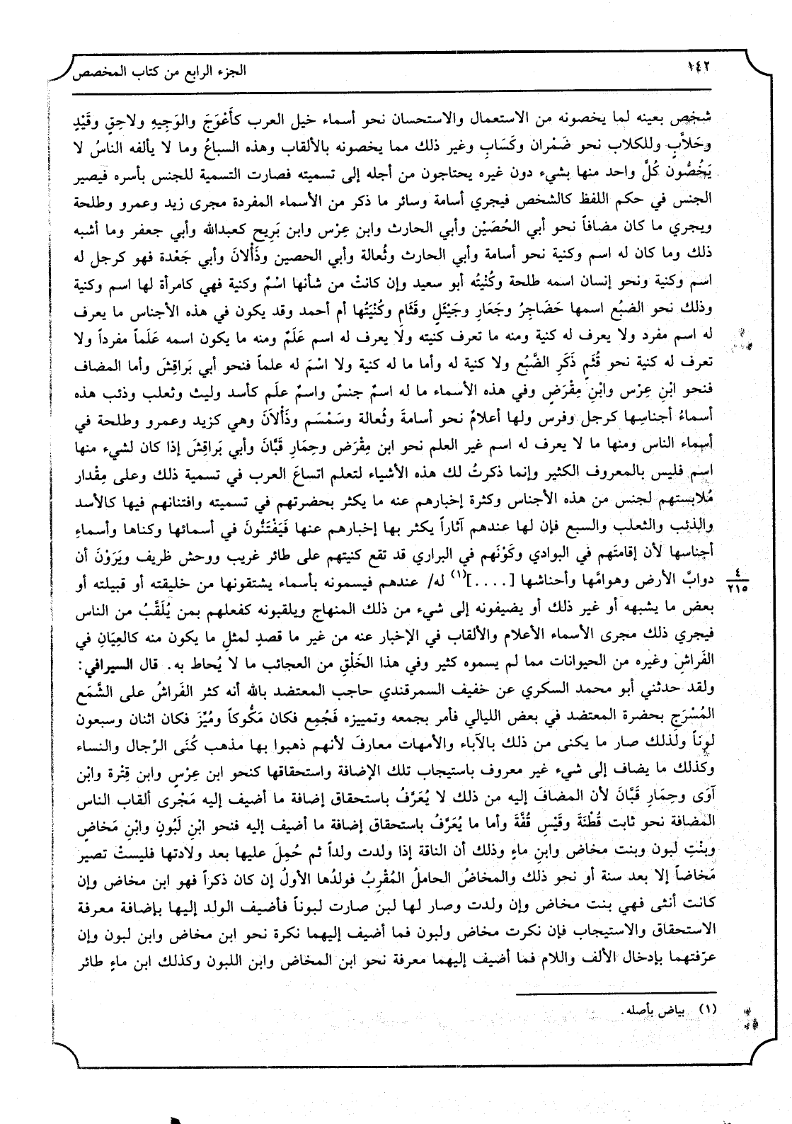 شخص بِعَيْنِه لما يخصونه من الِاسْتِعْمَال وَالِاسْتِحْسَان نَحْو أَسمَاء خيل الْعَرَب كأَعْوَج والوَجيه ولاحِق وقَيْد وحَلاَّب وللكلاب نَحْو ضَمْران وكَسَاب وَغير ذَلِك مِمَّا يخصونه بِالْأَلْقَابِ وَهَذِه السّباع وَمَا لَا يألفه النّاس لَا يخُصُّون كلَّ وَاحِد مِنْهَا بِشَيْء دون غَيره يَحْتَاجُونَ من أَجله إِلَى تَسْمِيَته فَصَارَت التّسمية للْجِنْس بأسره فَيصير الْجِنْس فِي حكم اللَّفْظ كالشّخص فَيجْرِي أُسَامَة وَسَائِر مَا ذكر من الْأَسْمَاء المفردة مجْرى زيد وَعَمْرو وَطَلْحَة وَيجْرِي مَا كَانَ مُضَافا نَحْو أبي الحُصَيْن وَأبي الْحَارِث وَابْن عِرْس وَابْن بَريح كَعبد الله وَأبي جَعْفَر وَمَا أشبه ذَلِك وَمَا كَانَ لَهُ اسْم وكنية نَحْو أُسَامَة وَأبي الْحَارِث وثُعالة وَأبي الْحصين وذَأْلان وَأبي جَعْدَة فَهُوَ كَرجل لَهُ اسْم وكنية وَنَحْو إِنْسَان اسْمه طَلْحَة وكُنيَتُه أَبُو سعيد وَإِن كَانَت من شَأْنهَا اسْم وكنية فَهِيَ كامرأة لَهَا اسْم وكنية وَذَلِكَ نَحْو الضّبع اسْمهَا حَضاجِر وجَعار وجَيْئَل وقَثام وكُنيتها أم أَحْمد وَقد يكون فِي هَذِه الْأَجْنَاس مَا يعرف لَهُ اسْم مُفْرد وَلَا يعرف لَهُ كنية وَمِنْه مَا تعرف كنيته وَلَا يعرف لَهُ اسْم عَلَم وَمِنْه مَا يكون اسْمه عَلَماً مُفردا وَلَا تعرف لَهُ كنية نَحْو قُثَم ذَكَر الضّبُع وَلَا كنية لَهُ وَأما مَا لَهُ كنية وَلَا اسْم لَهُ علما فنحو أبي بَراقِش وَأما الْمُضَاف فنحو ابنِ عِرْس وابنِ مِقْرَض وَفِي هَذِه الأَسماء مَا لَهُ اسمٌ جنسٌ واسمٌ علم كأسد وَلَيْث وثعلب وذئب هَذِه أَسمَاء أجناسها كَرجل وَفرس وَلها أَعْلَام نَحْو أُسَامَة وثُعالة وسَمْسَم وذَأْلان وَهِي كزيد وَعَمْرو وَطَلْحَة فِي أَسمَاء النّاس وَمِنْهَا مَا يعرف لَهُ اسْم غير الْعلم نَحْو ابْن مِقْرَض وحِمار قَبَّان وَأبي بَراقِش إِذا كَانَ لشَيْء مِنْهَا اسْم فَلَيْسَ بِالْمَعْرُوفِ الْكثير وَإِنَّمَا ذكرتُ لَك هَذِه الْأَشْيَاء لتعلم اتساع الْعَرَب فِي تَسْمِيَة ذَلِك وعَلى مِقدار مُلابستهم لجنس من هَذِه الْأَجْنَاس وَكَثْرَة إخبارهم عَنهُ مَا يكثر بحضرتهم فِي تَسْمِيَته وافتنانهم فِيهَا كالأسد وَالذِّئْب والثّعلب والسّبع فَإِن لَهَا عِنْدهم آثاراً يكثر بهَا إخبارهم عَنْهَا فَيَفْتَنُّونَ فِي أسمائها وكناها وَأَسْمَاء أجناسها لِأَن إقامتهم فِي الْبَوَادِي وكَونهم فِي البراري قد تقع كنيتهم على طَائِر غَرِيب ووحش ظريف ويرَوْن أَن دوابَّ الأَرْض وهوامَّها وأحناشها لَهُ عِنْدهم فيسمونه بأسماء يشتقونها من خليقته أَو قبيلته أَو بعض مَا يُشبههُ أَو غير ذَلِك أَو يضيفونه إِلَى شَيْء من ذَلِك الْمِنْهَاج ويلقبونه كفعلهم بِمن يُلَقَّب من النّاس فَيجْرِي ذَلِك مجْرى الْأَسْمَاء والأعلام والألقاب فِي الإِخبار عَنهُ من غير مَا قصد لمثل مَا يكون مِنْهُ كالعِيانِ فِي الفَراش وَغَيره من الْحَيَوَانَات مِمَّا لم يسموه كثير وَفِي هَذَا الخَلْق من الْعَجَائِب مَا لَا يُحاط بِهِ. قَالَ السّيرافي: وَلَقَد حَدثنِي أَبُو مُحَمَّد السّكري عَن خَفِيف السّمرقندي حَاجِب المعتضد بِاللَّه أَنه كثر الفَراشُ على الشّمْع المُسْرَج بِحَضْرَة المعتضد فِي بعض اللَّيَالِي فَأمر بجمعه وتمييزه فجُمِع فَكَانَ مَكُّوكاً ومُيِّز فَكَانَ اثْنَان وَسَبْعُونَ لوناً وَلذَلِك صَار مَا يكنى من ذَلِك بِالْآبَاءِ والأمهات معارف لأَنهم ذَهَبُوا بهَا مَذْهَب كُنى الرّجال والنّساء وَكَذَلِكَ مَا يُضَاف إِلَى شَيْء غير مَعْرُوف باستيجاب تِلْكَ الإِضافة واستحقاقها كنحو ابْن عِرْس وَابْن قِتْرة وَابْن آوى وحِمار قَبَّان لِأَن الْمُضَاف إِلَيْهِ من ذَلِك لَا يُعَرًّف بِاسْتِحْقَاق إِضَافَة مَا أضيف إِلَيْهِ فنحو ابْن لَبون وَابْن مَخاض وبنتِ لبون وَبنت مَخَاض وَابْن مَاء وَذَلِكَ أَن النّاقة إِذا ولدت ول