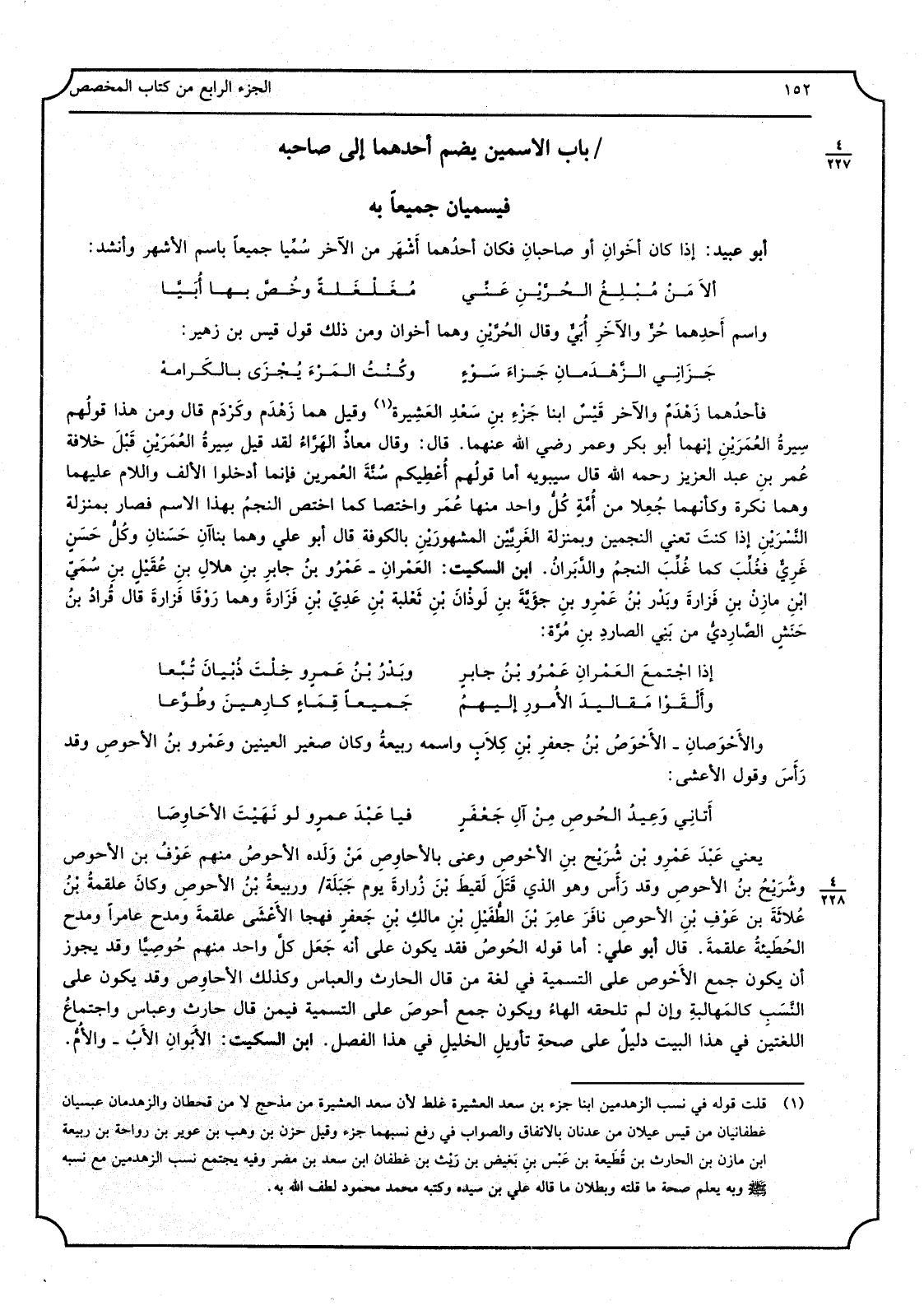 أَبُو عُبَيْد: إِذا كَانَ أخَوان أَو صاحبان فَكَانَ أحدُهما أَشْهَر من الآخر سُمِّيا جَمِيعًا باسم الْأَشْهر، وأنْشَد: أَلا من مُبْلِغُ الحُرَّيْنِ عَنِّي مُغَلْغَلَةً وخُصَّ بهَا أَبِيَّا وَاسم أَحدهمَا حُرّ وَالْآخر أُبَيّ وَقَالَ الحُرَّيْن وهما أخَوان، وَمن ذَلِك قَول قيس بن زُهَيْر جَزاني الزّهْدمانِ جَزاءَ سَوْءٍ وكُنتُ المَرْءَ يُجْزى بالكَرامهْ فأحدهما زَهْدَم وَالْآخر قَيْس ابْنا جَزْء بن سَعد العَشيرة، وَقيل هما زَهْدَم وكَرْدَم قَالَ وَمن هَذَا قَوْلهم سِيرة العُمَرَيْن إنَّهُمَا أَبُو بكر وَعمر رَضِي الله عَنْهُمَا، قَالَ: وَقَالَ معاذٌ الهَرَّاء لقد قيل سِيرة العُمَرَيْن قبلَ خِلافة عمر بن عبد الْعَزِيز رَحمَه الله، قَالَ سِيبَوَيْهٍ: أما قَوْلهم أُعطيكم سُنَّة العُمرين فَإِنَّمَا أدخلُوا الْألف وَاللَّام عَلَيْهِمَا وهما نكرَة وكأنهما جُعِلا من أُمَّةٍ كلُّ وَاحِد مِنْهَا عمر واختصا كَمَا اختصَّ النّجم بِهَذَا الِاسْم فَصَارَ بِمَنْزِلَة النّسْرَيْ إِذا كُنتَ تَعْنِي النّجمين وبمنزلة الغَرِيَّيْن المشهورَيْن بِالْكُوفَةِ، وَقَالَ أَبُو عَليّ: وهما بناآن حَسنان وكلُّ حَسَنٍ غَرِيٌّ فغُلِّبَ النّجم والدّبَران. ابْن السّكيت: العَمْران: عَمرو بن جابِر بن هِلال بن عُقَيْل بنِ سُمَيّ بنِ مَازِن بن فَزارة وبَدْر بن عَمرو بن جِؤَيَّة بن لَوْذان بن ثَعْلَبَة بن عَدِيّ بن فَزارة وهما رَوْقا فَزارة، قَالَ قُراد بن حَنَشٍ الصَّارِديُّ من بني الصَّادِر بن مُرَّة: إِذا اجتمعَ العَمْرانِ عَمرو بن جابِرٍ وبَدْرُ بنُ عَمروٍ خِلْتَ ذُبْيانَ تُبَّعا وأَلْقَوا مَقاليدَ الْأُمُور إليهمُ جَميعاً قَماءً كارِهينَ وطُوَّعا والأَحْوَصان: الأَحْوَص بن جَعْفَر بن كِلاب، واسْمه رَبيعة وَكَانَ صَغِير الْعَينَيْنِ، وعَمرو بن الأَحوص وَقد رَأَس، وَقَول الْأَعْشَى: أَتاني وَعيدُ الحُوصِ من آلِ جَعفرٍ فيا عَبْدَ عَمروٍ لَو نَهَيْتَ الأَحاوِصا يَعْنِي عَبْدَ عَمرو بن شُرَيْح بن الأَحوَص، وعنى بالأحاوِص مَنْ وَلَده الأَحوَص مِنْهُم: عَوْف بن الأَحوص، وشُرَيْح بن الأَحْوَص وَقد رأَس وَهُوَ الَّذِي قتل لَقيط بن زُرارة يَوْم جَبَلَة، وَرَبِيعَة بن الأَحوص، وَكَانَ عَلْقَمَة بن عُلاثَة بن عَوف بن الأَحْوَص نافَر عامِرَ بن الطّفَيْل بن مَالك بن جَعْفَر فهجا الْأَعْشَى عَلْقَمَة ومدح عَامِرًا ومدح الحُطَيْئة عَلْقَمَة. قَالَ أَبُو عَليّ: أما قَوْله الحُوص فقد يكون على انه جعل كلَّ وَاحِد مِنْهُم حُوصِيَّاً وَقد يجوز أَن يكون جمع الأَحْوَص على التّسمية فِي لُغَة من قَالَ الْحَارِث وَالْعَبَّاس وَكَذَلِكَ الأَحاوِص وَقد يكون على النّسَب كالمَهالِبة وَإِن لم تلْحقهُ الْهَاء، وَيكون جمع أحوص على التّسمية فِيمَن قَالَ حَارِث وعباس واجتماع اللغتين فِي هَذَا الْبَيْت دَلِيل على صِحَة تَأْوِيل الْخَلِيل فِي هَذَا الْفَصْل. ابْن السّكيت: الأَبَوان: الْأَب وَالأُم.