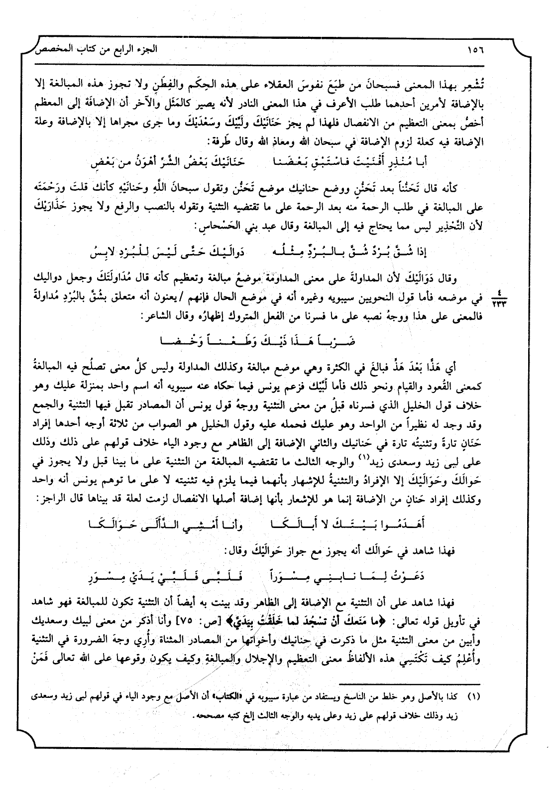 تُشْعِر بِهَذَا الْمَعْنى فسبحان من طَبَع نفوس الْعُقَلَاء على هَذِه الحِكَم والفِطَن، وَلَا تجوز هَذِه الْمُبَالغَة إلاّ بِالْإِضَافَة لأمرين أَحدهمَا طلب الأعرف فِي هَذَا الْمَعْنى النّادر لِأَنَّهُ يصير كالمَثَل وَالْآخر أَن الإِضافةَ إِلَى المعظَّم أخَصُّ بِمَعْنى التّعظيم من الِانْفِصَال فَلهَذَا لم يجز حَنانَيكَ ولبَّيْكَ وسَعديك وَمَا جرى مَجراها إلاّ بِالْإِضَافَة، وعلّة الإِضافة فِيهِ كعلّة لُزُوم الإِضافة فِي سُبْحَانَ الله ومَعاذ الله وَقَالَ طَرفة: أَبَا مُنْذِرٍ أَفْنَيْتَ فاسْتَبْقِ بَعْضَنا حَنانَيْكَ بعضُ الشّرِّ أَهْوَنُ من بَعْضِ كَأَنَّهُ قَالَ تَحَنُّناً بعد تَحَنُّنٍ وَوضع حنانيك مَوْضِع تحنُّن وَتقول سُبْحَانَ الله وحَنانَيه كَأَنَّك قلتَ ورَحْمَتَه على الْمُبَالغَة فِي طلب الرّحمة مِنْهُ بعد الرّحمة على مَا تَقْتَضِيه التّثنية وتقوله بالنّصب وَالرَّفْع وَلَا يجوز حَذارَيْكَ لِأَن التّحذير لَيْسَ مِمَّا يحْتَاج فِيهِ إِلَى الْمُبَالغَة وَقَالَ عبد بني الحَسْحاس: إِذا شُقَّ بُرْدٌ شُقَّ بالبُرْدِ مِثلُه دَوالَيْكَ حتَّى لَيْسَ للبُرْدِ لابِسُ وَقَالَ دَوالَيكَ لِأَن المداولة على معنى المُداومَة مَوْضِع مُبَالغَة وتعظيم كَأَنَّهُ قَالَ مُداوَلَتَكَ وَجعل دوالَيك فِي مَوْضِعه، فَأَما قَول النّحويين سِيبَوَيْهٍ وَغَيره أَنه فِي مَوْضِع الْحَال فَإِنَّهُم يعنون أَنه متعلِّق بشُقَّ بالبُرْدِ مُداوَلةً فَالْمَعْنى على هَذَا ووجهُ نَصبه على مَا فسَّرنا من الْفِعْل الْمَتْرُوك إِظْهَاره وَقَالَ الشّاعر: ضَرْباً هَذَاذَيْكَ وطَعْناً وخْضا أَي هَذّاً بعد هَذٍّ فَبَالغ فِي الْكَثْرَة وَهِي مَوْضِع مُبَالغَة وَكَذَلِكَ المداولة وَلَيْسَ كلُّ معنى تصلح فِيهِ المُبالغةُ كمعنى القُعود وَالْقِيَام وَنَحْو ذَلِك، فَأَما لبيْك فَزعم يُونُس فِيمَا حَكَاهُ عَنهُ سِيبَوَيْهٍ أَنه اسْم وَاحِد بِمَنْزِلَة عَلَيْك وَهُوَ خلاف قَول الْخَلِيل الَّذِي فسرناه قبلُ من معنى التّثنية، وَوجه قَول يُونُس أَن المصادر تقبل فِيهَا التّثنية وَالْجمع وَقد وجد لَهُ نظيراً من الْوَاحِد وَهُوَ عَلَيْك فَحَمله عَلَيْهِ، وَقَول الْخَلِيل هُوَ الصَّوَاب من ثَلَاثَة أوجه أَحدهَا إِفْرَاد حَنانٍ تَارَة وتثنيته تَارَة فِي حَنانَيك، والثّاني الإِضافة إِلَى الظّاهر مَعَ وجود الْيَاء خلاف قَوْلهم على ذَلِك وَذَلِكَ على لبّى زيد وسعدى زيد، وَالْوَجْه الثّالثّ مَا تَقْتَضِيه الْمُبَالغَة من التّثنية على مَا بيَّنَّا قبل، وَلَا يجوز فِي حَوالَكَ وحَوالَيْكَ إلاّ الإِفراد والتّثنية للإشهار بِأَنَّهُمَا فِيمَا يلْزم فِيهِ تثنيته لَا على مَا توهّم يُونُس أنّه وَاحِد، وَكَذَلِكَ إِفْرَاد حَنانٍ من الإِضافة إِنَّمَا هُوَ للإشعار بِأَنَّهَا إِضَافَة أَصْلهَا الِانْفِصَال لَزِمت لعِلَة قد بينَّاها قَالَ الرّاجز: أَهَدَموا بيْتَكَ لَا أَبَا لَكا وَأَنا أَمْشي الدّأَلَى حَوالَكا فَهَذَا شَاهد فِي حَوالك أَنه يجوز مَعَ جَوَاز حَوالَيكَ وَقَالَ: دَعَوْتُ لِما نابني مِسْوَراً فَلَبَّى فَلَبَّيْ يَدَيْ مِسْوَرِ فَهَذَا شَاهد على أَن التّثنية مَعَ الإِضافة إِلَى الظّاهر وَقد بيّنت بِهِ أَيْضا أَن التّثنية تكون للْمُبَالَغَة فَهُوَ شَاهد فِي تَأْوِيل قَوْله تَعَالَى: (مَا مَنَعَكَ أنْ تَسْجُدَ لِما خَلَقْتُ بِيَدَيَّ) وَأَنا أذكر من معنى لبيْك وَسَعْديك وَأبين من معنى التّثنية مثل مَا ذكرت فِي حنانيك وَأَخَوَاتهَا من المصادر الْمُثَنَّاة وأُري وجهَ الضّرورة فِي التّثنية وأُعلِم كَيفَ تكتسي هَذِه الأَلِفاظ معنى التّعظيم والإجلال وَالْمُبَالغَة وَكَيف يكون وُقُوعهَا على الله تَعَالَى فَمَن