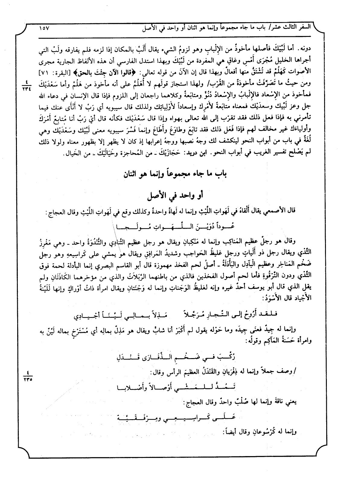 قَالَ الْأَصْمَعِي يُقَال: ألْقاهُ فِي لَهَواتِ اللَّيْثِ وَإِنَّمَا لَهُ لَهاةٌ واحِدَةٌ، وَكَذَلِكَ وَقع فِي لَهَوات اللَّيثِ، وَقَالَ العجاج: عُوداً دُوَيْنَ اللَّهَوات مُولَجاً وَقَالَ: هُوَ رجلٌ عَظِيم المناكب وَإِنَّمَا لَهُ مَنكِبانِ، وَيُقَال: هُوَ رجلٌ عَظِيم الثّنادي، والثّنْدُوَةُ: وَاحِد وَهِي مَغْرِزُ الثّدي، وَيُقَال: رجلٌ ذُو أَلَيَاتٍ وَرجل غليظ الحواجب وشديد المرافِق، وَيُقَال هُوَ يمشي على كَراسيعِه وَهُوَ رجل ضخم المناخِر وعظيم البآدِلِ، والبأدَلَةُ: أصل لحم الْفَخْذ مَهْمُوزَة، قَالَ أَبُو الْقَاسِم الْبَصْرِيّ: إِنَّمَا البأدلة لحْمَة فَوق الثّدي وَدون التّرقوة، فَأَما لحم أصُول الفخذين فَالَّذِي من باطنهما لَّرَبَلاتُ وَالَّذِي من مؤَخَّرهما الكاذَتانِ وَلم يقل الَّذِي قَالَ أَبُو يُوسُف أحدٌ غَيره، وَإنَّهُ لغليظُ الوَجَناتِ وَإِنَّمَا لَهُ وَجْنتان، وَيُقَال: امرأةٌ ذاتُ أوراكٍ وإنَّها لليِّنَةُ الأَجياد، قَالَ الْأسود: فَلَقَد أََرُوحُ إِلَى التّجارِ مُرَجَّلاً مَذِلاً بِمَالي لَيِّناً أجيادي وَإِنَّمَا لَهُ جيدٌ فعنَى جِيدَه وَمَا حوله يَقُول لم أكْبَرْ أَنا شابٌّ، وَيُقَال هُوَ مُذِلٌّ بمالِه أَي مُسْتَرْخٍ بِمَالِه ليِّنٌ بِهِ، وَامْرَأَة حَسَنةُ المآكم وَقَوله: رُكِّبَ فِي ضَخْمِ الذَّفارَى قَنْدَلِ وصف جملا وَإِنَّمَا لَهُ ذِفْرَيانِ والقَنْدَلُ الْعَظِيم الرّأس وَقَالَ: تَمُدُّ للمَشْيِ أوصالاً وأصلابا يَعْنِي نَاقَة وَإِنَّمَا لَهَا صُلْبٌ واحدٌ وَقَالَ العجاج: على كَراسيعي ومِرْفَقَيَّهْ وَإِنَّمَا لَهُ كُرْسوعان وَقَالَ أَيْضا: