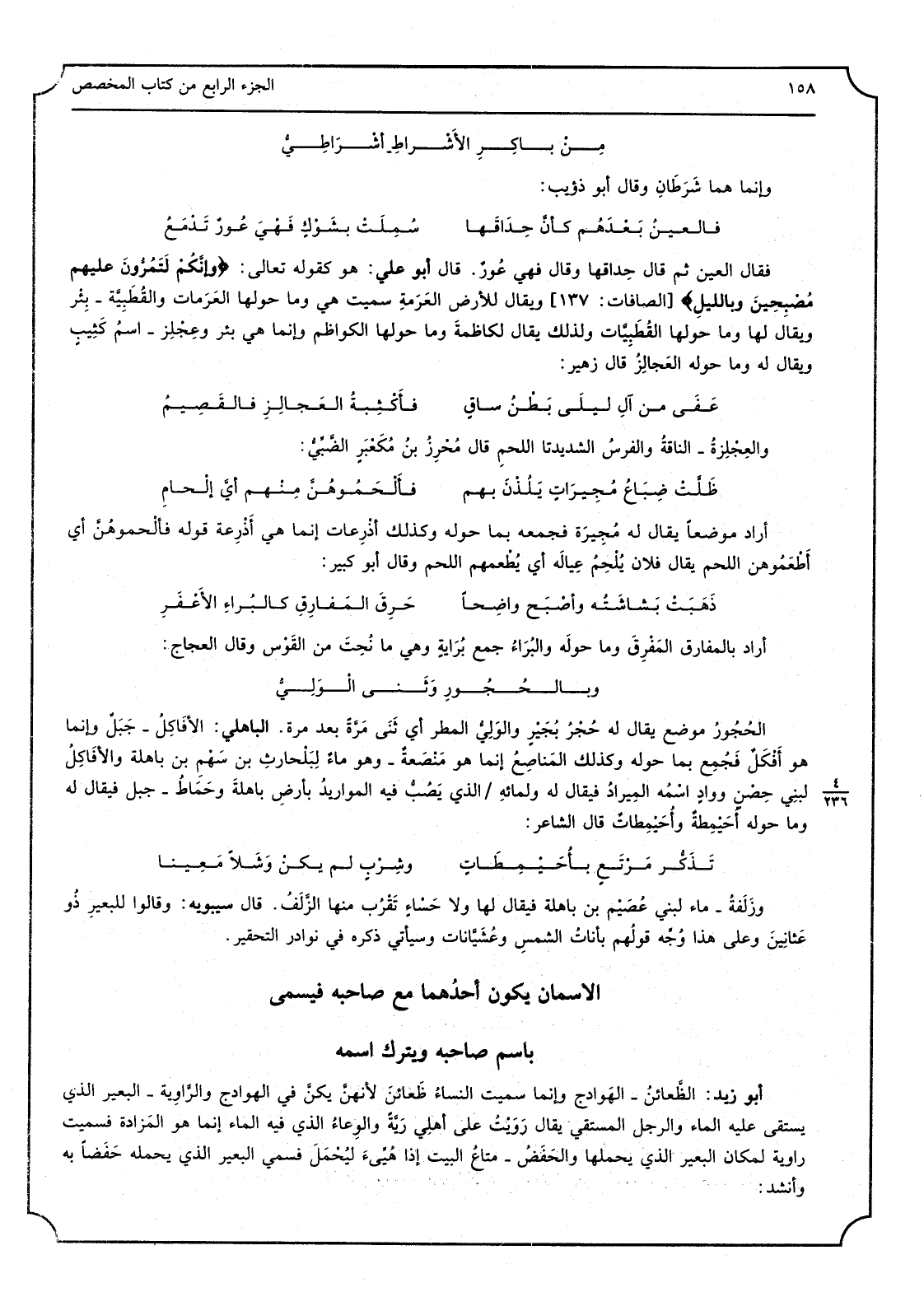 من باكِر الأَشْراط أشْراطِيُّ وَإِنَّمَا هما شَرْطان وَقَالَ أَبُو ذُؤَيْب: فالعينُ بَعْدَهُم كأنَّ حَداقَها سُمِلَتْ بِشَوْكٍ فَهْيَ عُورٌ تَدْمَعُ فَقَالَ الْعين ثمَّ قَالَ حِداقها، وَقَالَ فَهِيَ عُورٌ. قَالَ أَبُو عَليّ: هُوَ كَقَوْلِه تَعَالَى: (وَإنَّكُمْ لَتَمُرُّونَ عليهِم مُصْبِحينَ وباللَّيل) ، وَيُقَال للْأَرْض العرَمَة سميت وَمَا حولهَا العَرَمات، والقُطَبِيَّة: بِئْر وَيُقَال لَهَا وَمَا حولهَا القُطَبِيَّات، وَلذَلِك يُقَال لكاظِمَةَ وَمَا حولهَا الكواظم وَإِنَّمَا هِيَ بِئْر، وعِجْلِز: اسْم كثيب وَيُقَال لَهُ وَمَا حوله: العَجالِزُ قَالَ زُهَيْر: عفى من آلِ ليلى بَطْنُ ساقٍ فأَكْثِبةُ العَجالِز فالقَصيمِ والعِجْلِزَةُ: النّاقة وَالْفرس الشّديدتا اللَّحْم، قَالَ مُحرِزُ بنُ مُكَعْبَرٍ الضّبِّيُّ: ظَلَّتْ ضِباعُ مُجيراتٍ يَلُذْنَ بهم فألحَموهُنَّ مِنْهُم أيَّ إلْحام أَرَادَ موضعا يُقَال لَهُ مجيرَة فَجَمعه بِمَا حوله، وَكَذَلِكَ أَذْرِعات إِنَّمَا هِيَ أذرعة، قَوْله فألحموهنَّ أَي أطعموهن اللَّحْم، يُقَال فلَان يُلْحِمُ عِياله: أَي يُطعمهُمْ اللَّحْم، وَقَالَ أَبُو كَبِير: ذهبَتْ بَشاشتُهُ وأصبحَ واضِحاً حَرِقَ المَفارِقِ كالبُراء الأَعفَرِ أَرَادَ بالمفارق: المَفرِقَ وَمَا حوله، والبُراءُ: جمع بُرايَةٍ وَهِي مَا نُحِتَ من القَوس، وَقَالَ العجاج: وبالحُجورِ وَثَنى الوَلِيُّ الحُجورُ مَوْضِع يُقَال لَهُ: حُجْرُ بُجَيْرٍ، والوليُّ: الْمَطَر، أَي ثنى مرَّةً بعد مرَّة. الْبَاهِلِيّ: الأَفاكِلُ: جبَلٌ وَإِنَّمَا هُوَ أفْكَلٌ فجُمِع بِمَا حوله، وَكَذَلِكَ المناصِعُ إِنَّمَا هُوَ مَنْصَعةٌ: وَهُوَ ماءٌ لِبَلْحارِث بن سهْمِ بنِ باهِلَة، والأفاكلُ لبني حِصْنٍ ووادِ اسْمه المِيرادُ فَيُقَال لَهُ ولمائه الَّذِي يصُبُّ فِيهِ المَواريد بِأَرْض باهلة، وحَماطُ: جبل فَيُقَال لَهُ وَمَا حوله أُحَيْمِطَةُ وأُحَيمِطاتٌ قَالَ الشّاعر: تَذَكُّرُ مَرْتَعٍ بأُحَيْمِطاتٍ وشِرْبٍ لم يكن وَشَلاً مَعينا وزَلَفَةٌ: مَاء لبني عُصَيْم بن باهلة فَيُقَال لَهَا ولأحساءٍ تَقْرُب مِنْهَا الزّلَفُ. قَالَ سِيبَوَيْهٍ: وَقَالُوا للبعير ذُو عَثانِينَ وعَلى هَذَا وُجِّهَ قَوْلهم باناتُ الشّمس وعُشَيّانات وَسَيَأْتِي ذكره فِي نَوَادِر التّحقير.