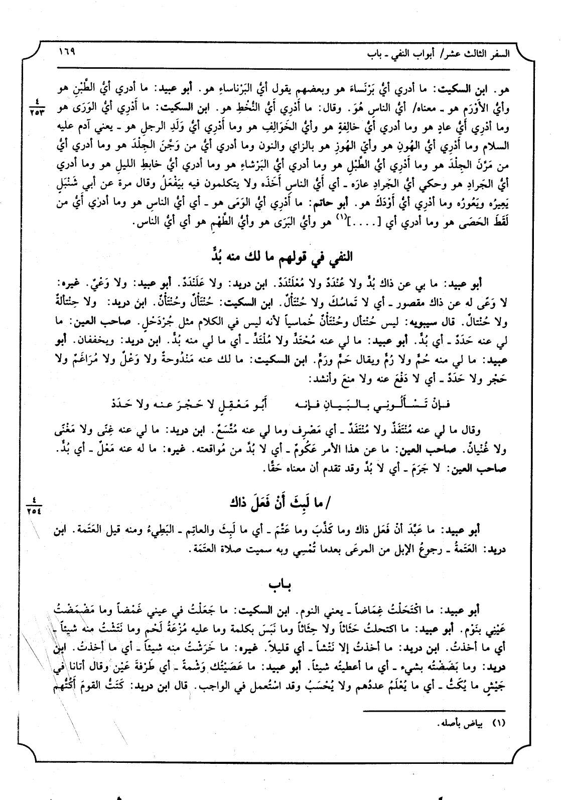 أَبُو عُبَيْد: مَا بِي عَن ذاكَ بُدٌّ وَلَا عُنْدَدٌ وَلَا مُعْلَنْدَدٌ. ابْن دُرَيْد: وَلَا عَلَنْدَدٌ. أَبُو عُبَيْد: وَلَا وَعْيٌ. غَيره: لَا وعي لَهُ عَن ذَاك مَقْصُور أَي لَا تماسُكَ وَلَا حُنْتَألٌ. ابْن السّكيت: حُنْتَألٌ وحُنْتَأْنٌ. ابْن دُرَيْد: وَلَا حِنْتَأْلَةٌ وَلَا حُنْتالٌ. قَالَ سِيبَوَيْهٍ: لَيْسَ حُنتأل وحُنتأنٌ خُماسيّاً لِأَنَّهُ لَيْسَ فِي الْكَلَام مثل جُرْدَحْلٍ. صَاحب الْعين: مَالِي عَنهُ حَدَدٌ: أَي بُدٌّ. أَبُو عُبَيْد: مَالِي عَنهُ مُحْتَدٌّ وَلَا مُلْتَدٌّ: أَي مَالِي مِنْهُ بدّ. ابْن دُرَيْد: ويخففان. أَبُو عُبَيْد: مَالِي مِنْهُ حُمٌّ وَلَا رُمٌّ وَيُقَال حَمٌّ ورَمٌّ. ابْن السّكيت: مَالك عَنهُ مَنْدوحَةٌ وَلَا وَعْلٌ وَلَا مُراغَمٌ وَلَا حجْرٌ وَلَا حَدَدٌ: أَي لَا دفع عَنهُ وَلَا منع وأنْشَد: فَإِن تَسْأَلُونِي بِالْبَيَانِ فإنَّه أَبُو مَعْقِلٍ لَا حجْرَ عَنهُ وَلَا حَدَدْ وَقَالَ مَالِي عَنهُ مُنْتَفَذٌ وَلَا منتَفَدٌ: أَي مَصرِف وَمَالِي عَنهُ مُتَّسَعٌ. ابْن دُرَيْد: مَالِي عَنهُ غِنىً وَلَا مَغنىً وَلَا غُنْيانٌ. صَاحب الْعين: مَا عَن هَذَا الْأَمر عَكومٌ: أَي لابدَّ من مُواقَعته. غَيره: مَاله عَنهُ مَعْلٌ: أَي بُدٌّ. صَاحب الْعين: لَا جَرَمَ: أَي لَا بدَّ وَقد تقدم أَن مَعْنَاهُ حَقّاً.
