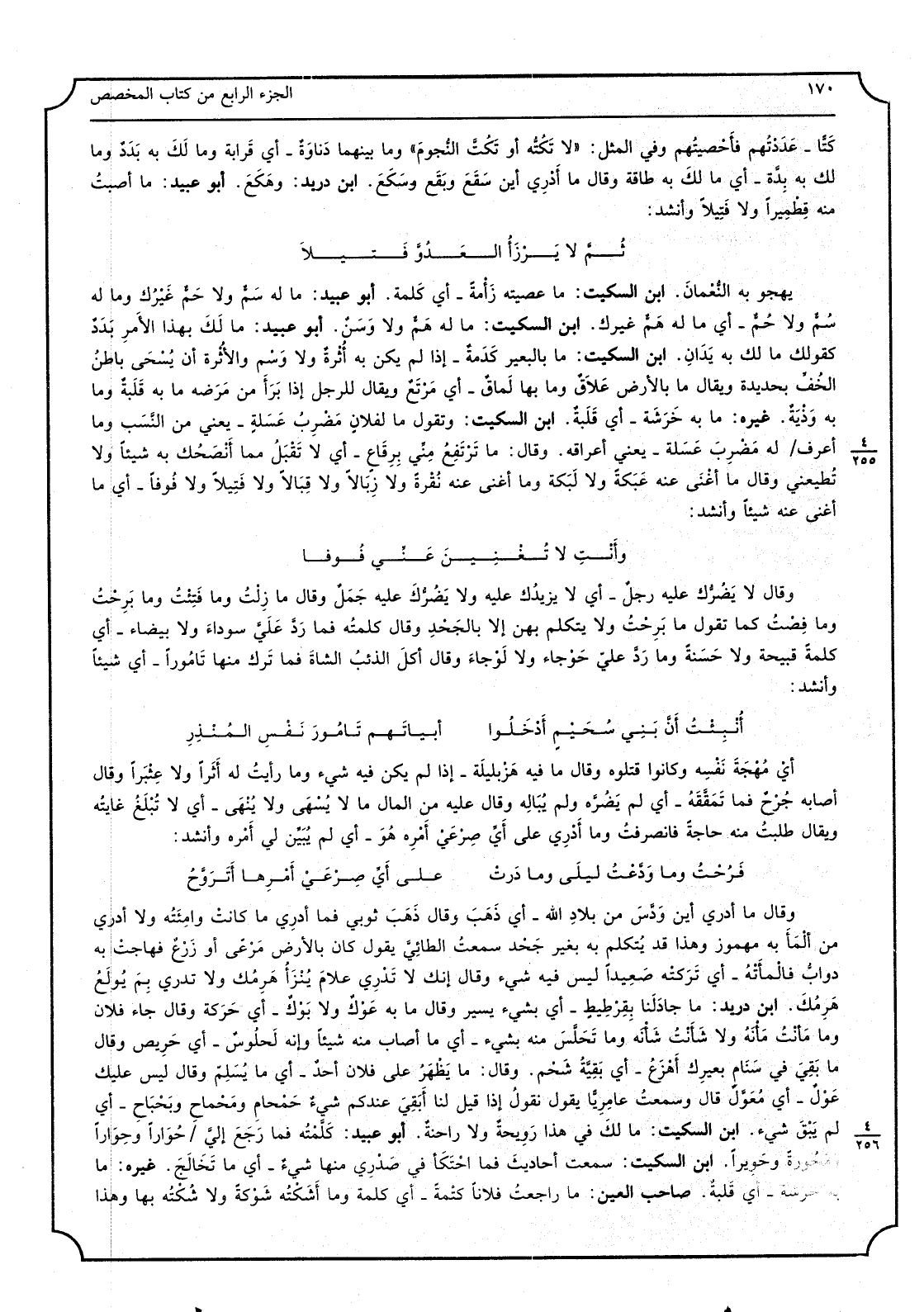 كَتَّاً: عدَدْتُهم فأَحْصَيتُهم، وَفِي الْمثل: لَا تَكُتُّه أَو تَكُتَّ النّجومَ. وَمَا بَينهمَا دَناوَة: أَي قَرابة. وَمَا لَك بِهِ بَدَدٌ وَمَا لَك بِهِ بِدَّة: أَي مَا لَك بِهِ طَاقَة، وَقَالَ: مَا أَدْرِي أَيْن سَقَع وبَقَع وسَكَع. ابْن دُرَيْد: وهَكَع. أَبُو عُبَيْد: مَا أصبتُ مِنْهُ قِطْميراً وَلَا فَتيلاً، وأنْشَد: ثُمَّ لَا يَرْزَأُ العَدُوَّ فَتيلا يهجو بِهِ النّعْمان. ابْن السّكيت: مَا عصيته زَأْمَةً: أَي كَلمة. أَبُو عُبَيْد: مَا لَهُ سَمٌّ وَلَا حَمٌّ غيرُك، وَمَا لَهُ سُمٌّ وَلَا حُمٌّ: أَي مَا لَهُ هَمٌّ غَيْرك. ابْن السّكيت: مَا لَهُ هَمٌّ وَلَا وَسَن. أَبُو عُبَيْد: مَا لَك بِهَذَا الْأَمر بَدَدٌ كَقَوْلِك مَا لَك بِهِ يَدان. ابْن السّكيت: مَا بالبعير كَدَمَة: إِذا لم يكن بِهِ أُثْرَة وَلَا وَسْم والأُثْرَة أَن يُسحى بَاطِن الخُفِّ بحديدة، وَيُقَال مَا بِالْأَرْضِ عَلاق وَمَا بهَا لَماق: أَي مَرْتَع، وَيُقَال للرجل إِذا برأَ من مَرضه مَا بِهِ قَلَبَة وَمَا بِهِ وَذْيَة. غَيره: مَا بِهِ خَرَشَة: أَي قَلَبةٌ. ابْن السّكيت: وَتقول مَا لفُلَان مَضْرِب عَسَلة: يَعْنِي من النّسَب، وَمَا أعرف لَهُ مَضْرِب عَسَلَة: يَعْنِي أعراقه. وَقَالَ: مَا تَرْتَقِع منّي بِرِقاع: أَي لَا تَقبَلُ مِمَّا أَنْصَحُكَ بِهِ شَيْئا وَلَا تُطيعني، وَقَالَ: مَا أَغْنى عَنهُ عَبَكَةً وَلَا لَبَكَةً وَمَا أغْنى عَنهُ نُقْرَةً وَلَا زِبالاً وَلَا قِبالاً وَلَا فَتيلاً وَلَا فُوفاً: أَي مَا أغْنى عَنهُ شَيْئا، وأنْشَد: وأَنْتِ لَا تُغنينَ عَنّي فُوفا وَقَالَ: لَا يَضُرُّك عَلَيْهِ رجلٌ: أَي لَا يزيدك عَلَيْهِ، وَلَا يَضُرُّكَ عَلَيْهِ جَمَل، وَقَالَ: مَا زِلتُ وَمَا فَتِئْتُ وَمَا بَرِحْتُ وَمَا فِصْتُ كَمَا تَقول مَا بَرِحْتُ وَلَا يتَكَلَّم بِهن إلاّ بالجَحْد، وَقَالَ: كَلمته فَمَا رَدَّ عَليَّ سوداءَ وَلَا بَيْضَاء: أَي كلمة قبيحة وَلَا حَسَنة، وَمَا ردَّ عليّ حَوْجاء وَلَا لَوْجاء، وَقَالَ: أكل الذئبُ الشّاةَ فَمَا ترك مِنْهَا تاموراً: أَي شَيْئا. وأنْشَد: أُنْبِئتُ أنَّ سُحَيْمٍ أَدْخَلوا أبياتهم تامورَ نَفْسِ المُنْذِرِ أَي مُهْجَة نفسِه وَكَانُوا قَتَلُوهُ، وَقَالَ: مَا فِيهِ هَزْبَليلَة: إِذا لم يكن فِيهِ شَيْء وَمَا رَأَيْت لَهُ أَثَراً وَلَا عِثْبَراً، وَقَالَ: أَصَابَهُ جُرْحٌ فَمَا تَمَقَّقَه: أَي لم يَضُرَّه وَلم يُباله. وَقَالَ: عَلَيْهِ من المَال مَا لَا يُسْهى وَلَا يُنْهى: أَي لَا تُبْلَغ غَايَته. وَيُقَال: طلبتُ مِنْهُ حَاجَة فانصرفتُ وَمَا أَدْرِي على أَيِّ صِرْعَيْ أمرِهِ هُوَ: أَي لم يُبَيِّن لي أمره، وأنْشَد: فَرُحْتُ وَمَا وَدَّعْتُ ليلى وَمَا دَرتْ على أيِّ صِرْعَيْ أَمْرِها أَتَرَوَّحُ وَقَالَ: مَا أَدْرِي أَيْن وَدَّس من بِلَاد الله: أَي ذهب، وَقَالَ: ذهب ثوبي فَمَا أَدْرِي مَا كانتْ وامِئَتُه وَلَا أَدْرِي من أَلْمأ بِهِ مَهْمُوز وَهَذَا قد يُتكلم بِهِ بِغَيْر جَحْد سَمِعت الطّائي يَقُول كَانَ بِالْأَرْضِ مَرْعى أَو زَرْع فهاجتْ بِهِ دوابٌّ فأَلْمَأَتْه: أَي ترَكَتْهُ صَعيداً لَيْسَ فِيهِ شَيْء، وَقَالَ: إِنَّك لَا تَدْرِي علامَ يُنْزَأُ هَرْمك وَلَا تَدْرِي بمَ يُولَعُ هَرِمك. ابْن دُرَيْد: مَا جادلنا بقِرْطيط: أَي بِشَيْء يسير، وَقَالَ: مَا بِهِ عَوْكٌ وَلَا بَوْك: أَي حَرَكَة، وَقَالَ: جَاءَ فلَان وَمَا مَأْنْتُ مَأْنَه وَلَا شَأْنْتُ شَأْنه وَمَا تَحَلَّسَ مِنْهُ بِشَيْء: أَي مَا أصَاب مِنْهُ شَيْئا وَإنَّهُ لحَلوس: أَي حَريص وَقَالَ: مَا بَقِي فِي سَنامِ بَعيرِكَ أَهْزَع: أَي بَقيَّة شَحْم. وَقَالَ: مَا يَظهرُ على فلَان أحدٌ: أَي مَا يُسَلِّمُ، وَقَالَ: لَيْسَ عَلَيْك عَوْل: أَي مُعَوَّل، قَالَ: وسمعتُ عامرِيَّاً يَقُول: نقُول إِذا قيل لنا أَبَقِيَ عنْدكُمْ شَيْء حَمحام ومَحْماح وبَحْباح: أَي لم يبْق شَيْء. ابْن
