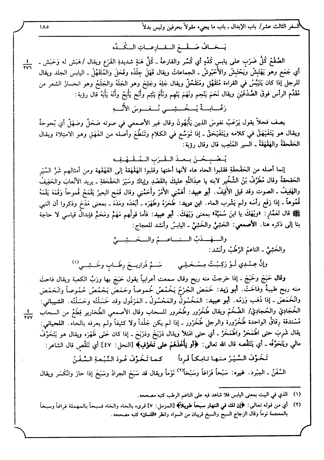 يَخافُ صَقْعَ القارِعاتِ الكُدَّه الصَّقْع: كلُّ ضَرْبٍ على يَابِس كُدَّهٍ أَي كُسَّر، والمقارعة: كلُّ هَنةٍ شَدِيدَة القَرْع وَيُقَال هَبَشَ لَهُ وَحَبَش: أَي جَمَعَ، وَهُوَ يَهْتَبِش ويَحْتَبِش، والأُحْبوش: الْجَمَاعَات، وَيُقَال قَهَلَ جِلده وَقَحَل، والمُتَقَهِّل: الْيَابِس الْجلد، وَيُقَال للرجل إِذا كَانَ يَتَيَبَّس فِي الْقِرَاءَة مُتَقَهِّل ومُتَقَحِّل، وَيُقَال جَلِهَ وجَلِحَ وَهُوَ الجَلَه والجَلَح وَهُوَ انحسار الشّعر من مُقدَّم الرّأس فَوق الصَّدْغَيْن، وَيُقَال نَحَمَ يَنْحِم وَنَهَم ينْهِم وَأَنَح يأْنِح وَأَنَه يأْنِه، قَالَ رؤبة: رَعَّابَةٌ يُخْشِي نفوسَ الأُنَّهِ يصف فحلاً يَقُول: يَرْعَبُ نفوسَ الَّذين يأْنِهون، وَقَالَ غير الْأَصْمَعِي: فِي صَوته صَحَلٌ وصَهَلٌ أَي بُحوحة، وَيُقَال هُوَ يَتَفَيْهَق فِي كَلَامه ويَتَفَيْحَق: إِذا توسَّع فِي الْكَلَام وتَنَطَّع وَأَصله من الفَهَقِ وَهُوَ الامتلاء، وَيُقَال الحَقْحَقَة والهَقْهَقَة: السّير المُتعِب، قَالَ: وَقَالَ رؤبة: يُصْبِحْنَ بعدَ القَرَبِ المُقَهْقِه إِنَّمَا أَصله من الحَقْحَقَة فقلبوا الْحَاء هَاء لِأَنَّهَا أُخْتهَا وقلبوا الهَقْهَقَة إِلَى الهَقْهَقَة، وَمن أمثالهم: شَرُّ السّيْرِ الحَقْحَقَة، وَقَالَ مُطَرِّفُ بن الشّخِّيْر لِابْنِهِ: يَا عبد الله عليكَ بالقَصْدِ وإياكَ وسَيْرَ الحَقْحَقَة: يُرِيد الأتعاب، والحَفيف والهَفيف: الصَّوْت، وَقد قيل الأَفيف. أَبُو عُبَيْد: أَهَمَّني الْأَمر وأَحَمَّني، وَقَالَ: قَمَحَ البعيرُ يقْمَحُ قُموحاً وَقَمَهَ يقْمَهُ قُموهاً: إِذا رَفَعَ رَأسه وَلم يشرب المَاء. ابْن دُرَيْد: طَحَرَه وَطَهَرهُ: أَبْعَده، وَمَدَهَ بِمَعْنى مَدَحَ وَذكروا أَن النّبي صلّى الله عَلَيْهِ وسلّم قَالَ لعمّار: (وَيْهَكَ يَا ابنَ يُمَيَّة) بِمَعْنى وَيْحَك. أَبُو عُبَيْد: فَأَما قَوْلهم مَهَمٌّ ومَحَمٌ فإبدال قياسي لَا حَاجَة بِنَا إِلَى ذكره هُنَا. الْأَصْمَعِي: الحَشِيُّ والخَشِيّ: الْيَابِس، وَأنْشد للعجاج: والهَدَبُ النّاعمُ والحَشِيُّ والخَشِيُّ: النّاعم الرّطْب، وأنْشَد: وإنَّ عِنْدي لَوْ رَكِبْتَ مِسْحَلي سَمَّ ذَراريحَ رِطابٍ وخَشِي وَقَالَ: حَبَجَ وَخَبَجَ: إِذا خرجتْ مِنْهُ ريح، وَقَالَ: سَمِعت أَعْرَابِيًا يَقُول حَبَجَ بهَا ورَبِّ الْكَعْبَة، وَيُقَال فاحتْ مِنْهُ ريحٌ طيبَة وفاخَتْ. أَبُو زيد: خَمَصَ الجُرْح يخْمُص خُموصاً وَحَمَصَ يحْمُص حُموصاً، وانْحَمَص وانْخَمَص: إِذا ذَهَبَ وَرَمُه. أَبُو عُبَيْد: المَخْسول والمَحْسول: المَرْذول، وَقد خَسَلْتُه وحَسَلْتُه. الشّيباني: الخُجادِيّ والحُجادي: الضّخم. وَيُقَال: طُخْرور وطُحْرور للسحاب، وَقَالَ الْأَصْمَعِي: الطّخارير: قِطَع من السّحاب مُسْتدقة رِقاق، الْوَاحِدَة طُخْرورة، وَالرجل طُخْرور: إِذا لم يكن جَلْداً وَلَا كثيفاً وَلم يعرف بِالْحَاء. اللحياني: يُقَال: شَرِبَ حَتَّى اطْمَعَرَّ واطْمَخَرَّ: أَي حَتَّى امْتَلَأَ، وَيُقَال: دَرْبَخ ودَرْبَح: إِذا كَانَ حَنى ظَهره، وَيُقَال: هُوَ يَتَخَوَّف مَالِي ويَتَحَوَّفُه: أَي يَتَنَقَّصُه، قَالَ الله تَعَالَى: (أَو يأْخُذَهُمْ على تَخَوُّفٍ) أَي تَنَقُّص، قَالَ الشّاعر: تَخَوَّفَ السّيْرُ مِنْهَا تامِكاً فَرِداً كَمَا تَخَوَّفَ عُودَ النّبْعَةِ السّفَنُ السّفَن: المِبْرَد. غَيره: سَبْحاً فراغاً وسَبْخاً نوماً وَيُقَال: قد سَبَحَ الْجَرَاد وَسَبَخَ إِذا حَار وانْكسر، وَيُقَال:
