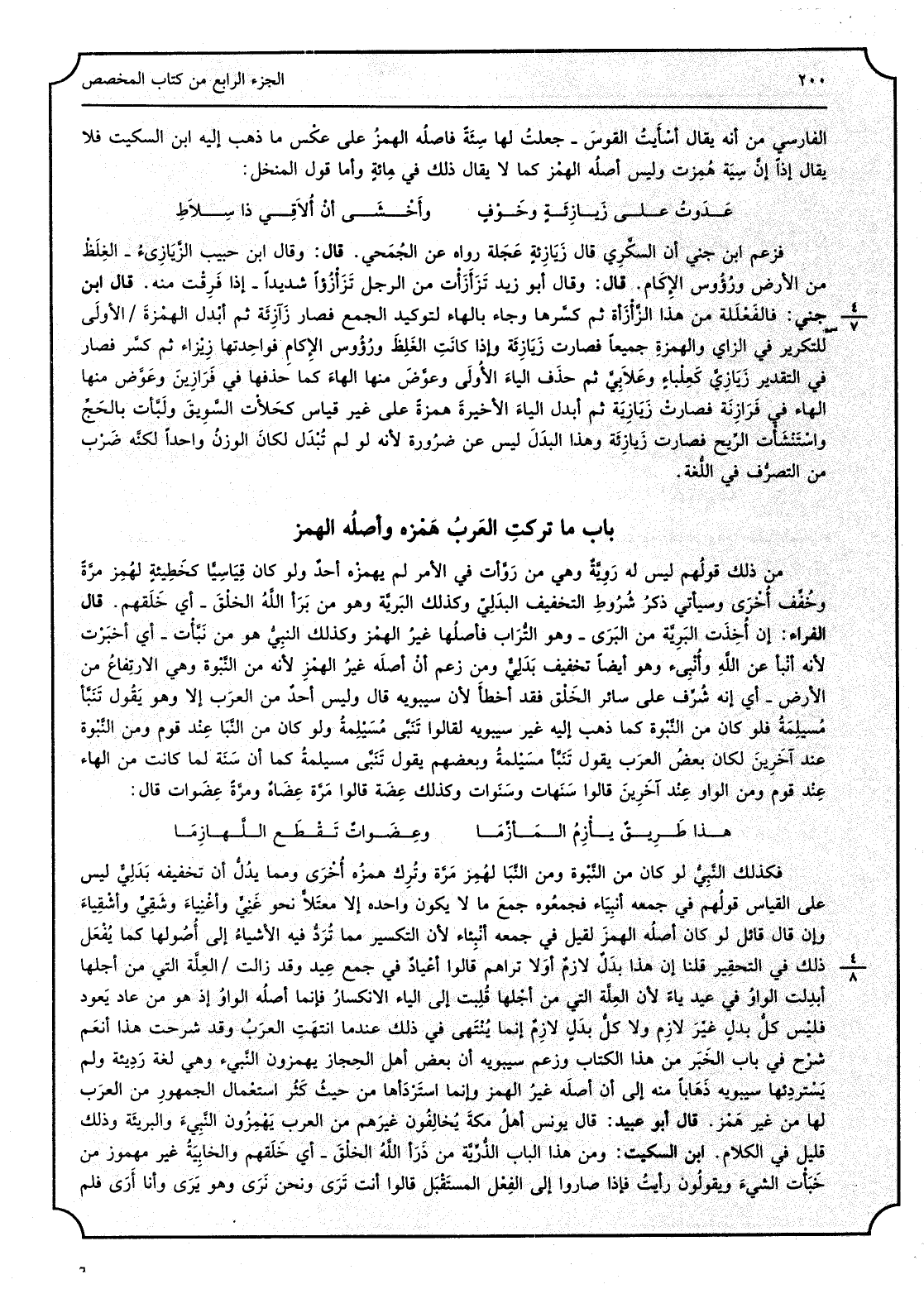 من ذَلِك قَوْلهم لَيْسَ لَهُ رَوِيَّةٌ وَهِي من روَّأت فِي الْأَمر لم يهمزْهُ أحدٌ، وَلَو كَانَ قياسيّاً كخطيئةٍ لهُمِزَ مرَّةً وخُفِّف أُخْرَى، وَسَيَأْتِي ذكر شُرُوط التَّخْفِيف البدَليِّ وَكَذَلِكَ البرِيَّة وَهُوَ من يَرأ الله الخَلْقَ: أَي خلقهمْ. قَالَ الْفراء: إِن أُخِذَت البرِيَّةُ من البَرَى: وَهُوَ التُّرَاب فأصلها غير الْهَمْز، وَكَذَلِكَ النبيُّ وَهُوَ من نبَّأت: أَي أخْبرت لِأَنَّهُ أنبأ عَن الله وأُنبئ وَهُوَ أَيْضا تَخْفيف بدَلِيٌّ، وَمن زعم أَن أَصله غير الْهَمْز لِأَنَّهُ من النَّبْوَة وَهِي الِارْتفَاع من الأَرْض: أَي أَنه شُرِّفَ على سَائِر الخَلق فقد أَخطَأ، لِأَن سِيبَوَيْهٍ قَالَ وَلَيْسَ أحد من الْعَرَب إِلَّا وَهُوَ يَقُول تنبّأ مُسيلمةُ فَلَو كَانَ من النَّبوة كَمَا ذهب إِلَيْهِ غير سِيبَوَيْهٍ لقالوا تَنَبَّى مُسَيْلمَة، وَلَو كَانَ من النَّبأ عِنْد قوم وَمن النَّبوة عِنْد آخَرين لَكَانَ بعض الْعَرَب يَقُول تنبّأ مُسَيْلمَة وَبَعْضهمْ يَقُول تنبّى مُسَيْلمَة، كَمَا أَن سَنَة لما كَانَت من الْهَاء عِنْد قوم وَمن الْوَاو عِنْد آخَرين قَالُوا: سَنَهات وسنوات، وَكَذَلِكَ عِضَة قَالُوا مرَّة عِضاهٌ ومرّة عِضَوات قَالَ: هَذَا طريقٌ يأزِمُ المَأَزِما وعِضَواتٌ تَقطعُ اللهازِما فَكَذَلِك النَّبيُّ لَو كَانَ من النَّبْوة وَمن النّبأ لهُمز مرّة وتُرِكَ همزُهُ أُخْرَى، وَمِمَّا يدل أَن تخفيفه بدلي لَيْسَ على الْقيَاس قَوْلهم فِي جمعه أَنْبيَاء فجمعوه جمع مَا لَا يكون واحده إلاّ مُعْتلاًّ نَحْو غنِيٍ وأغنياءً وشقِيٍّ وأشقياءً وَإِن قَالَ قَائِل لَو كَانَ اصله الهمزَ لقيل فِي جمعه أَنْبِئاء لِأَن التكسير مِمَّا تُرَدُّ فِيهِ الْأَشْيَاء إِلَى أُصُولهَا كَمَا يُفعَل ذَلِك فِي التحقير، قُلْنَا إِن هَذَا بدلٌ لازمٌ أوَلا تراهم قَالُوا أعيادٌ فِي جمع عيد وَقد زَالَت العِلَّة الَّتِي من أجلهَا أبدلت الْوَاو فِي عيدٍ يَاء لِأَن العلَّة الَّتِي من أجلهَا قلبت إِلَى الْيَاء الانكسار فَإِنَّمَا أَصله الْوَاو إِذْ هُوَ من عادَ يعودُ فَلَيْسَ كلُّ بدَلٍ غيرَ لازمٍ وَلَا كلُّ بدل لازمٌ إِنَّمَا يُنتَهى فِي ذَلِك عِنْدَمَا انْتَهَت الْعَرَب، وَقد شرحت هَذَا أنعَمَ شرح فِي بَاب الخَبَر من هَذَا الْكتاب، وَزعم سِيبَوَيْهٍ أَن بعض أهل الْحجاز يهمزون النَّبِئ وَهِي لُغَة رَدِيئَة وَلم يستردئها سِيبَوَيْهٍ ذَهَابًا مِنْهُ إِلَى أَن أَصله غير الْهَمْز وَإِنَّمَا استردأها من حَيْثُ كثُرَ اسْتِعْمَال الْجُمْهُور من الْعَرَب لَهَا من غير همز. قَالَ أَبُو عبيد: قَالَ يُونُس أهل مَكَّة يخالفون غَيرهم من الْعَرَب يهمزون النَّبِئَ والبريئَة وَذَلِكَ قَلِيل فِي الْكَلَام. ابْن السّكيت: وَمن هَذَا الْبَاب الذرِّيَّة من ذَرأ الله الخَلقَ: أَي خلَقَهم، والخابيةُ غير مَهْمُوز من خبَأْت الشيءَ وَيَقُولُونَ رأيتُ فَإِذا صَارُوا إِلَى الْفِعْل المستقبَل قَالُوا أَنْت ترى وَنحن نَرى وَهُوَ يَرى وَأَنا أرَى فَلم