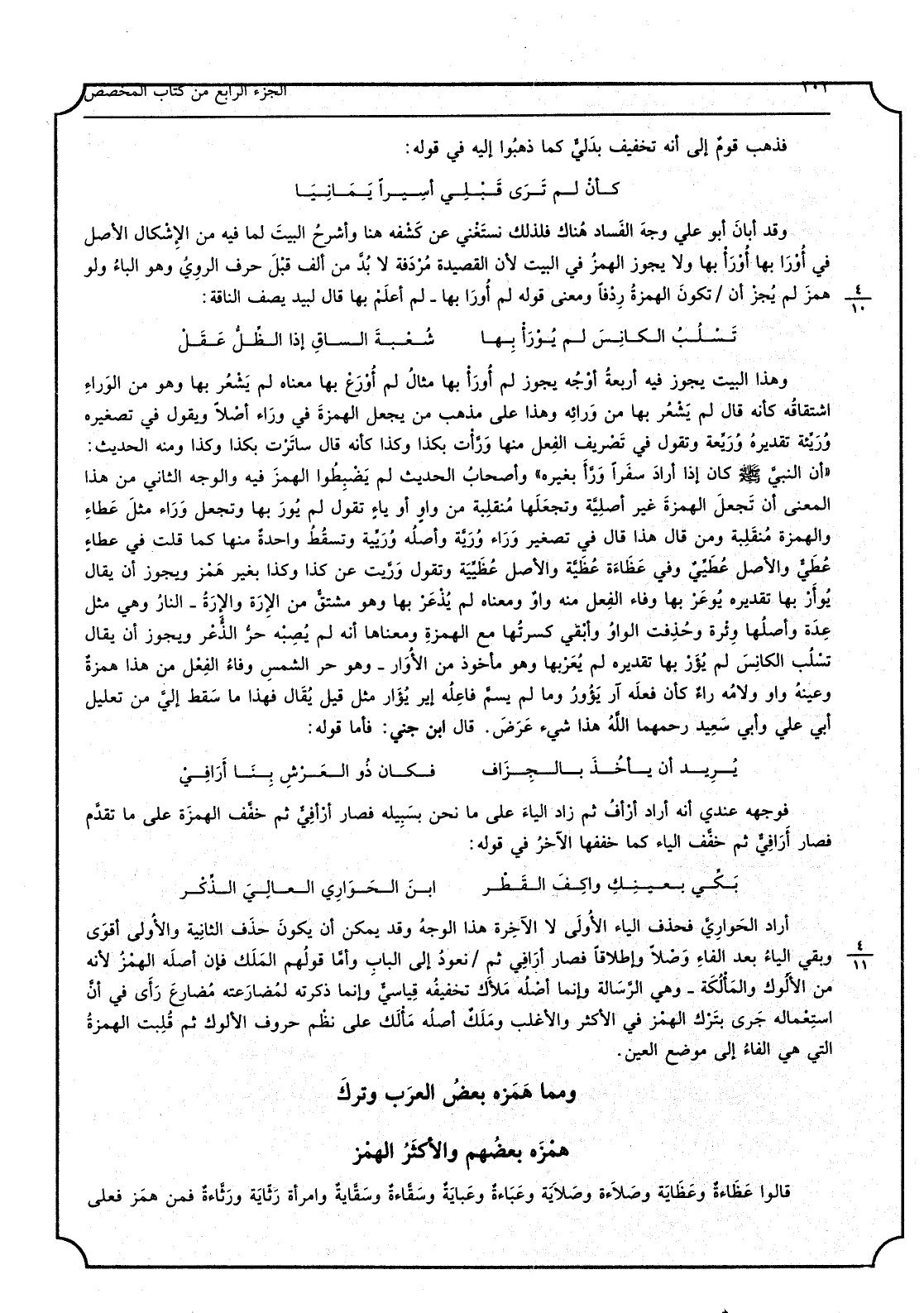 فَذهب قوم إِلَى انه تخفيفٌ بدلِيٌّ كَمَا ذَهَبُوا إِلَيْهِ فِي قَوْله: كأنْ لم تَرَى قبْلي أَسيراً يمَانِيا وَقد أبان أَبُو عَليّ وجهَ الْفساد هُنَاكَ فَلذَلِك نستغني عَن كشفه هُنَا وأشرح الْبَيْت لما فِيهِ من الْإِشْكَال الأَصْل فِي أُوْرا بهَا: أُوْرَاْ بهَا وَلَا يجوز الْهَمْز فِي الْبَيْت لِأَن القصيدة مُرْدَفة لَا بدَّ من ألف قبل حرف الرَّوِيِّ وَهُوَ الْبَاء وَلَو همز لم يجُزْ أَن تكون الْهمزَة رِدْفاً، وَمعنى قَوْله لم أُورا بهَا: لم أعلَمْ بهَا، قَالَ لبيد يصف النَّاقة: تَسْلُبُ الكانِسَ لم يؤْرا بهَا شُعْبَةَ السّاقِ إِذا الظِّلُّ عَقَلْ وَهَذَا الْبَيْت يجوز فِيهِ أَرْبَعَة أوجه، يجوز لم أُورأ بهَا مِثَال لم أُورَعْ بهَا مَعْنَاهُ لم يشْعر بهَا وَهُوَ من الوراءِ اشتقاقه كَأَنَّهُ قَالَ لم يشْعر بهَا من وَرَائه وَهَذَا على مَذْهَب من يَجْعَل الْهمزَة فِي وَرَاء أصلا وَيَقُول فِي تصغيره وُرَيِئّة تَقْدِيره وُرَيِعّة، وَتقول فِي تصريف الْفِعْل مِنْهَا وَرَّأْتْ بِكَذَا وَكَذَا كَأَنَّهُ قَالَ ساتَرْت بِكَذَا وَكَذَا وَمِنْه الحَدِيث: (أَن النبيَّ صلّى الله عَلَيْهِ وسلّم كَانَ إِذا أَرَادَ سفرا ورَّأَ بِغَيْرِهِ) وَأَصْحَاب الحَدِيث لم يضبطوا الْهَمْز فِيهِ، وَالْوَجْه الثَّانِي من هَذَا الْمَعْنى أَن تجعَلَ الهمزةَ غير أصليّة وتجعلها منقلبة من واوٍ أَو ياءٍ تَقول لم يُورَ بهَا وَتجْعَل وراءِ مثلَ عطاءِ والهمزة منقلبة، وَمن قَالَ هَذَا قَالَ فِي تَصْغِير وَراء وُرَيَّة وَأَصله وُرَيِّيَة وَتسقط وَاحِدَة مِنْهَا كَمَا قلت فِي عطاءٍ عُطَيٌّ وَالْأَصْل عُطَيِيٌّ وَفِي عَظاءةَ عُظَيَّة وَالْأَصْل عُظَيِيَّة وَتقول وَرَّيْت عَن كَذَا وَكَذَا بِغَيْر همز وَيجوز أَن يُقَال يوأَرْ بهَا تَقْدِيره يوعَرْ بهَا وَفَاء الْفِعْل مِنْهُ واوٌ وَمَعْنَاهُ لم يُذْعَرْ بهَا وَهُوَ مشتقٌّ من الإرَة والإرَة: النَّار وَهِي مثل عِدَّة وَأَصلهَا وِئْرَة وحذفت الْوَاو وأُبقِي كسرتها مَعَ الْهمزَة وَمَعْنَاهَا أَنه لم يُصبْه حَرُّ الذُّعْر وَيجوز أَن يُقَال تسلب الكانسَ لم يُؤَرْ بهَا تَقْدِيره لم يُعَرْ بهَا وَهُوَ مأخوذٌ من الأُوار: وَهُوَ حَرُّ الشَّمْس وَفَاء الْفِعْل من هَذَا همزَة وعينه أَو لامه راءٌ كَأَن فعله آرَ يَؤورُ وَمَا لم يُسَمَّ فَاعله إيرَ يُؤَار مثل قيل يُقَال فَهَذَا مَا سقط إليَّ من تَعْلِيل أبي عَليّ وَأبي سعيد رحمهمَا الله هَذَا شَيْء عرَضَ. قَالَ ابْن جني: فَأَما قَوْله: يُريدُ أَن يأخُذَ بالجِزاف فكانَ ذُو العَرْشِ بِنَا أَرافي فوجهه عِنْدِي أَنه أَرَادَ أرْأَفُ ثمَّ زَاد الياءَ على مَا نَحن بسبيله فَصَارَ أرْأفِيُّ ثمَّ خفَّف الْهمزَة على مَا تقدم فَصَارَ أرافِيُّ ثمَّ خفف الْيَاء كَمَا خفّفها الآخر فِي قَوْله: بَكِّي بعينِكِ واكِفَ القَطْر ابنَ الحَوارِي العاليَ الذِّكْرِ أَرَادَ الحواريَّ فَحذف الْيَاء الأولى لَا الْآخِرَة هَذَا الْوَجْه وَقد يُمكن أَن يكون حذف الثَّانِيَة وَالْأولَى أقوى وَبَقِي الْيَاء بعد الْفَاء وَصلا وإطلاقهما فَصَارَ أرافي ثمَّ نعود إِلَى الْبَاب وَأما قَوْلهم المَلَك فَإِن أَصله الهمزُ لِأَنَّهُ من الأَلُوك والمألُكَة: وَهِي الرسَالَة وَإِنَّمَا أَصله مَلأَك تخفيفه قياسيّ وَإِنَّمَا ذكرته لمُضارَعته مُضارعَ رَأَى فِي أنَّ اسْتِعْمَاله جَرى بتَرْك الْهَمْز فِي الْأَكْثَر والأغلب، وملَكٌ أَصله مألَك على نظم حُرُوف الأَلوك ثمَّ قلبت الْهمزَة الَّتِي هِيَ الْفَاء إِلَى مَوضِع الْعين.